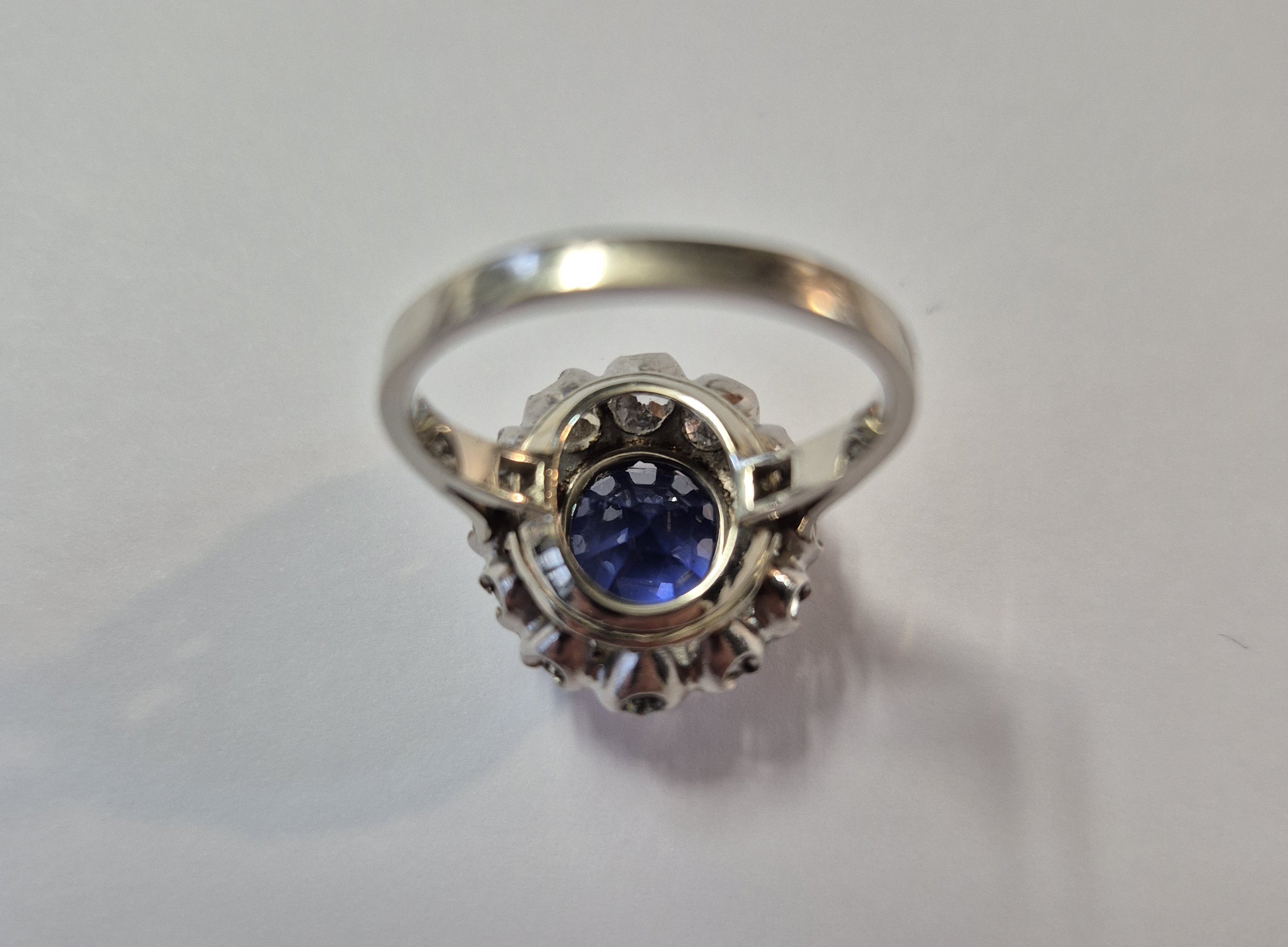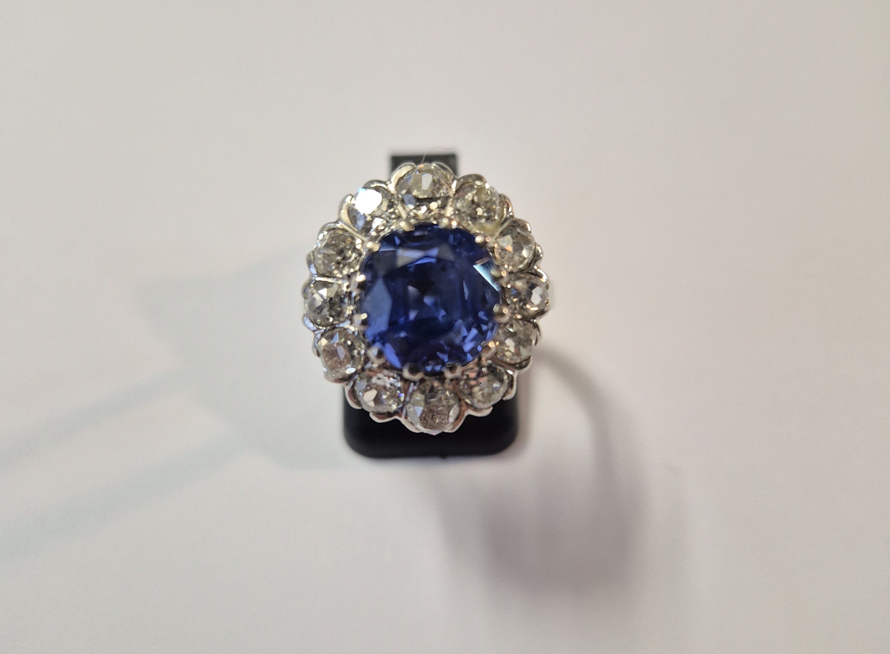 Ornée au centre d'un saphir de forme coussin dans un entourage de douze diamants ronds de taille ancienne.