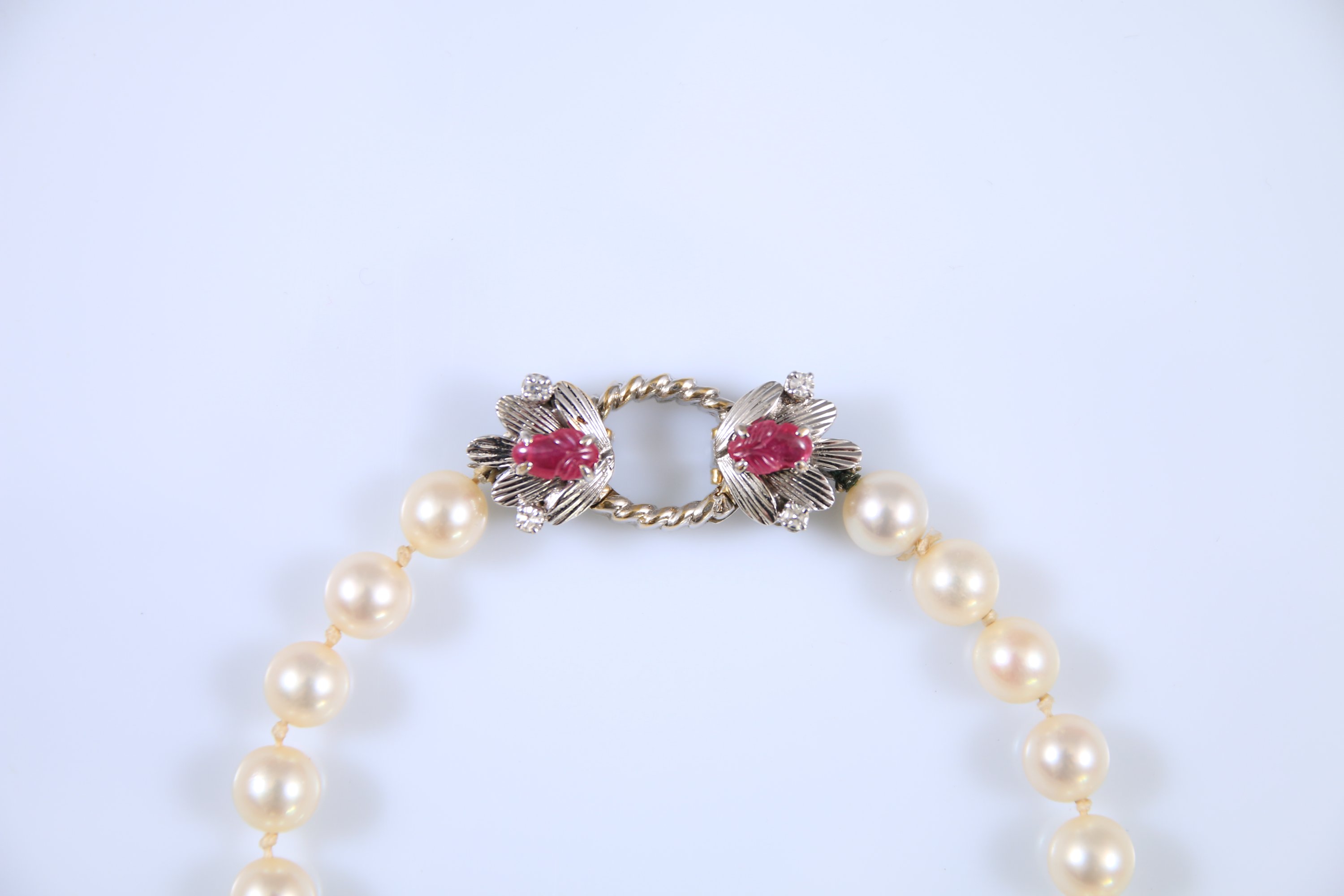 Fermoir en or gris 750 millièmes à décor de feuillages orné de rubis gravés et diamants ronds taillés en huit-huit.