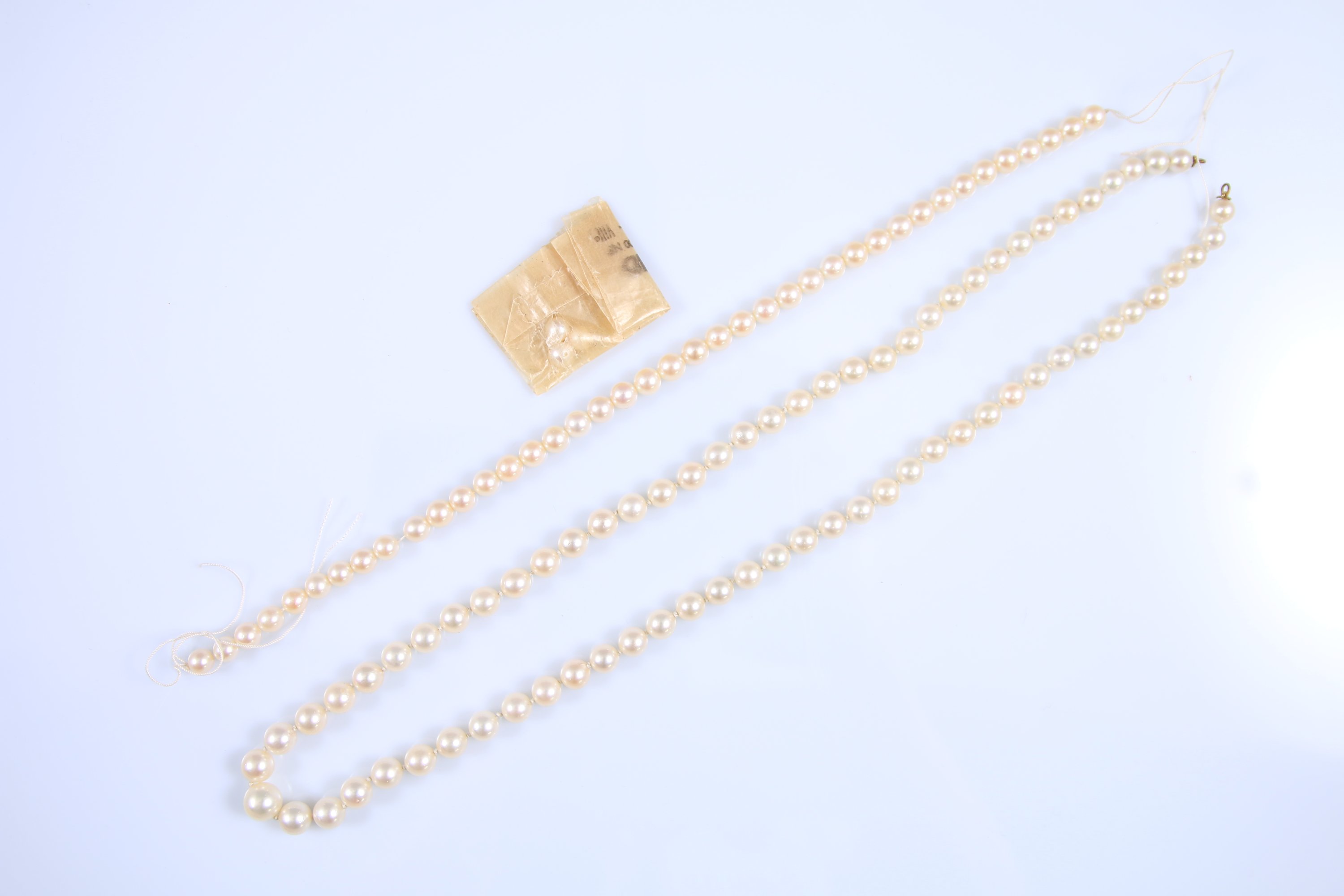 On y joint deux lignes de perles de culture sur fil.