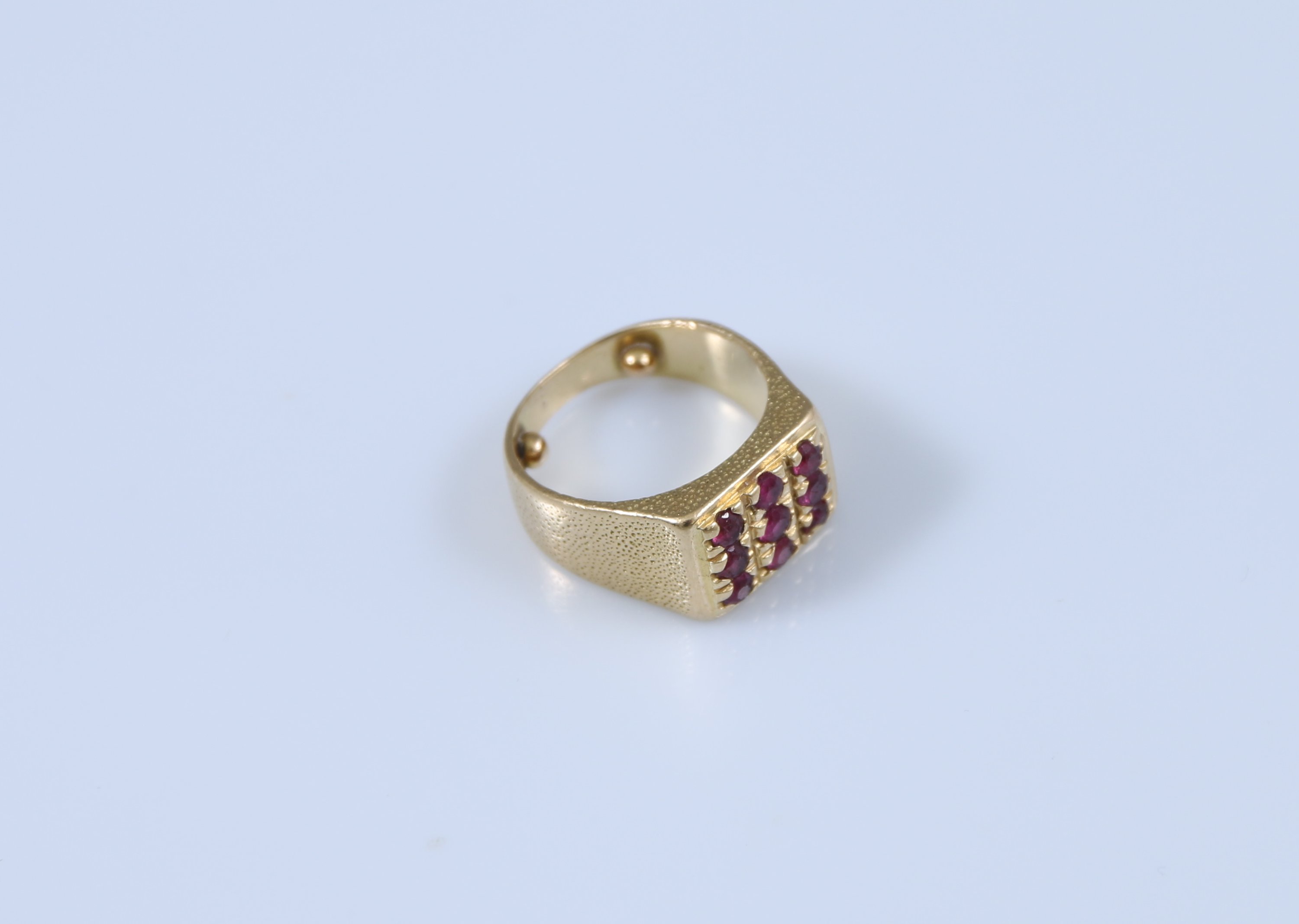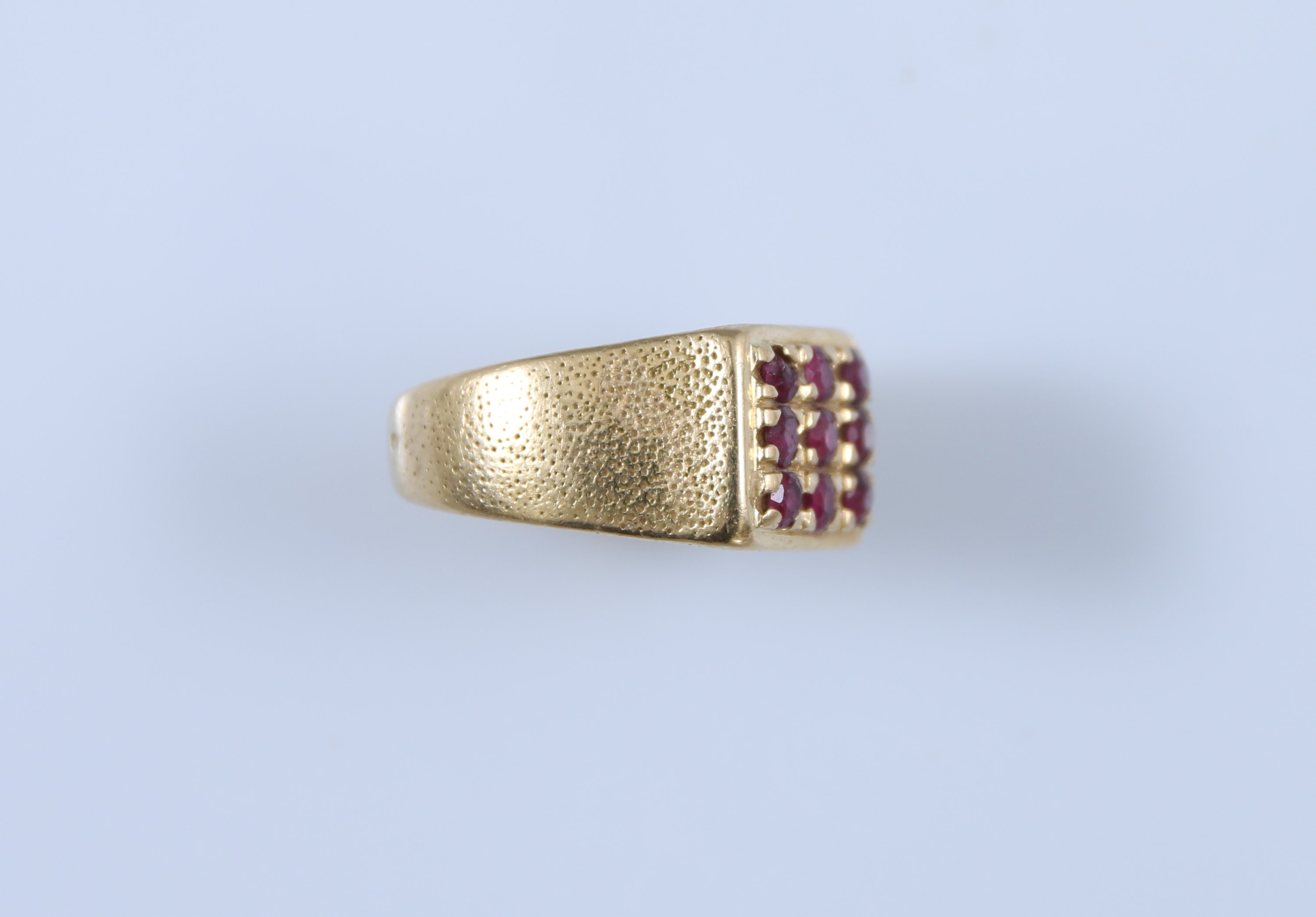 Or jaune 750 millièmes sertie de neuf pierre rouge sur trois rangs.
