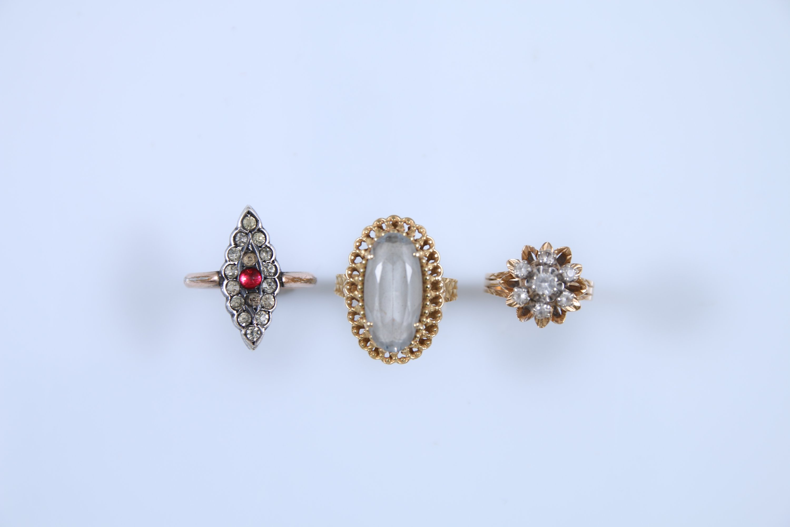 Joint : une bague marquise en métal doré sertie d'une pierre rouge et pierres du Rhin. TDD 53. Poids brut : 3 g. (manque des pierres)