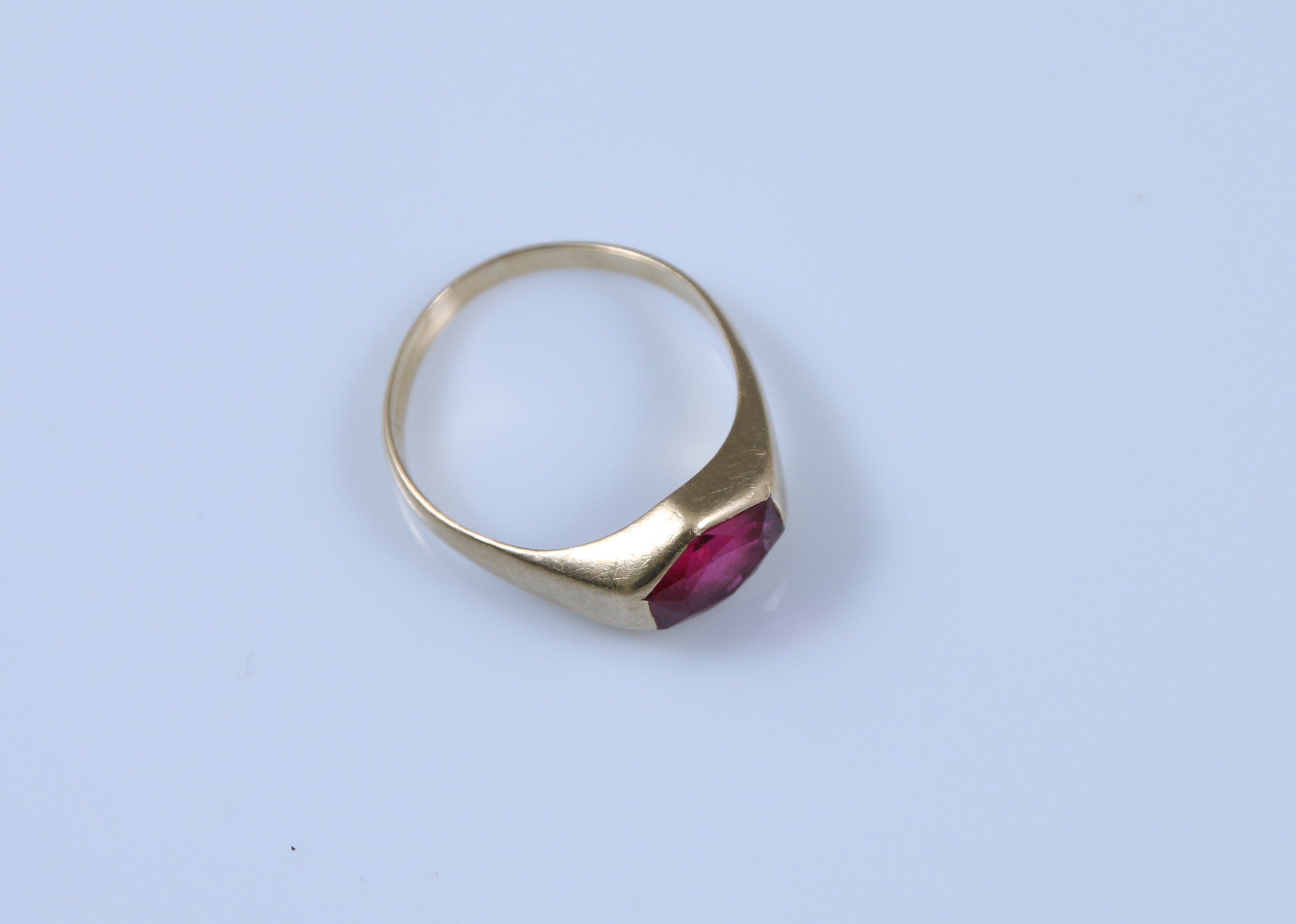 Or jaune 750 millièmes ornée au centre d'une pierre de synthèse rouge de forme hexagonale serti clos.
