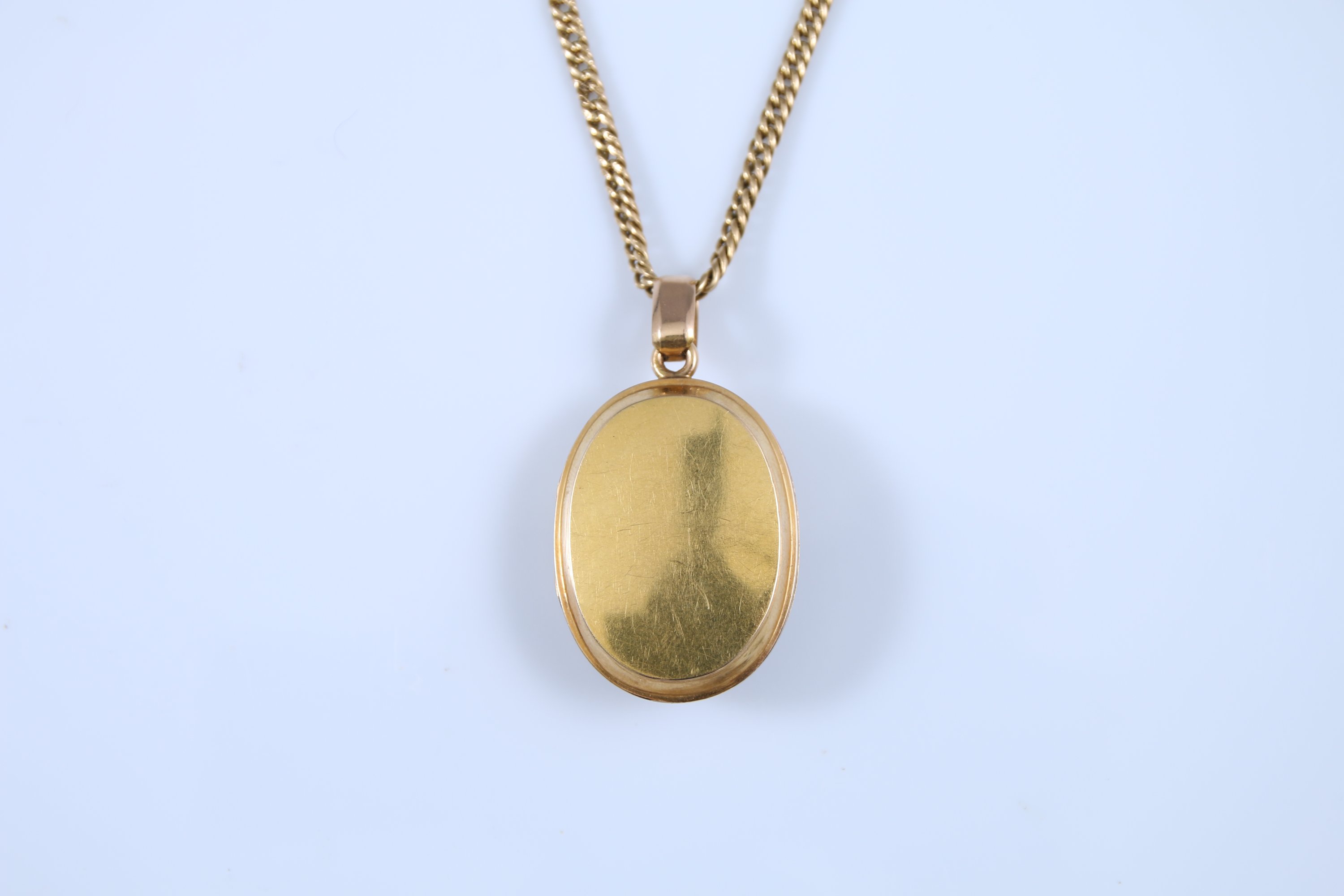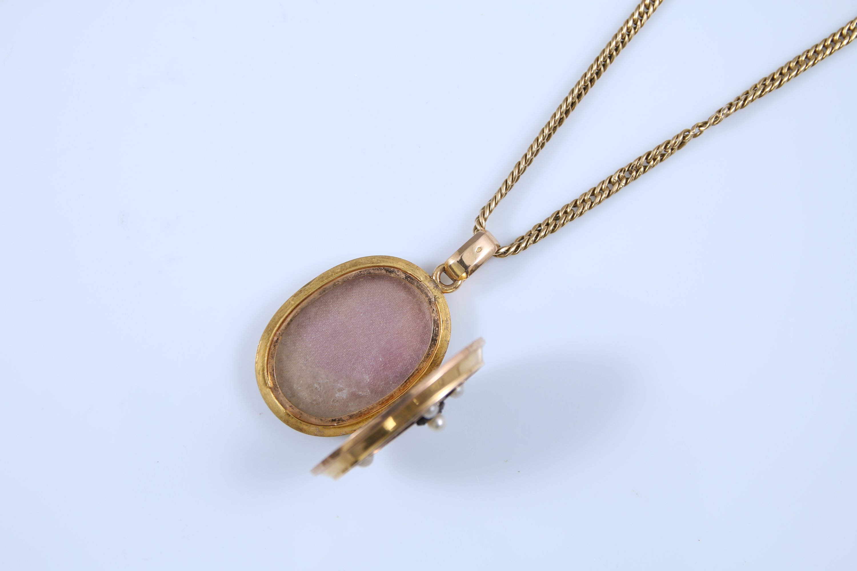 Le médaillon à décor d'une croix sertie de petites perles, intérieur en verre. La chaine à mailles gourmettes.