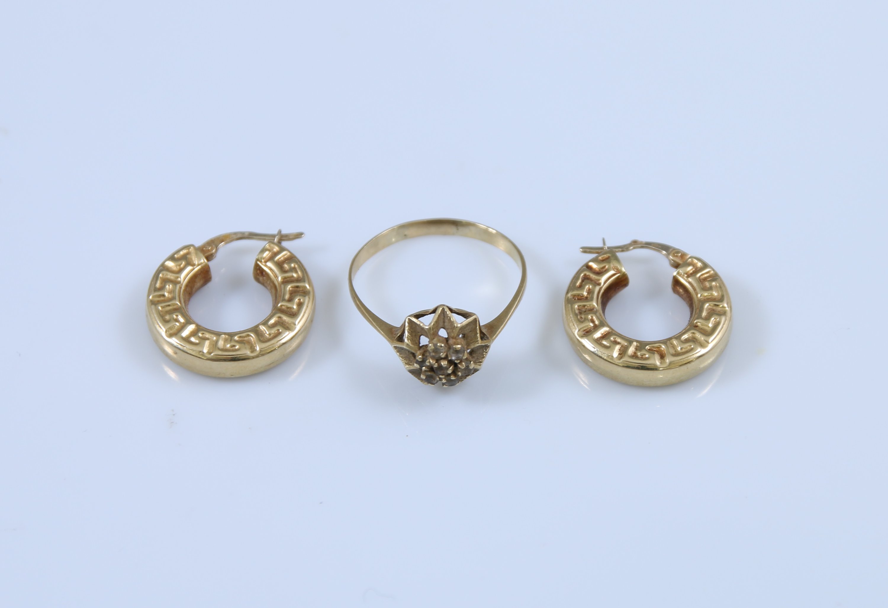 Comprenant une bague fleur sertie de pierres du Rhin et une paire de boucle d'oreilles à décor de grecques.
