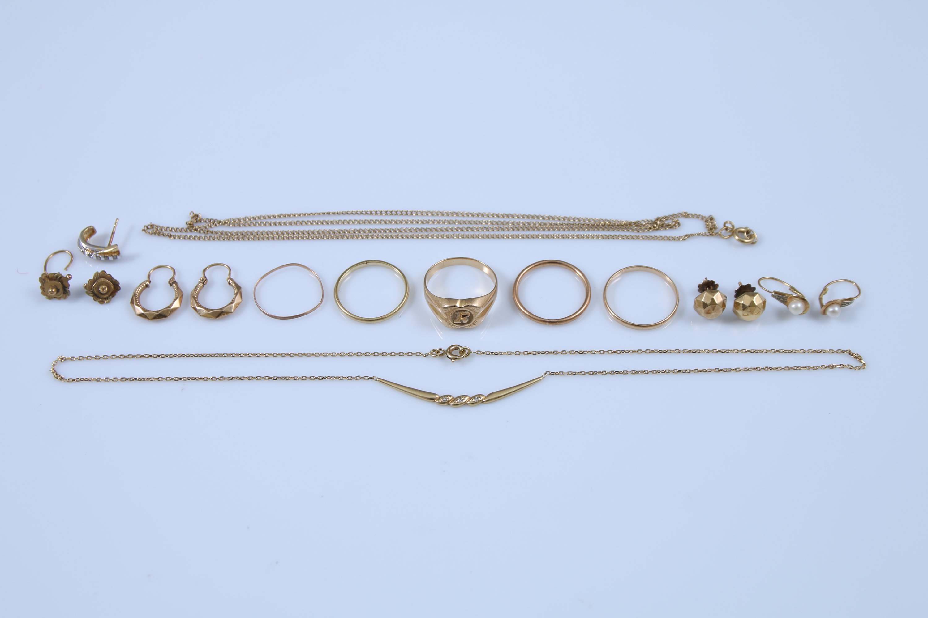 Comprenant une chevalière, quatre alliances, deux chaines, quatre paires de boucles d'oreilles, une boucle d'oreille.