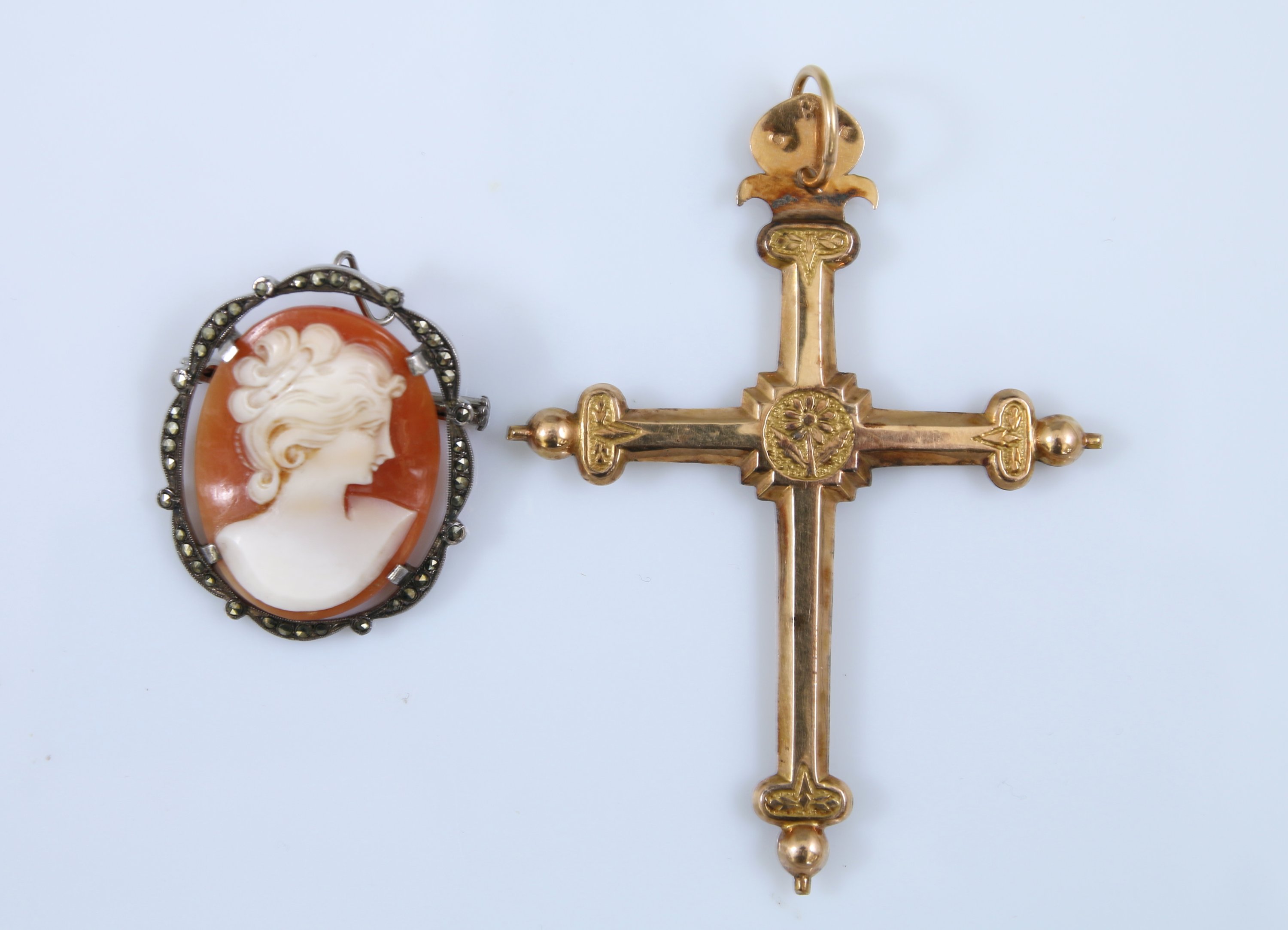 - Croix en or rose 375 millièmes à décor de fleurs et terminées par des boules. Poids : 3,1 g.
