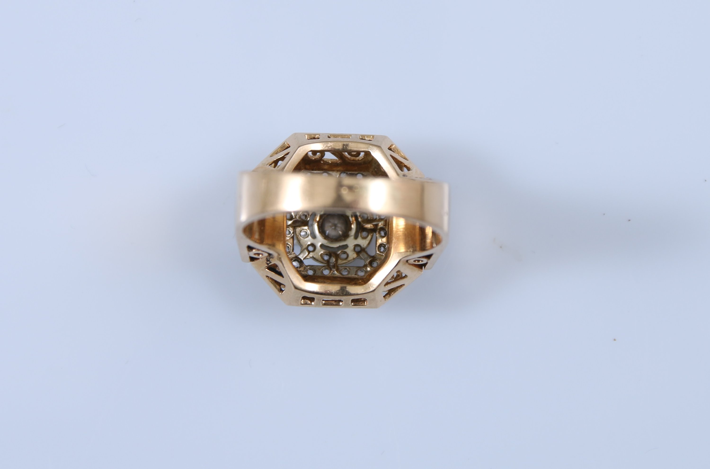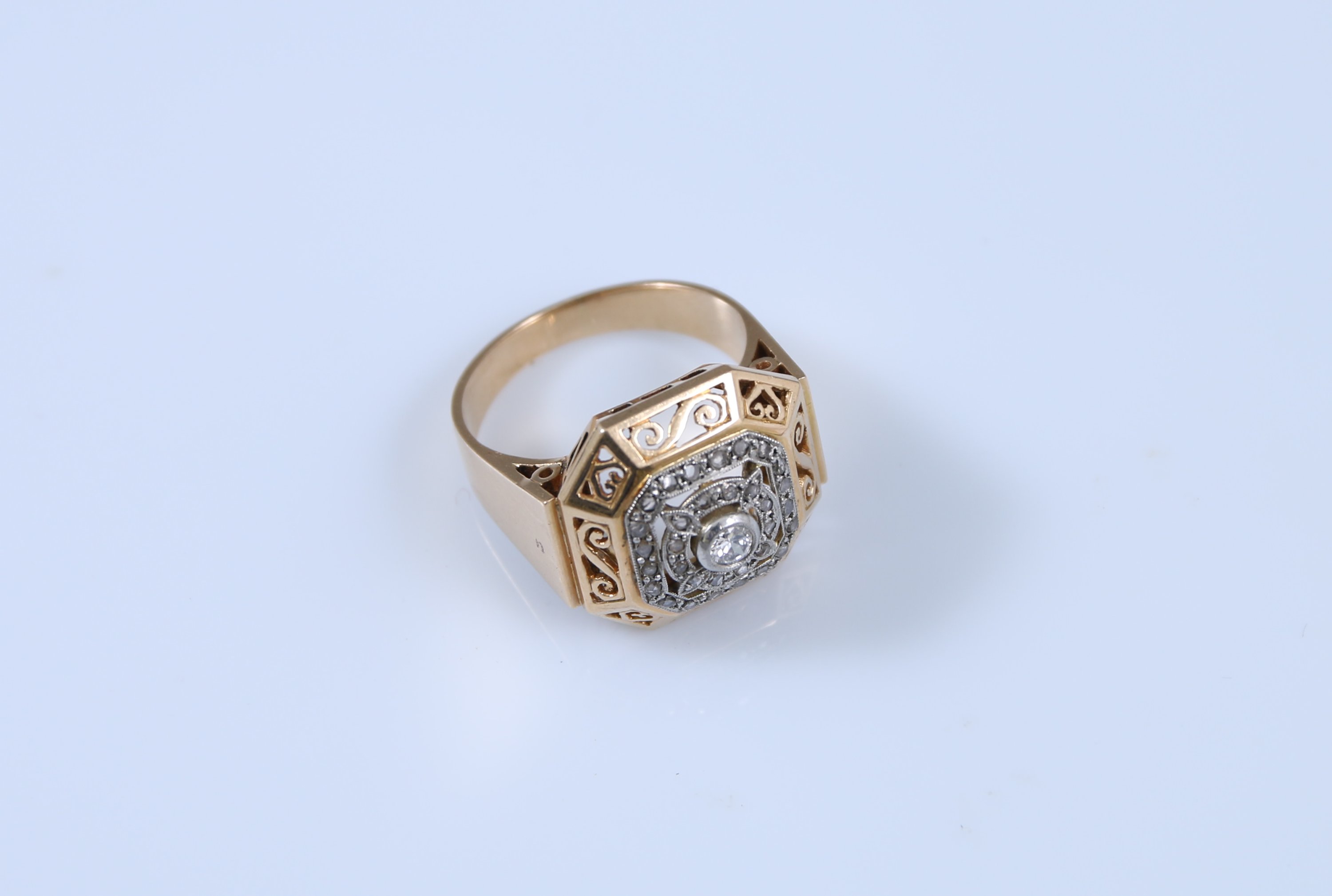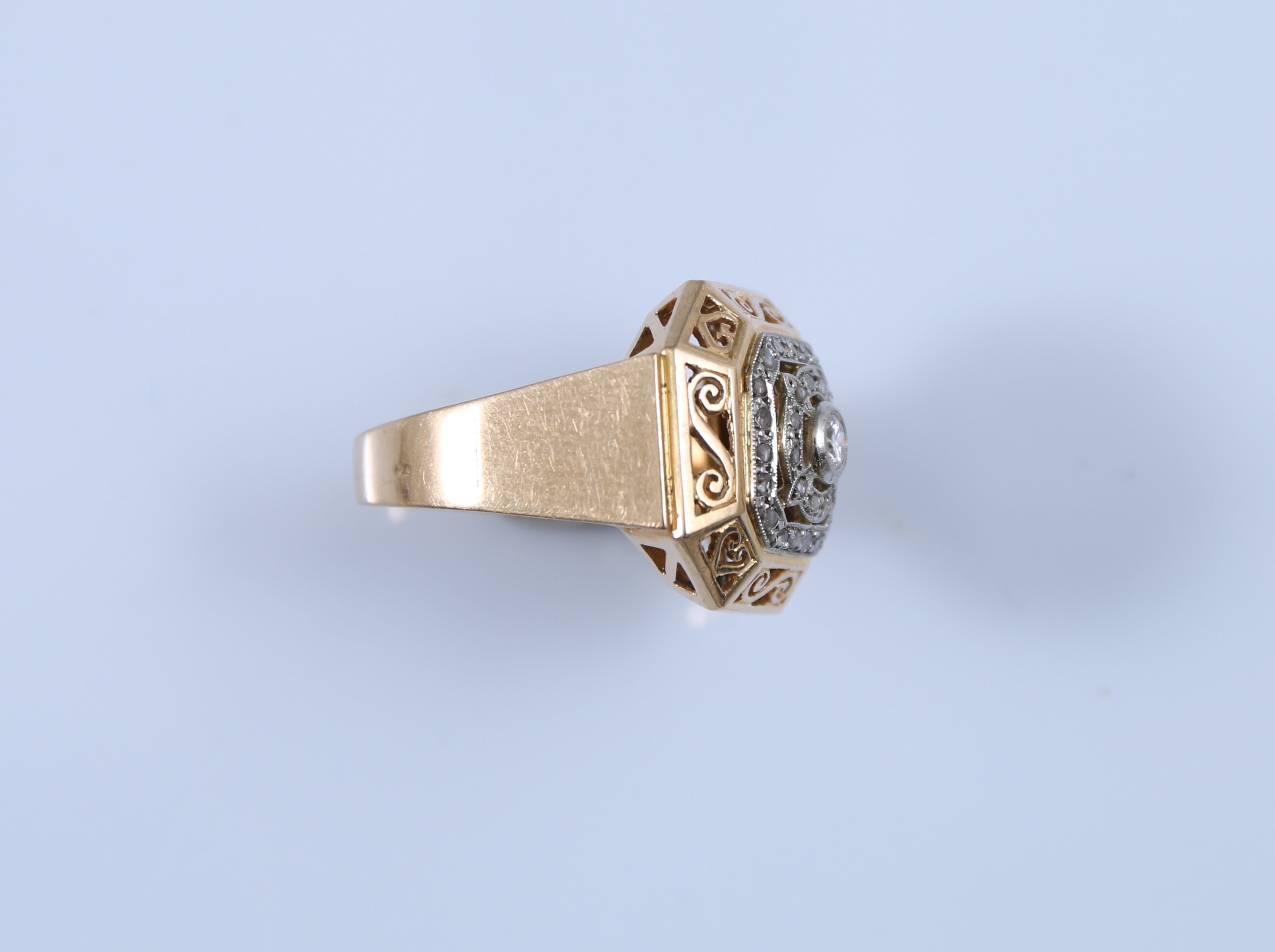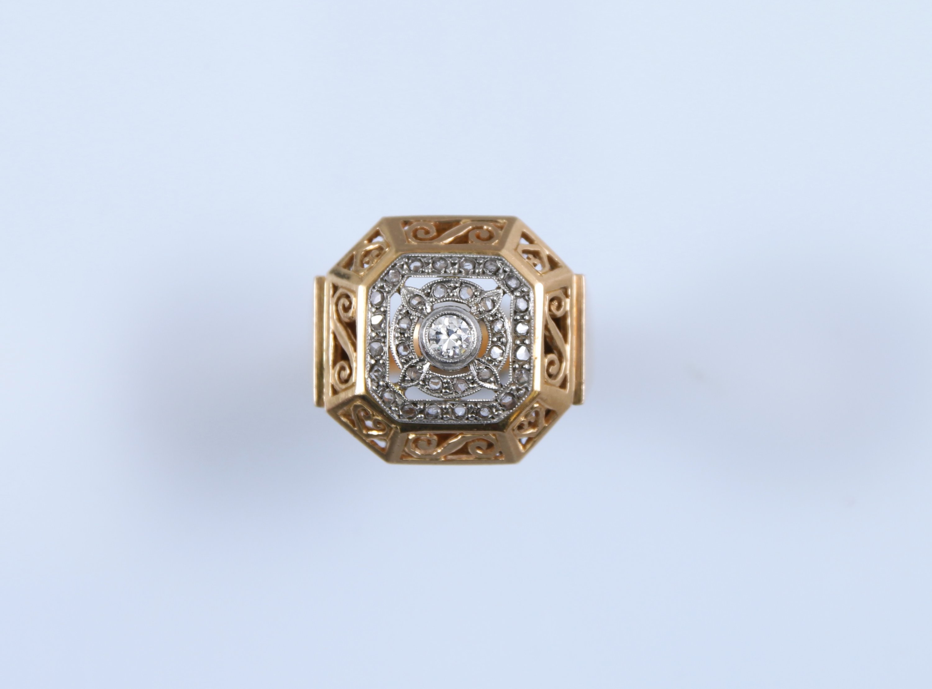 De forme octogonale à décor ajouré de rinceaux, elle est sertie au centre d'un diamant rond entouré de pavage de brillants.