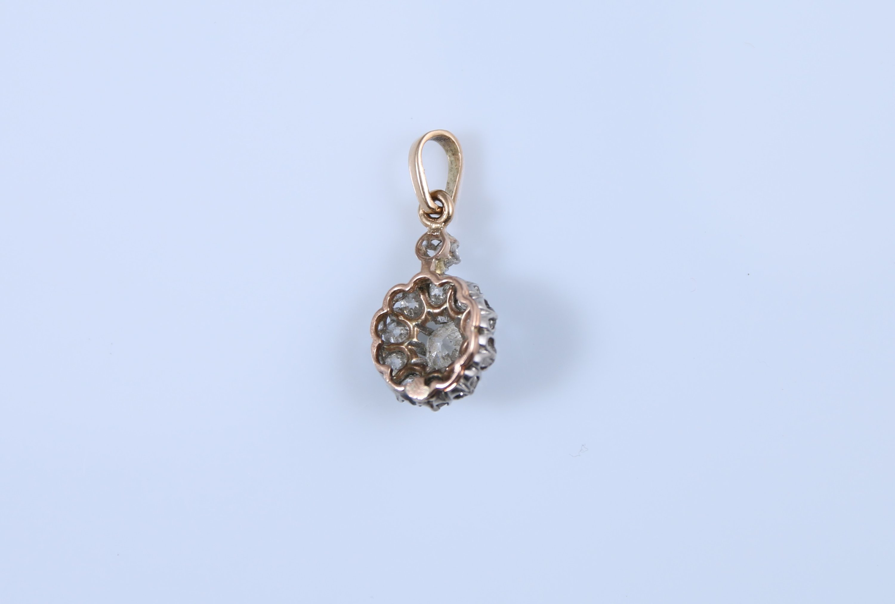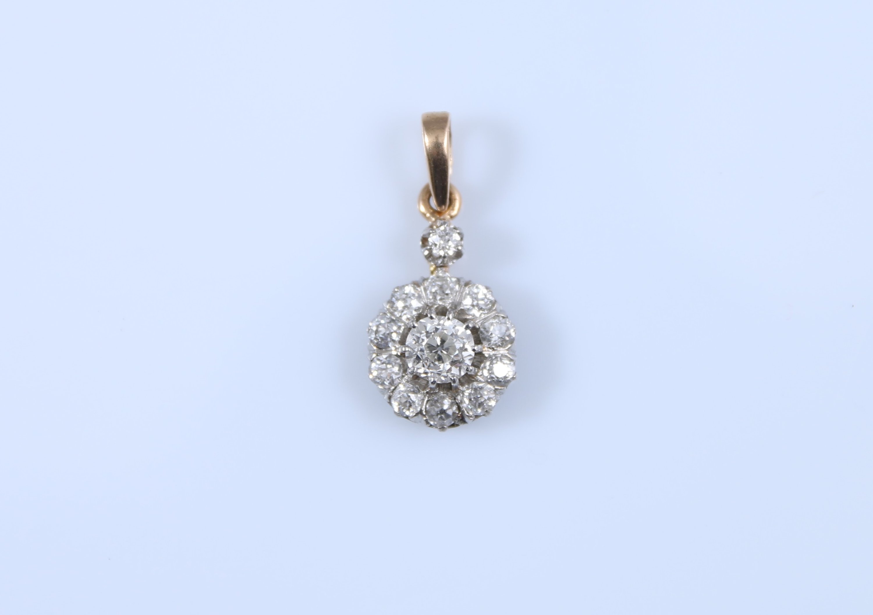 Or jaune 750 millièmes, serti d'un diamant d'env. 0,3/0,5 ct. dans un entourage de dix brillants. La bélière sertie d'un petit diamant.