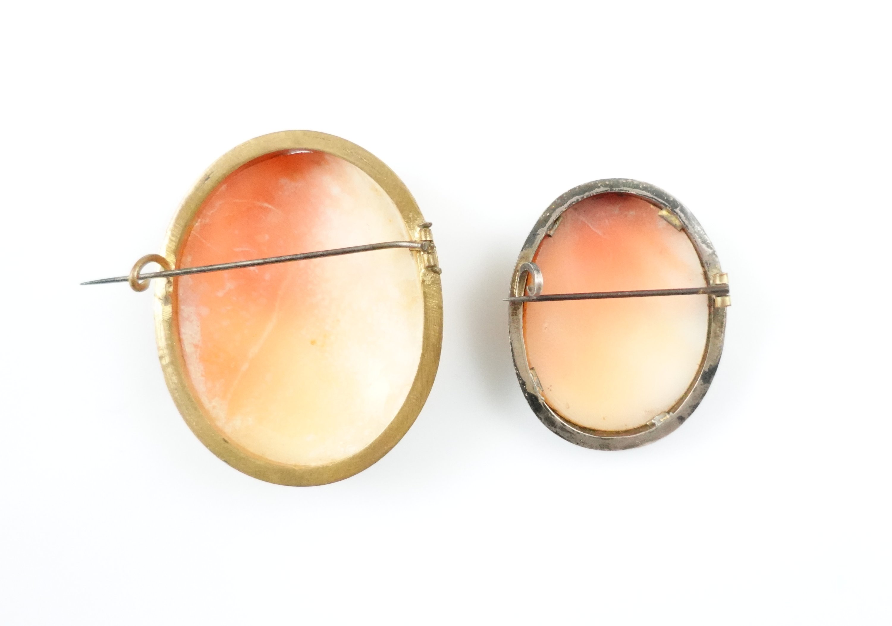 dans une monture en métal doré pour l'une et argent pour l'autre, ornées de camées en coquilles sculptées de deux profils de femmes à l'Antique tournées vers la droite.