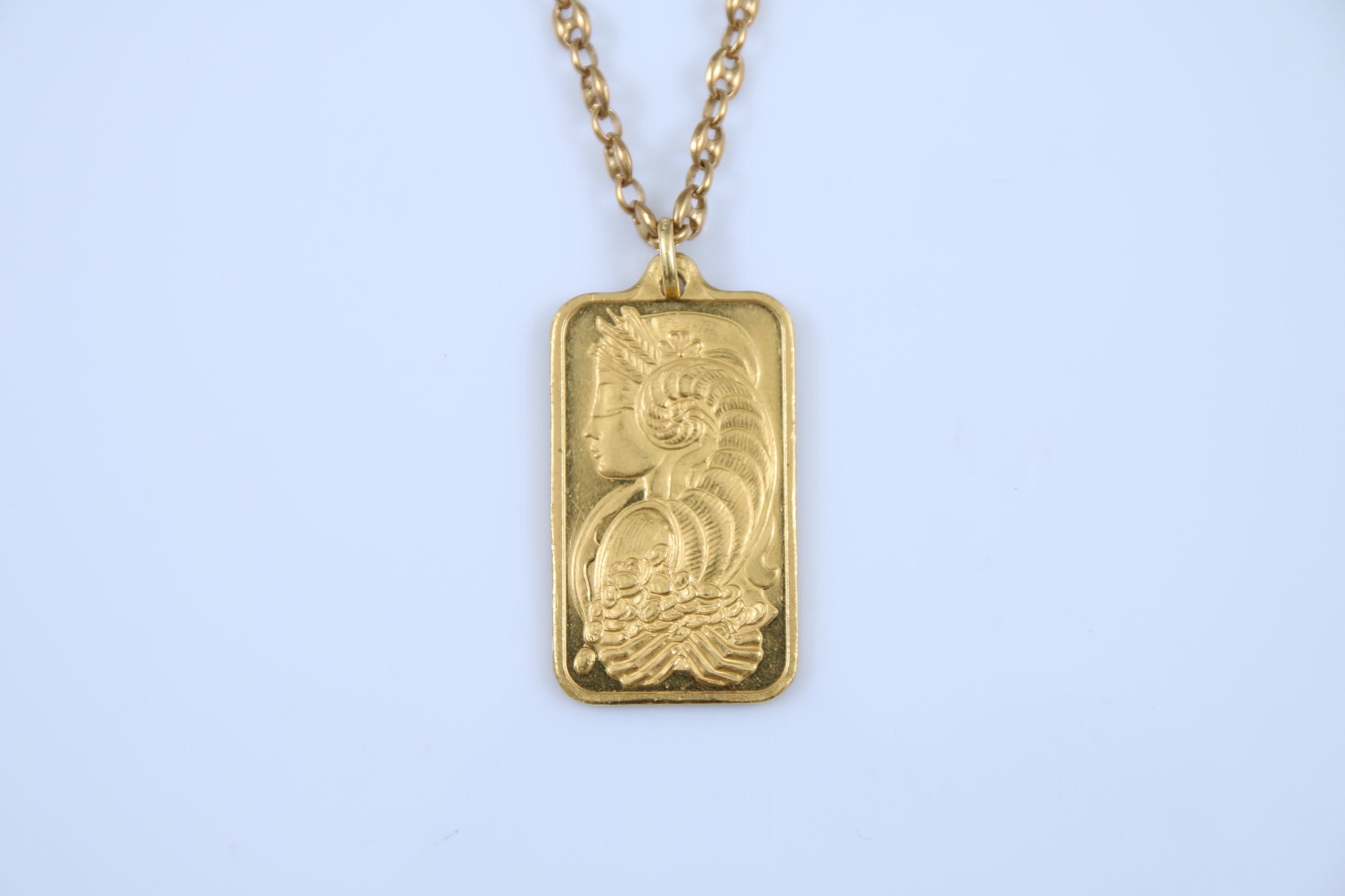 La chaine à mailles grains de café en or jaune 750 millièmes et le pendentif en or jaune 999,9 millièmes avec une figure de l'abondance sur l'avers et un symbole émaillé et la mention "Suisse One Troy Ounce 999.9 fine Gold" au revers. Sa bélière en or jaune 750 millièmes.