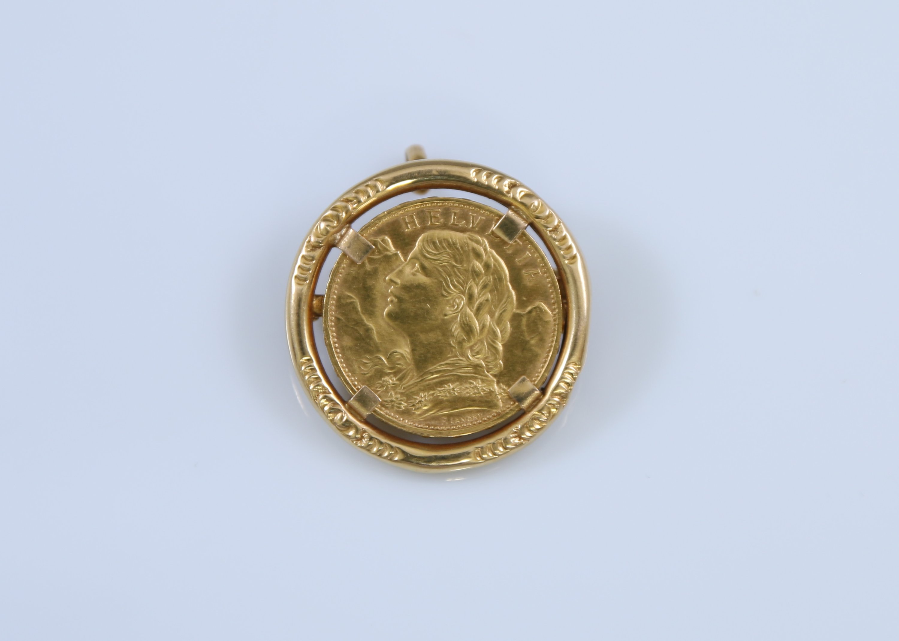 Or jaune 750 millièmes orné d'une pièce de 20 francs suisse or 1925 frappée à Berne.