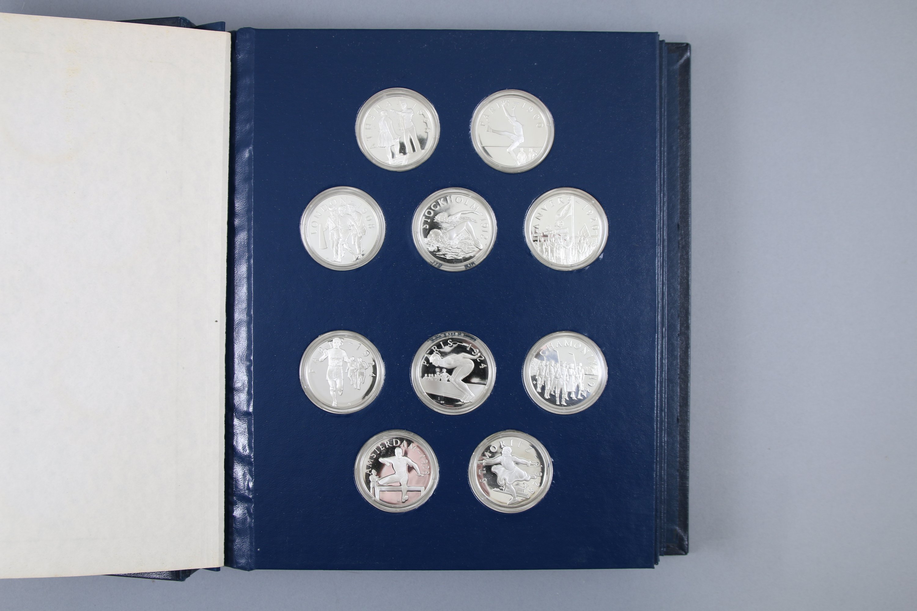 50 médailles commémoratives en argent célébrant les jeux de 1896 à 1976 à travers 50 champions des jeux d'hiver et d'été : a) de 1896 à 1928 (Ewry, Dorando Pietri, Nurmi, Sonja Henie, lors Burghley, Weissmuller, Kahanamoku, etc) ; b) de 1932 à 1948 (Owens, Didrikson, Button, Matthias, Blankers-Koen) ; c) de 1948 à 1956 (Elvstroem, Adhémar Ferreira, Zatopek, Papp, Sailer, Bob Richards) ; d) de 1960 à 1968 (Bikila, Killy, Fleming, Rafer Johnson) ; e) de 1968 à 1976 (Beamon, Oerter, Monti, Comaneci, Alexiev).