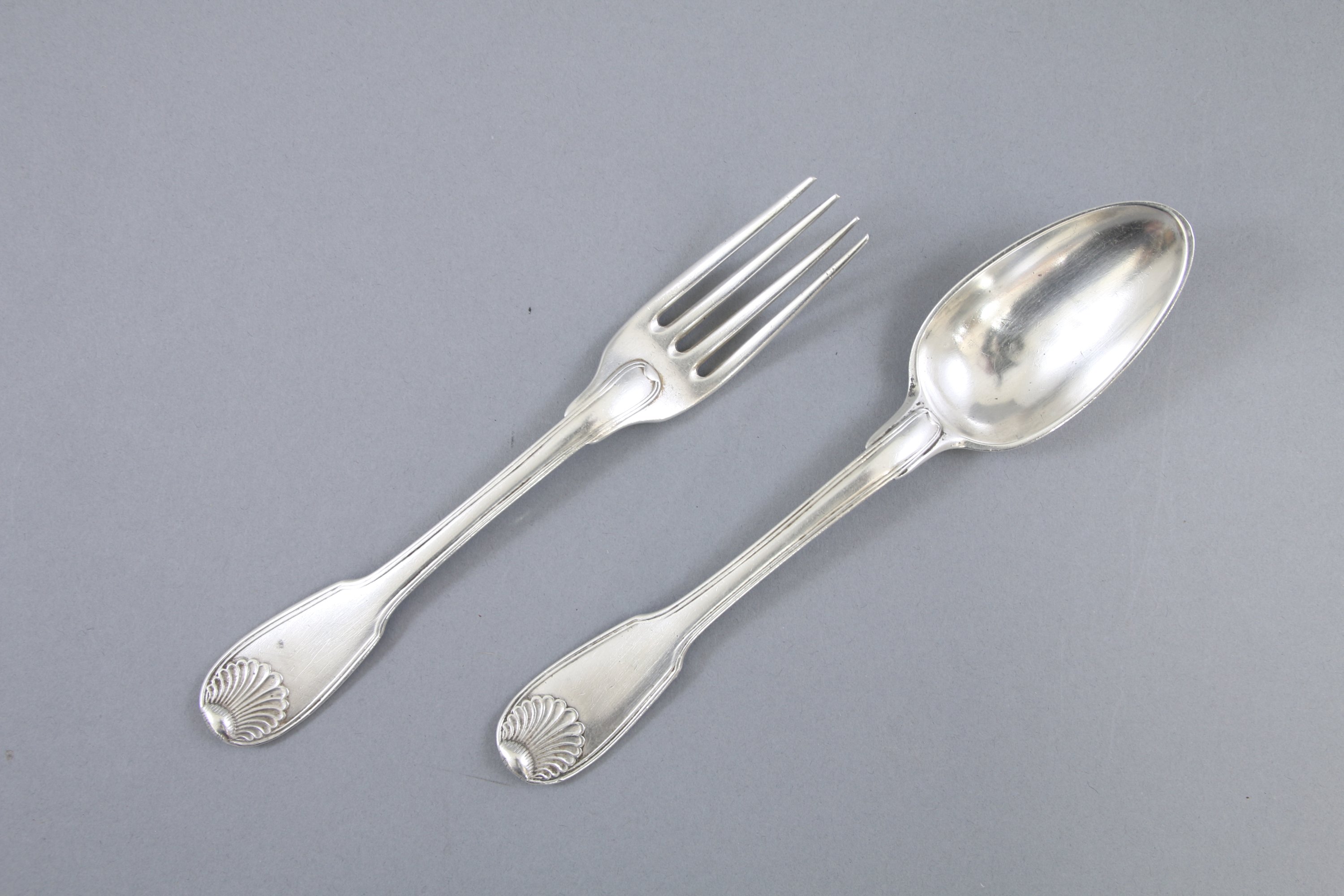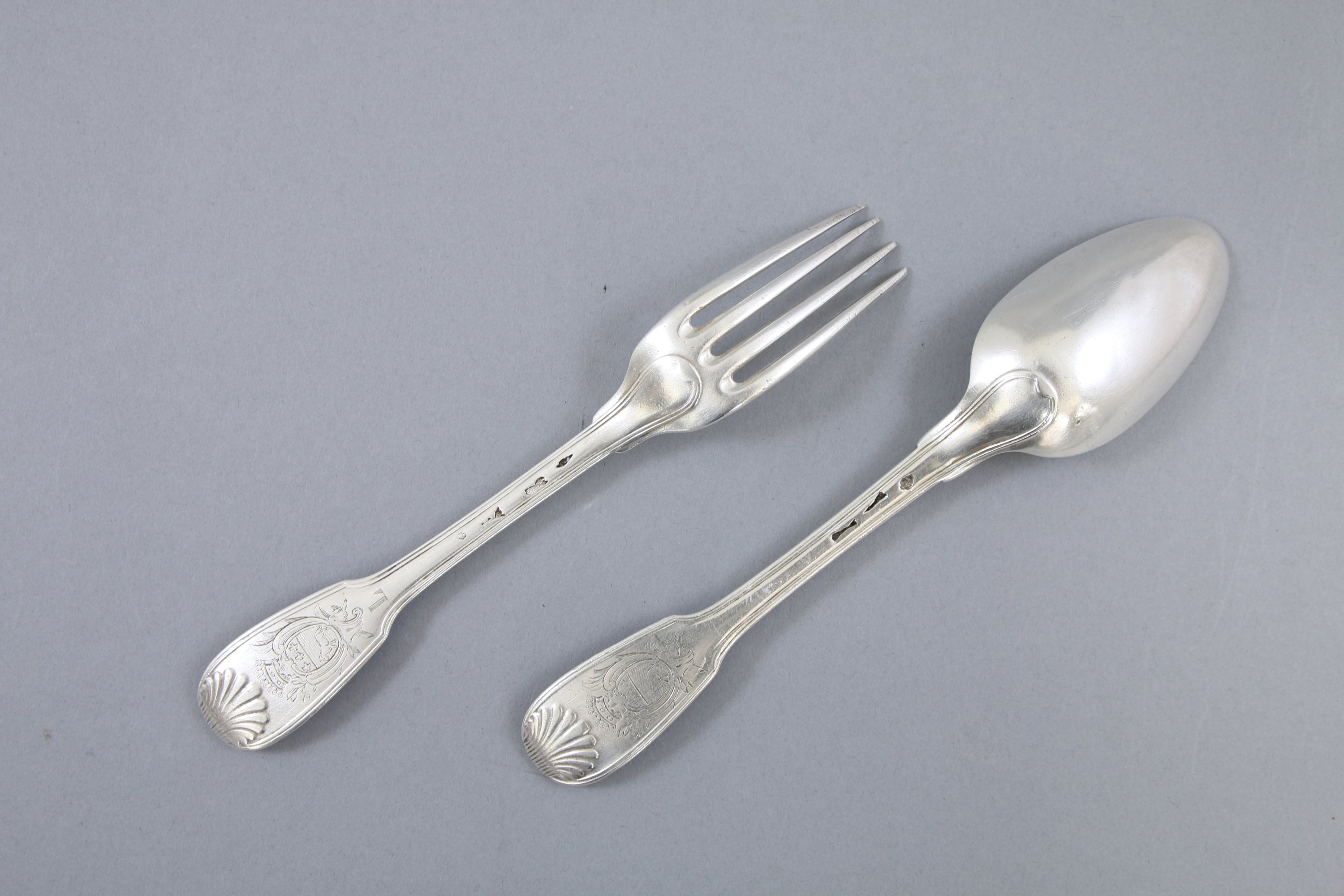 Modèle filets-coquille. A décor d'armes comtales figurant un âne passant et trois croix grecques en chef dans un cartouche. La fourchette gravée "L".