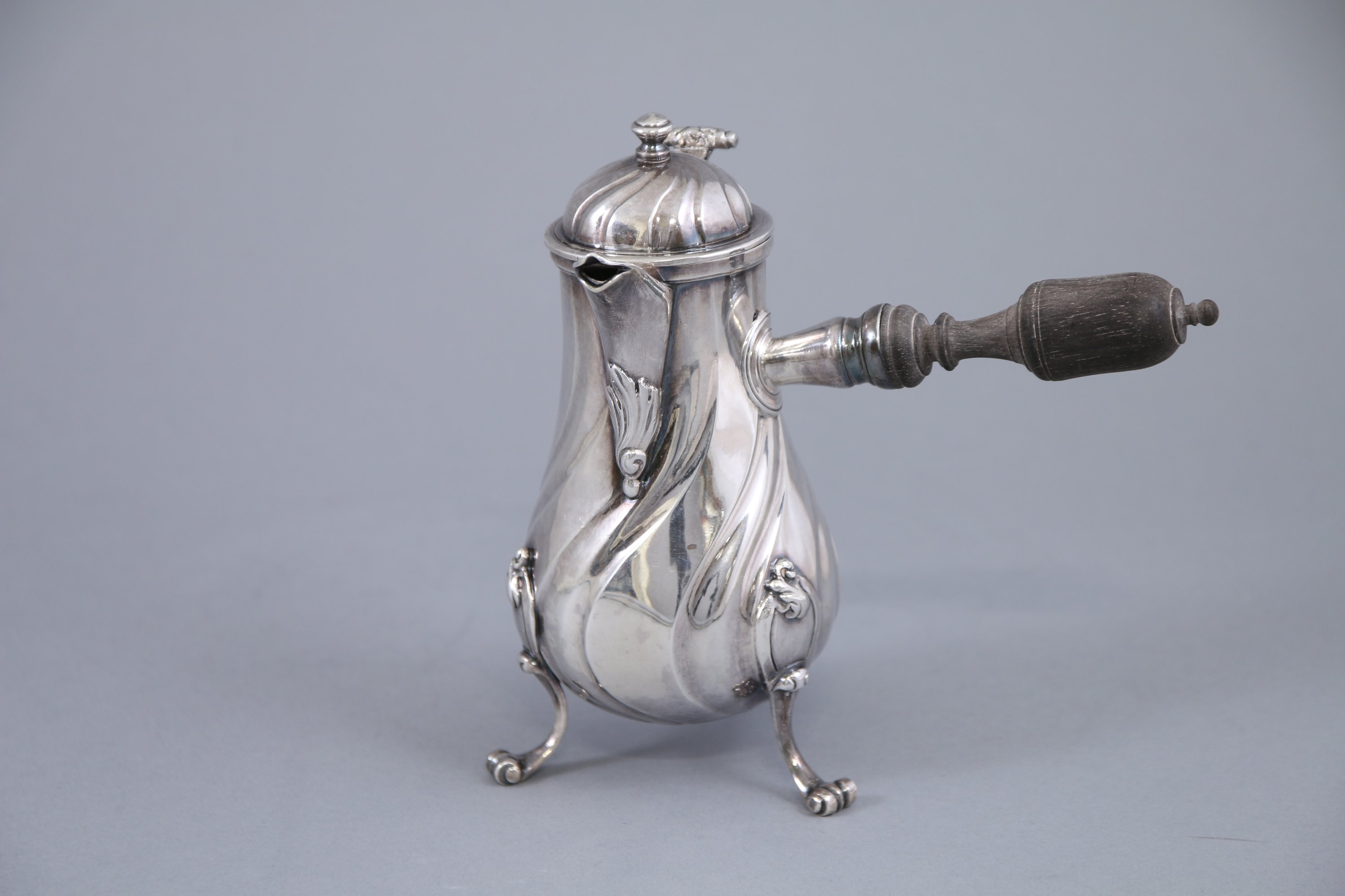 Le couvercle est sommé d'un fretel en forme de toupie sur fond de godrons torsadés se prolongeant sur la panse. Elle repose sur un piétement tripode terminé en enroulements.