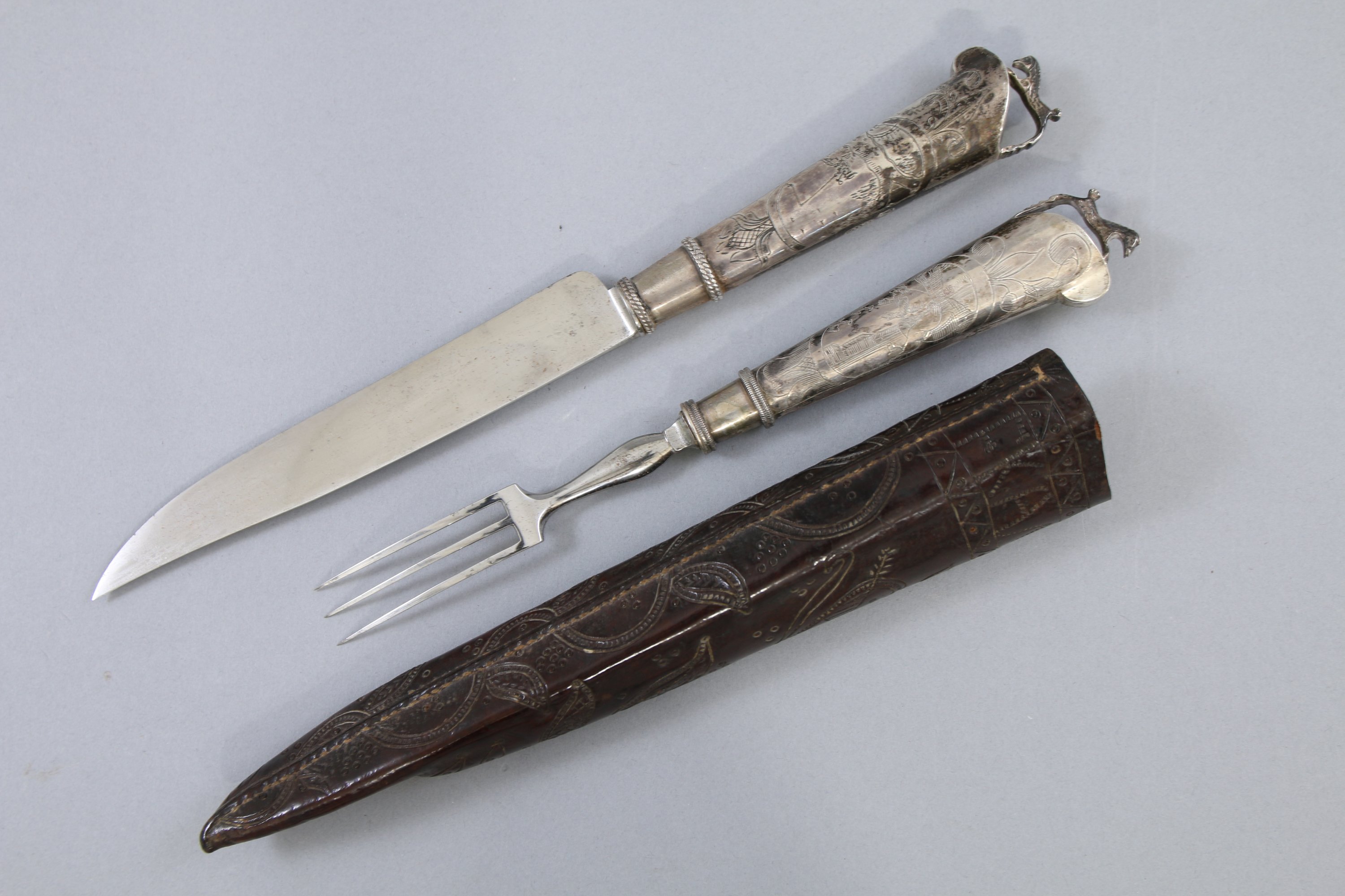 Manches en argent gravé, lame et dents en acier.