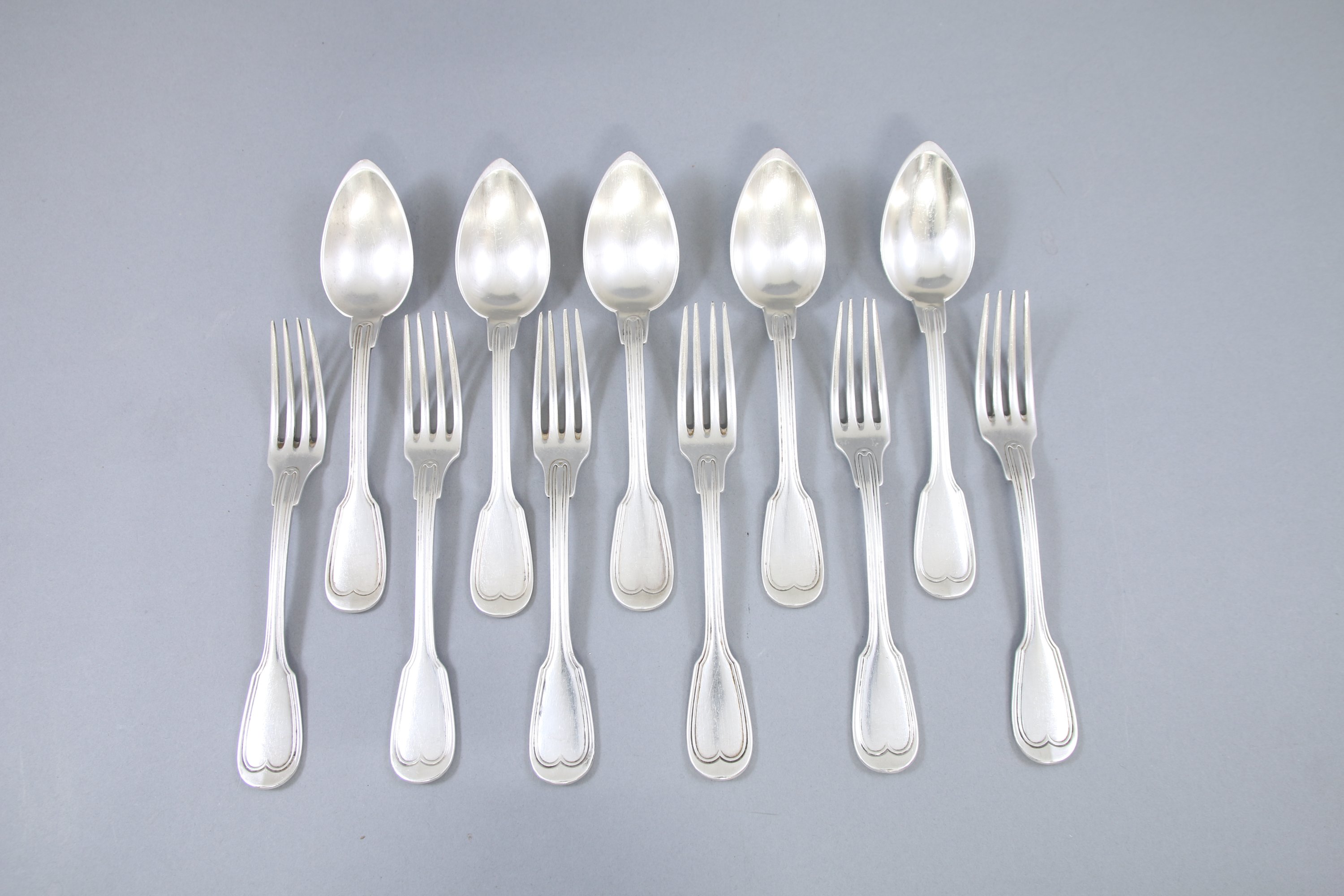 Modèle à filets-contours comprenant 18 fourchettes de table, 13 cuillers de table, 6 couverts à entremets, 9 cuillers à café et une cuiller à moka. La plupart des pièces gravées d'une couronne comtale.