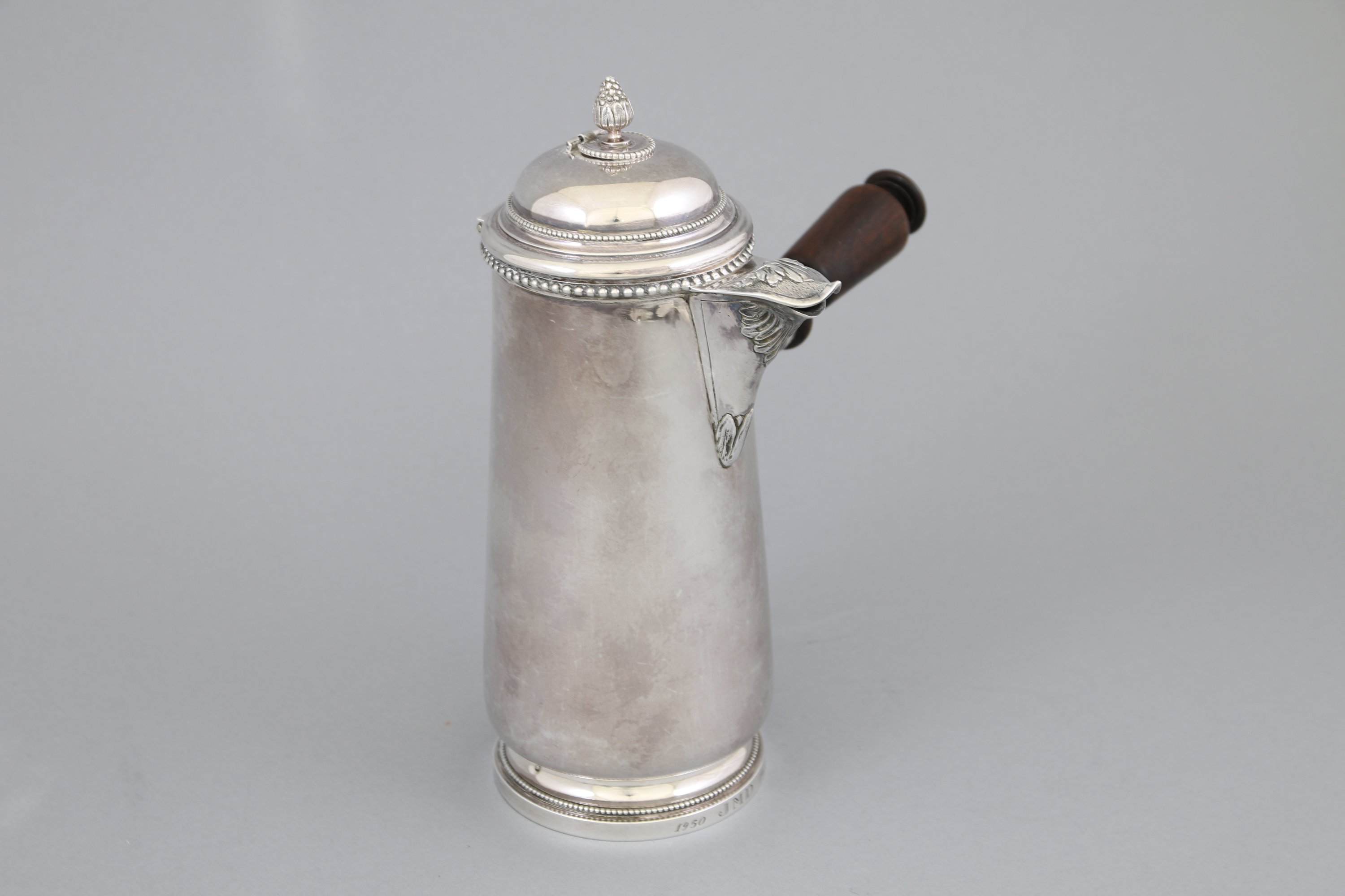 Le fretel à décor d'une pomme de pin inscrit sur une terrasse cerclée d'un rang de perles. Le bec verseur est orné d'une feuille d'acanthe. Elle repose sur une plinthe décorée d'une frise de perles et gravée "1950 JMD 1960". Manche en palissandre tourné.