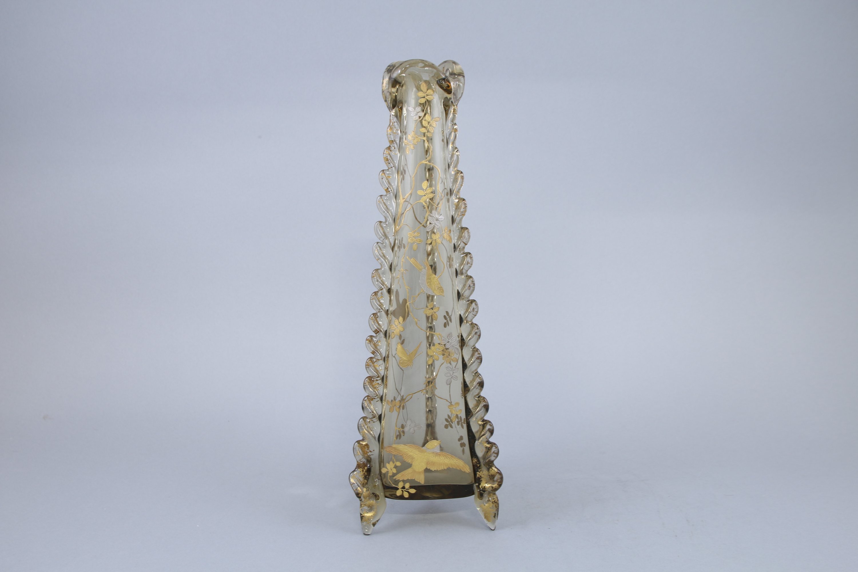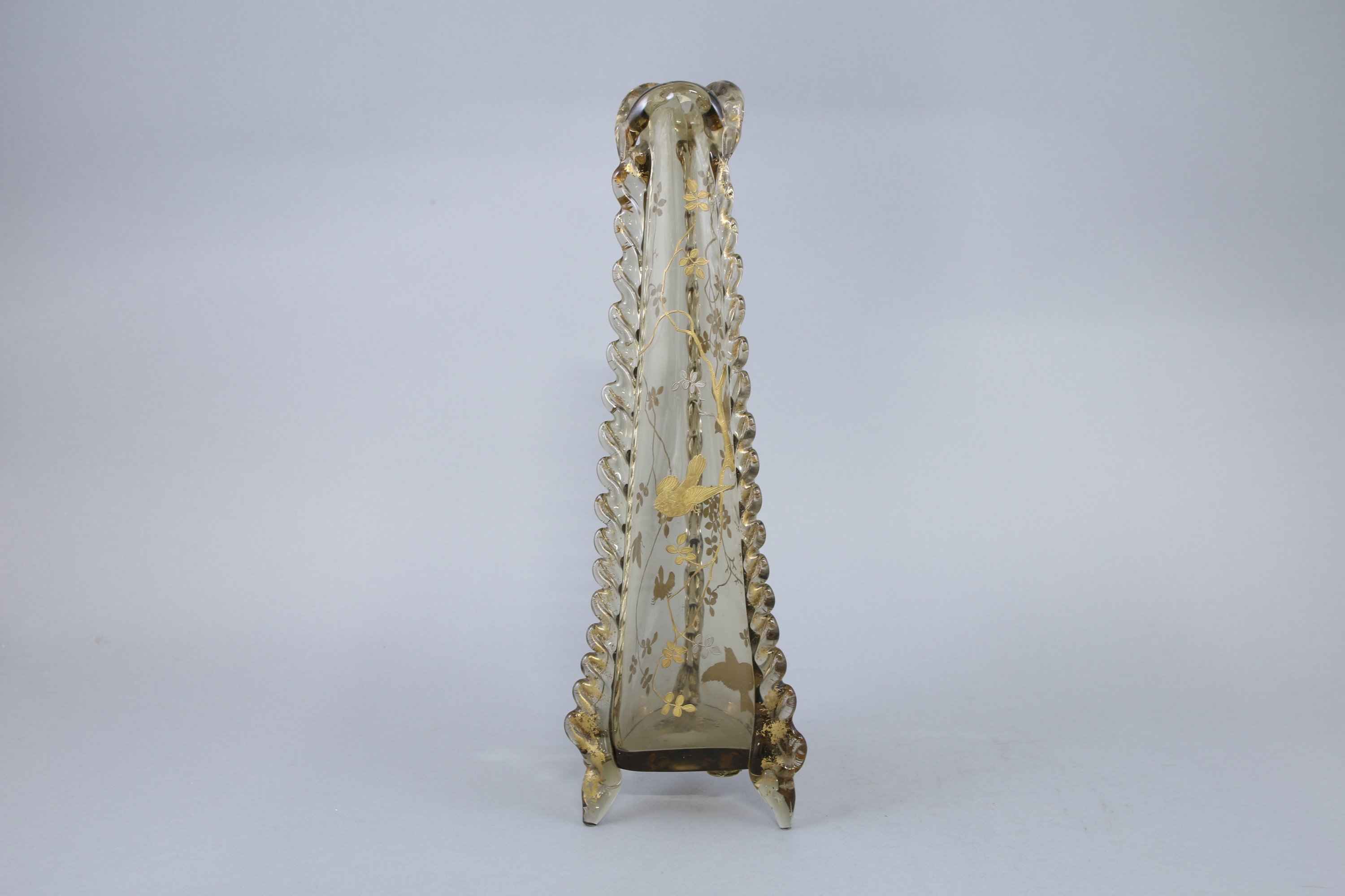 De forme tronconnique, les côtés cotelés et le col mouvementé en application. Riche décor émaillé plat et en relief d'inspiration japonisante d'oiseaux et d'insectes évoluant dans des branchages.