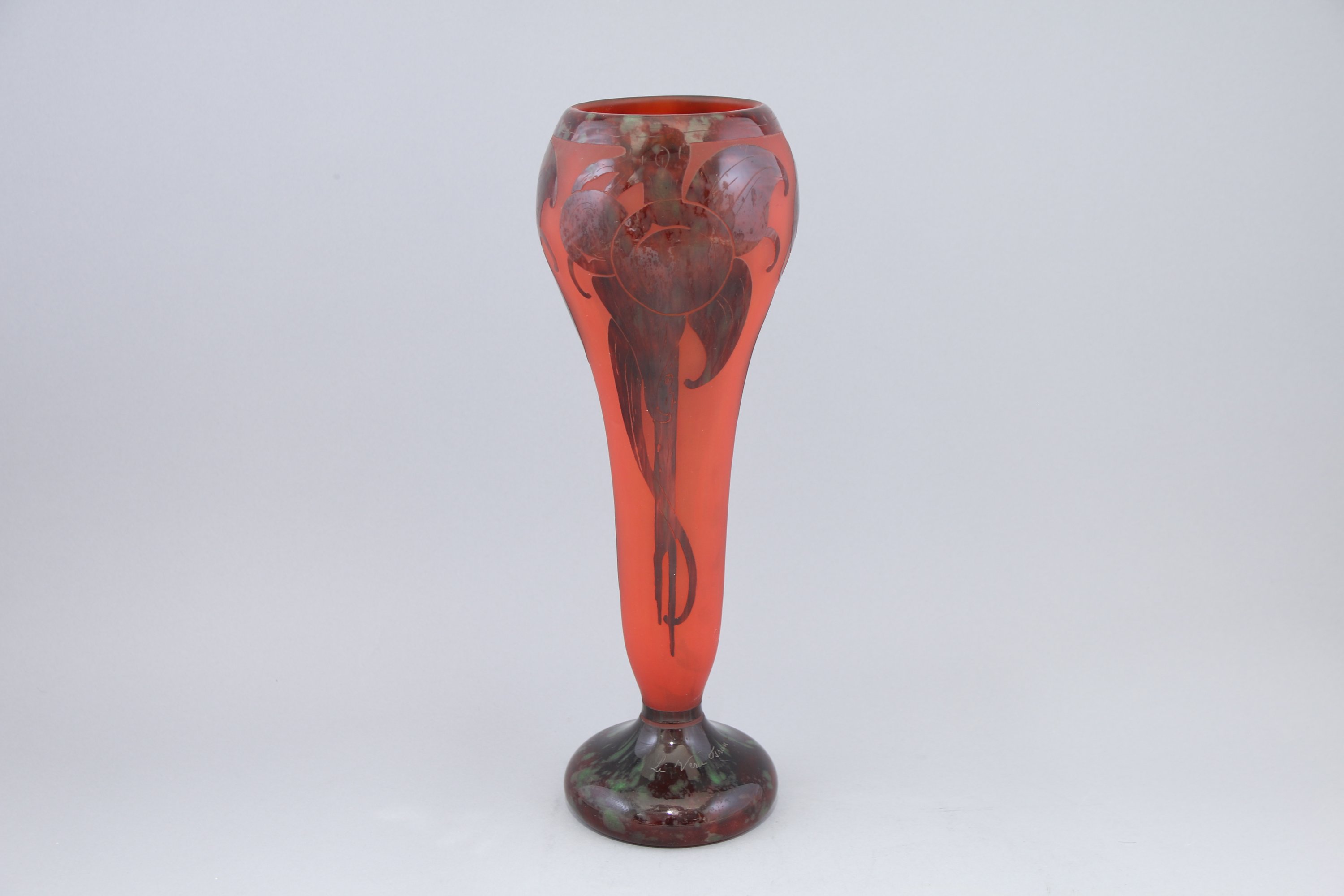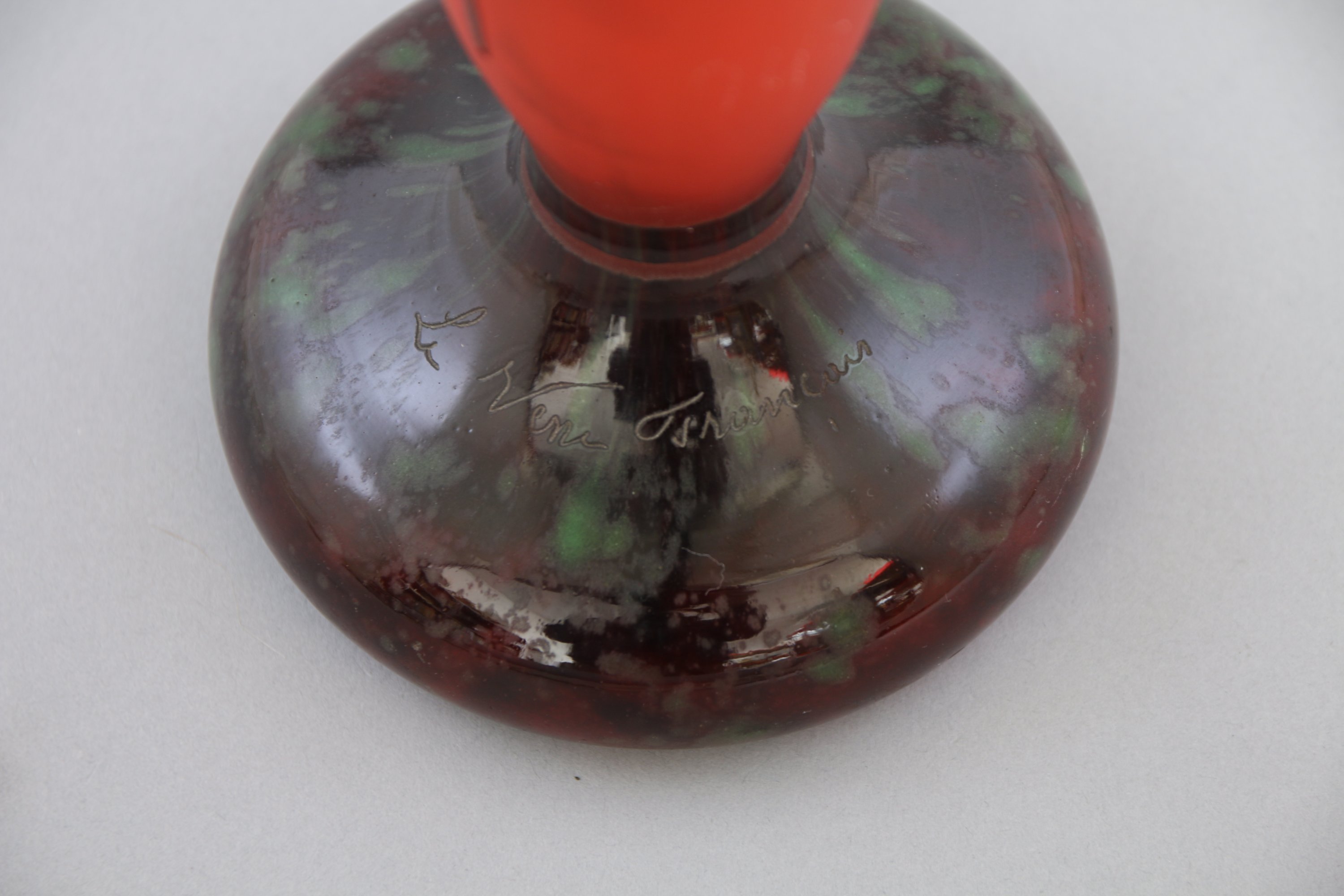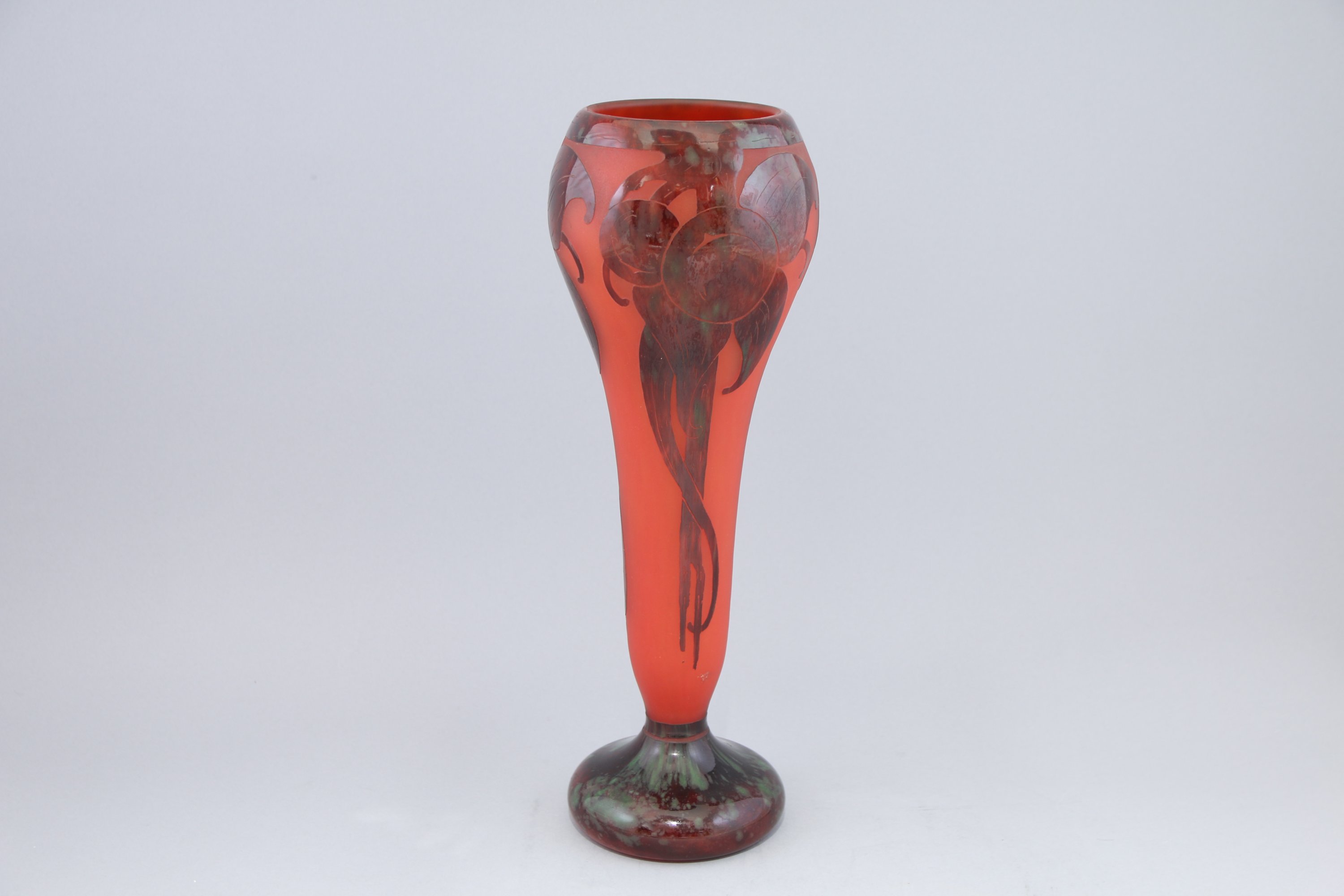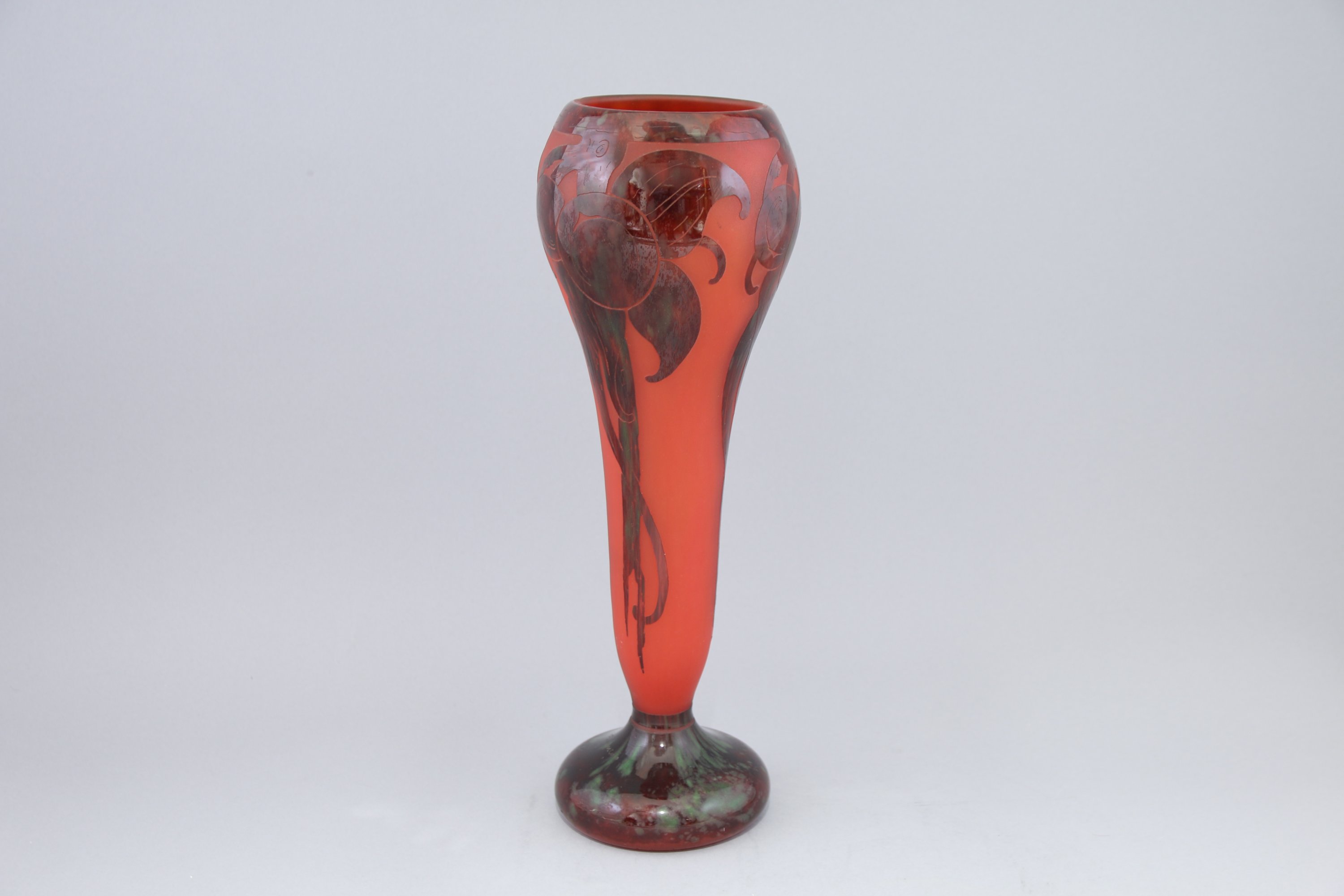 De forme cornet à col renflé, il repose sur un piedouche, à décor dit de "prunes" en verre rouge et vert sur un fond rouge poudré.
