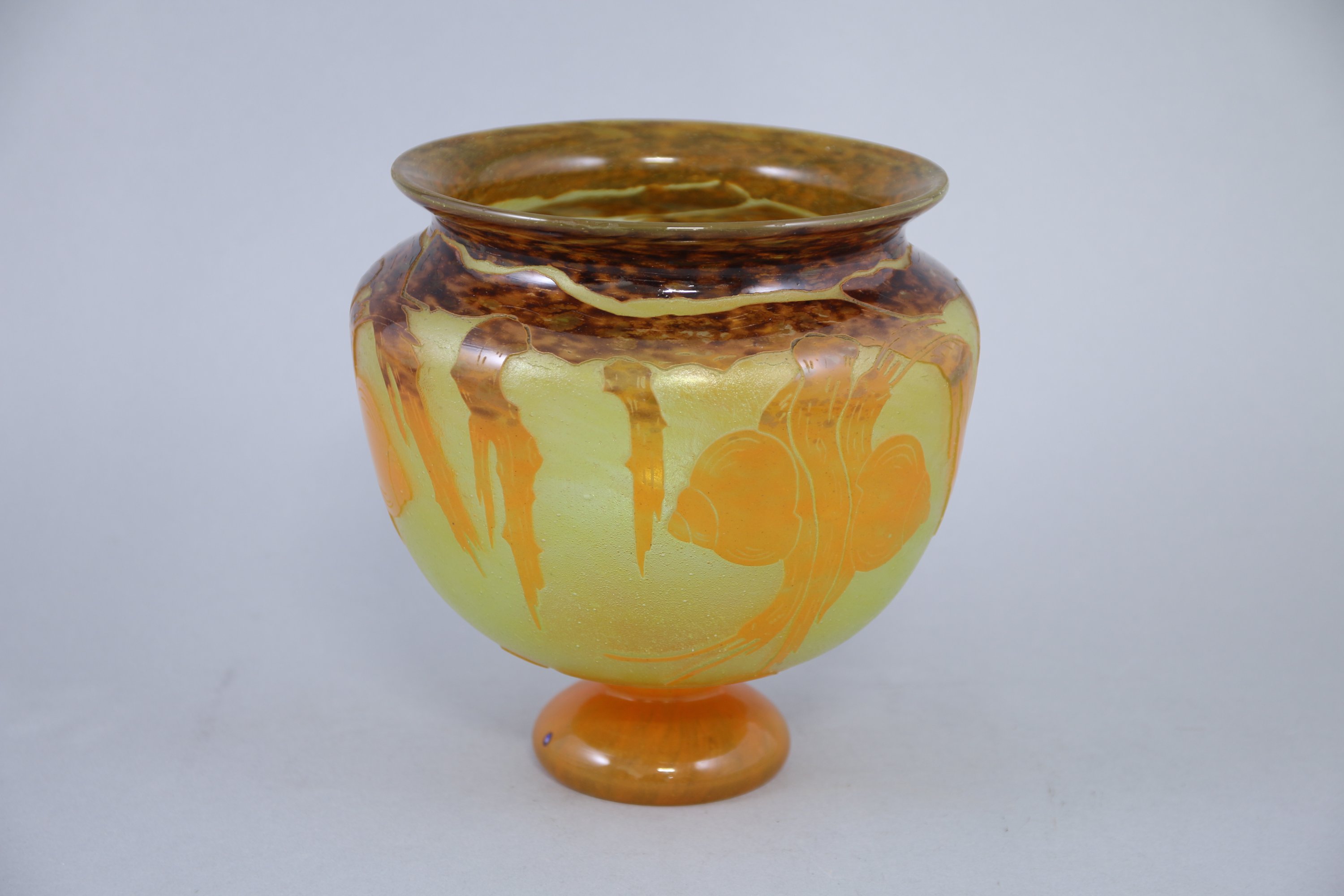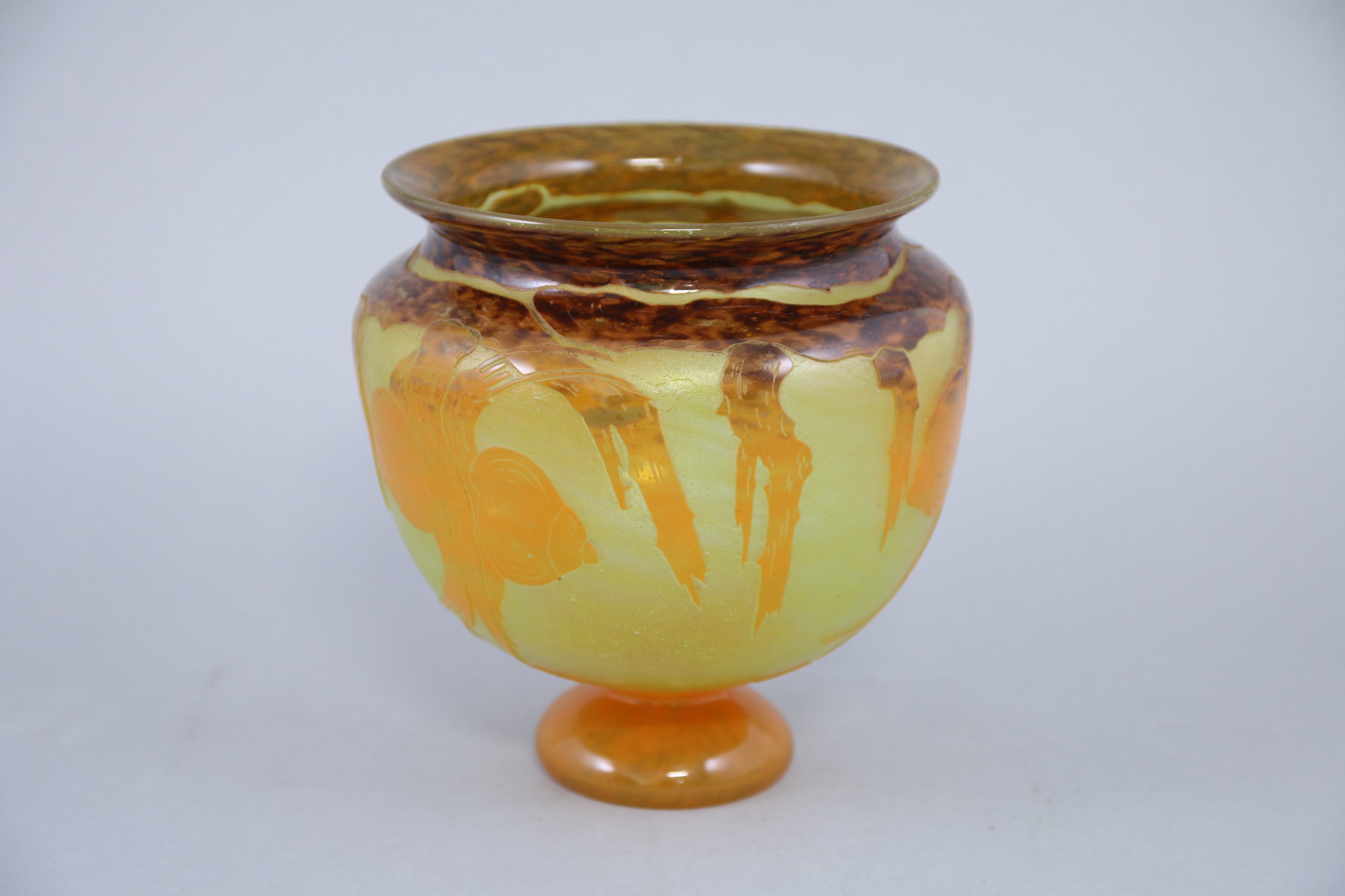 La panse renflée est décorée d'escargots et de branchages orangés sur un fond marmoréen jaune.
