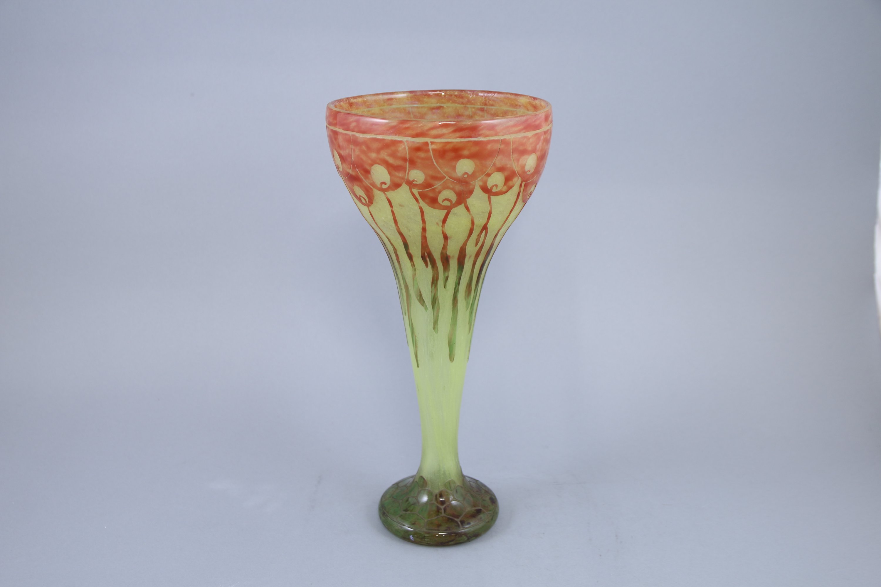 Verre multicouche à décor dégagé à l'acide de végétaux stylisés rouges et vert sur fond jaune marmoréen.