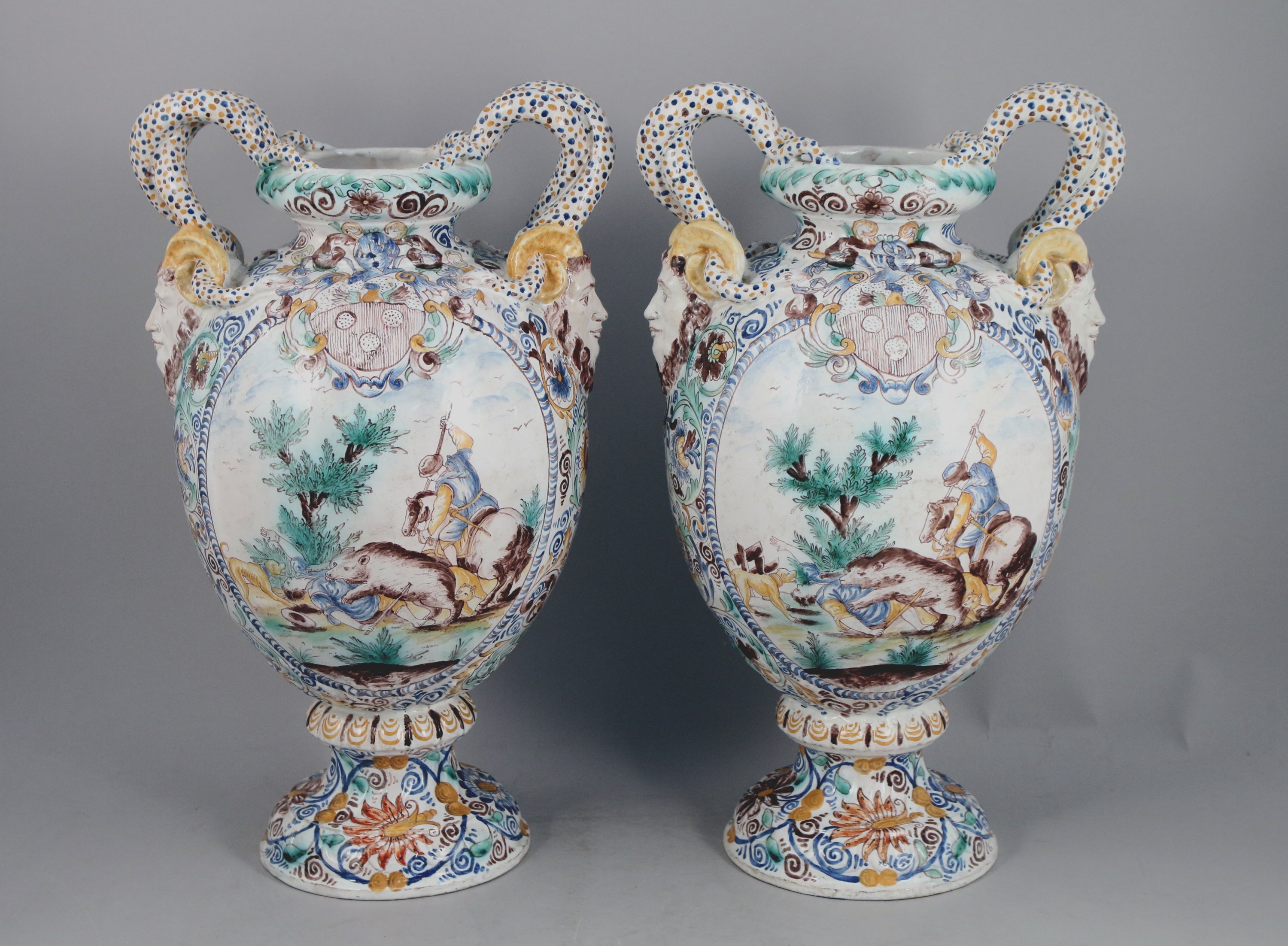 Faïence polychrome à décor de motifs floraux, à deux anses torsadées se terminant par des têtes de satyres. La panse offre un blason surmontant, sur une face, une scène de chasse à courre, sur l'autre une chasse à l'ours.