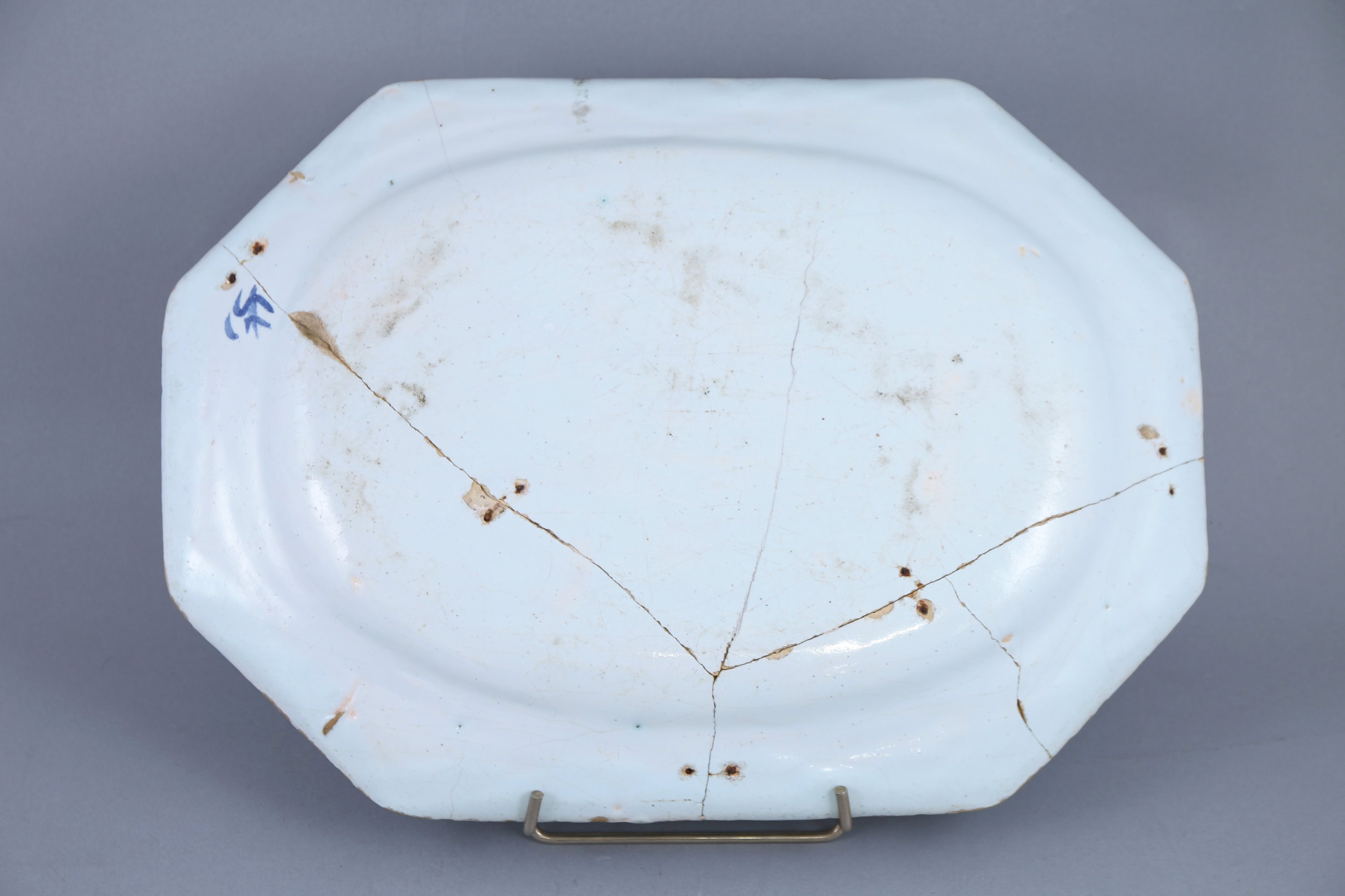 Faïence blanche à décor émaillé polychrome d'une panière fleurie au centre et l'aile ornée de cartouches de croisillons et motifs végétaux.