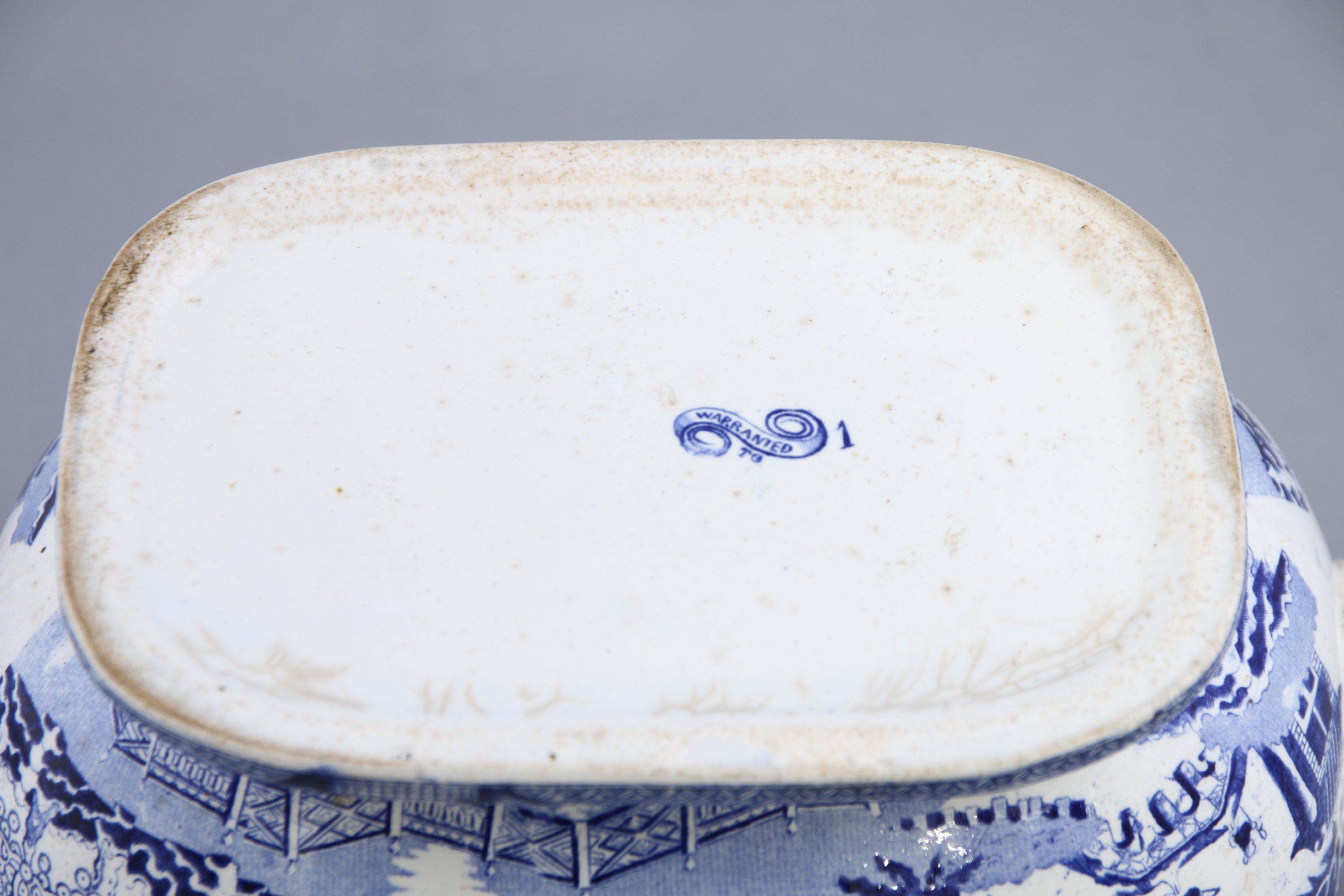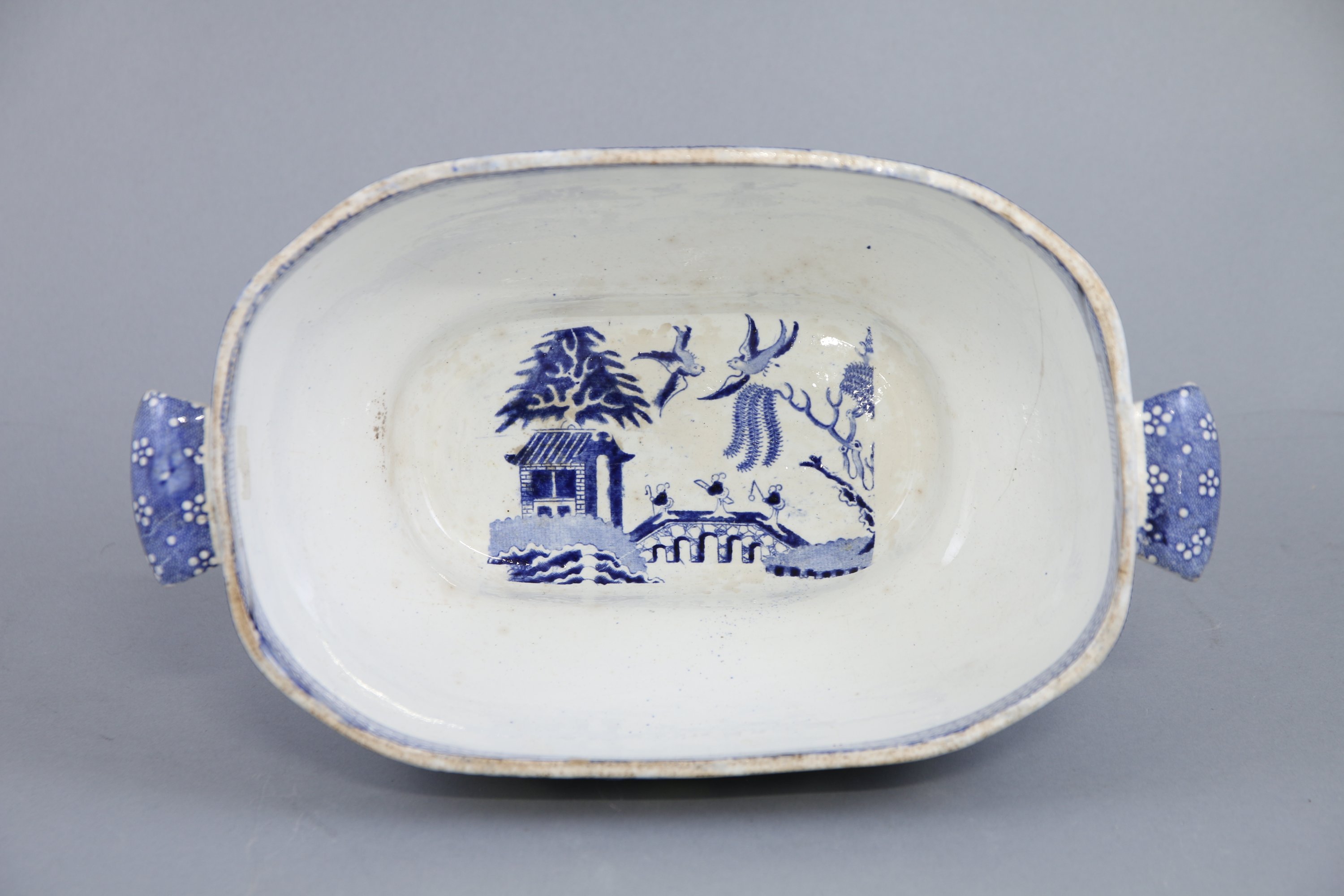 Joint : Angleterre - XIXe siècle. Soupière en faïence bleue et blanche dans le goût chinois à décor d'oiseaux et de scènes de palais. Haut. 14 Larg. 32,5 Prof. 18 cm. (accidents et restaurations).