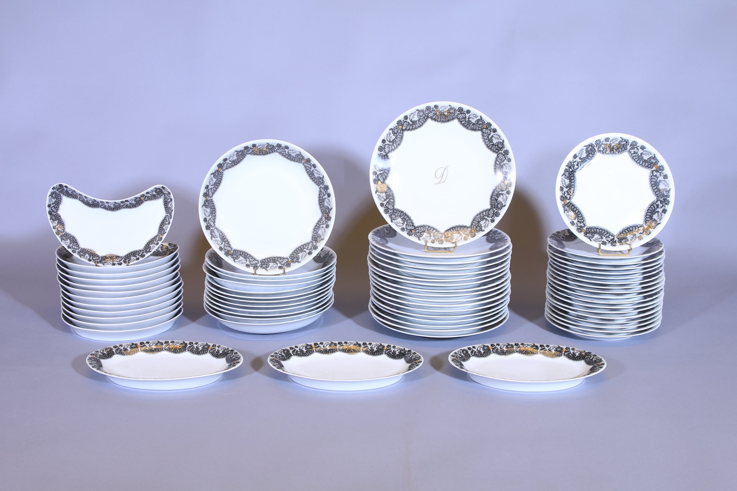 De 81 pièces en porcelaine de Limoges comprenant : 24 assiettes plates dont une peinte à la main, 24 assiettes à dessert, 12 assiettes creuses, 15 raviers, trois plats, un saladier et un plat à tarte.