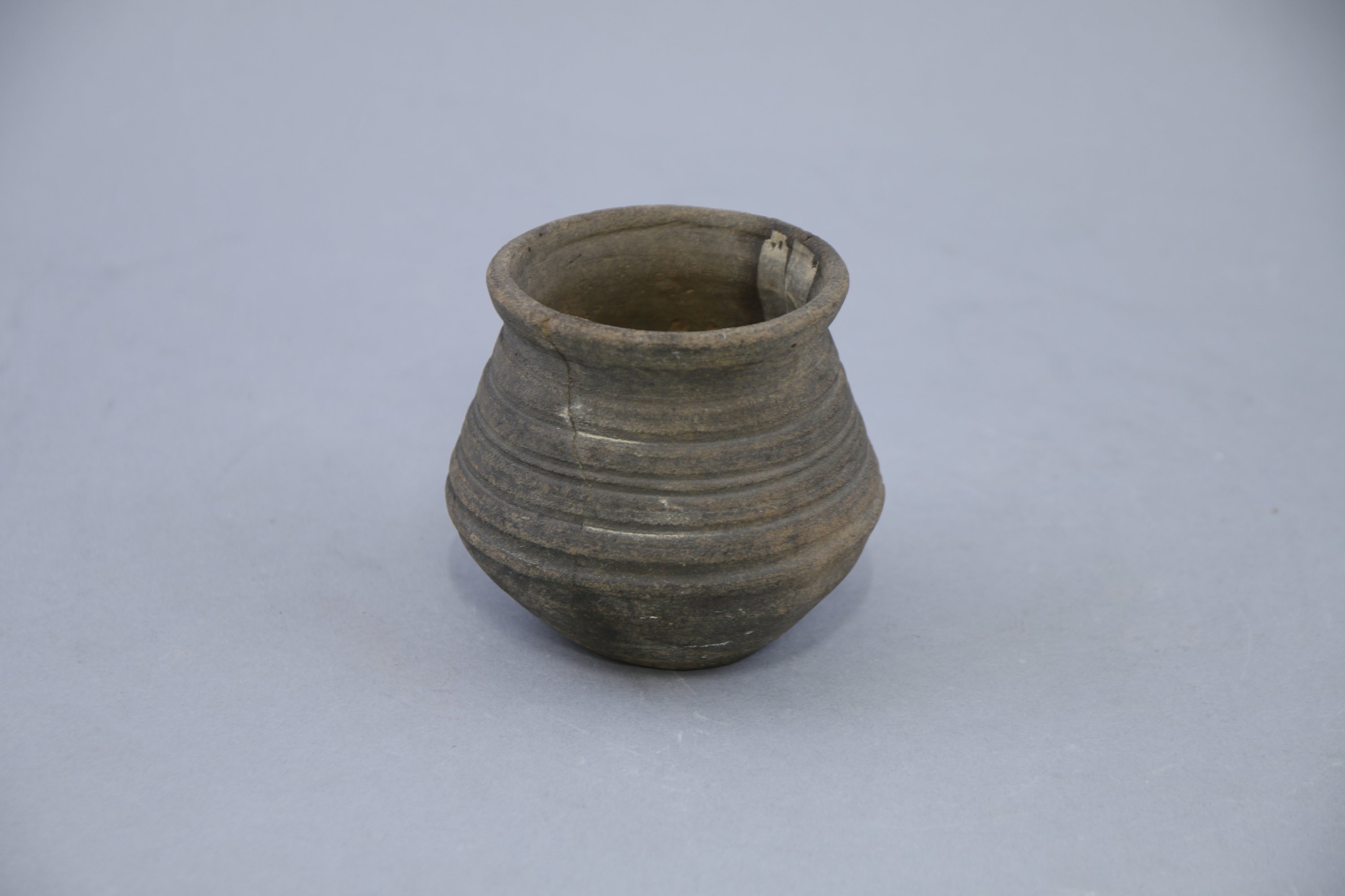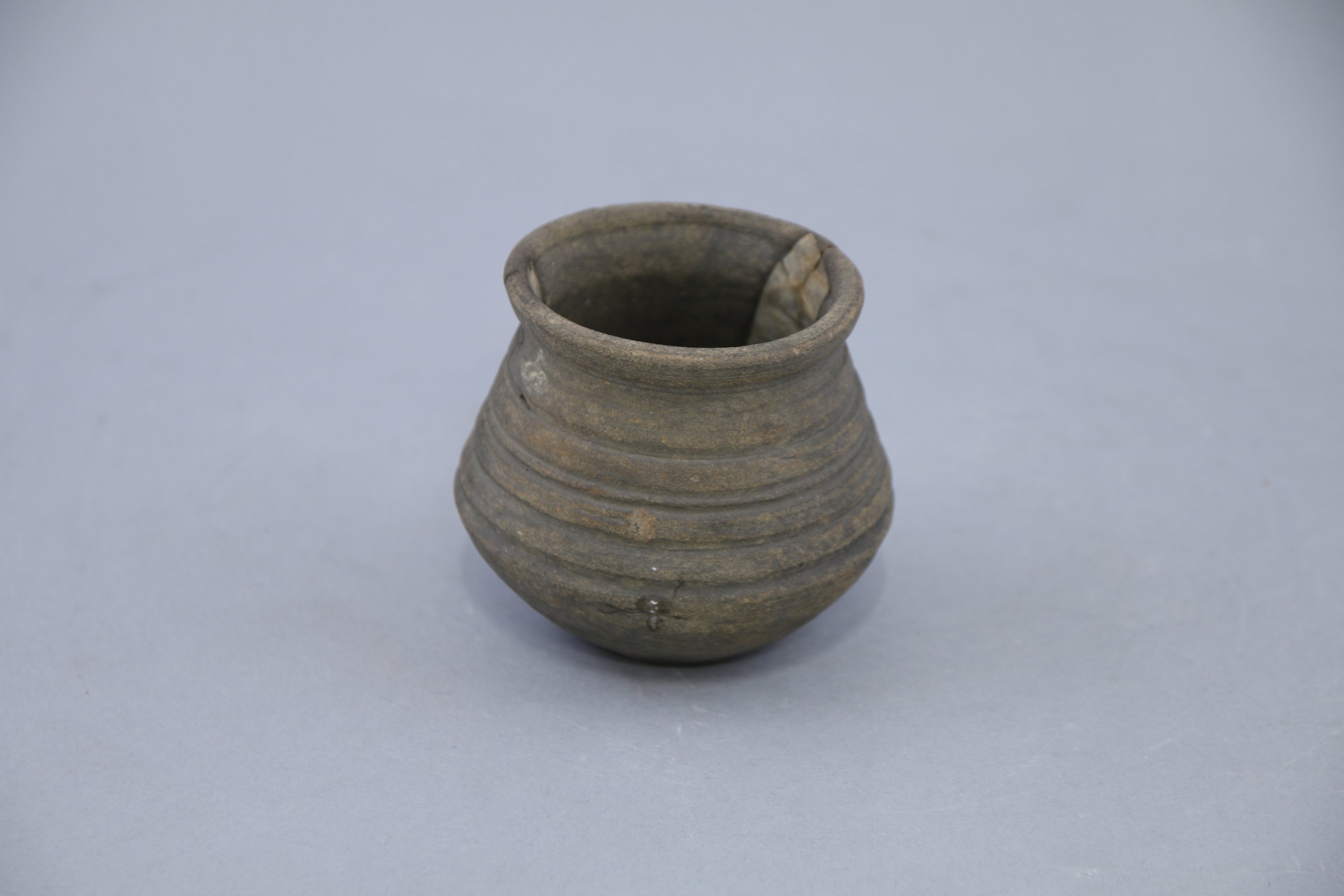 Céramique grise ornée de sillons concentriques sur la partie supérieure. Etiquette imprimée collée sous la base indiquant : « ) Sablonnière 1876 » avec ajour manuscrit « 5 juillet ».