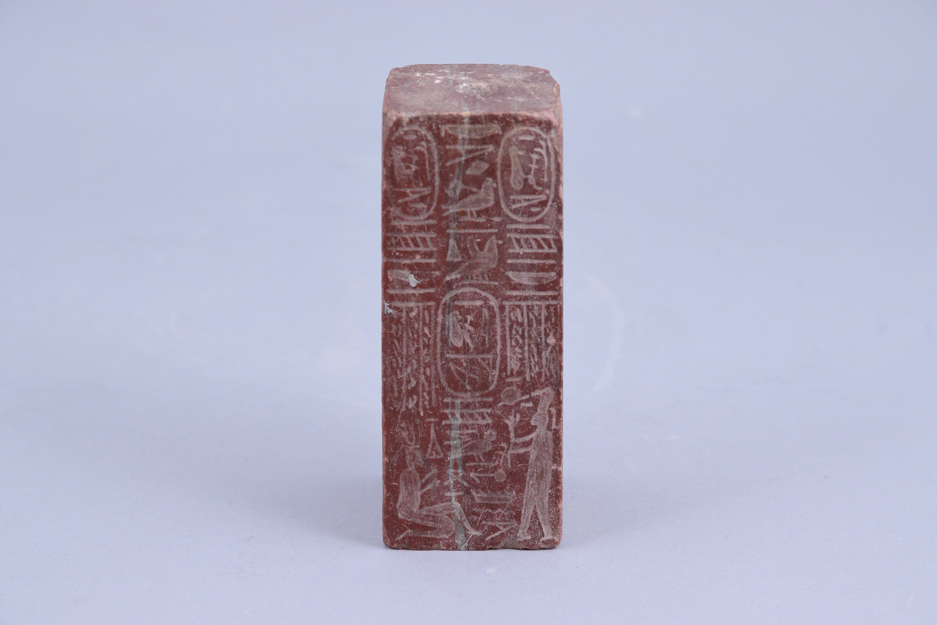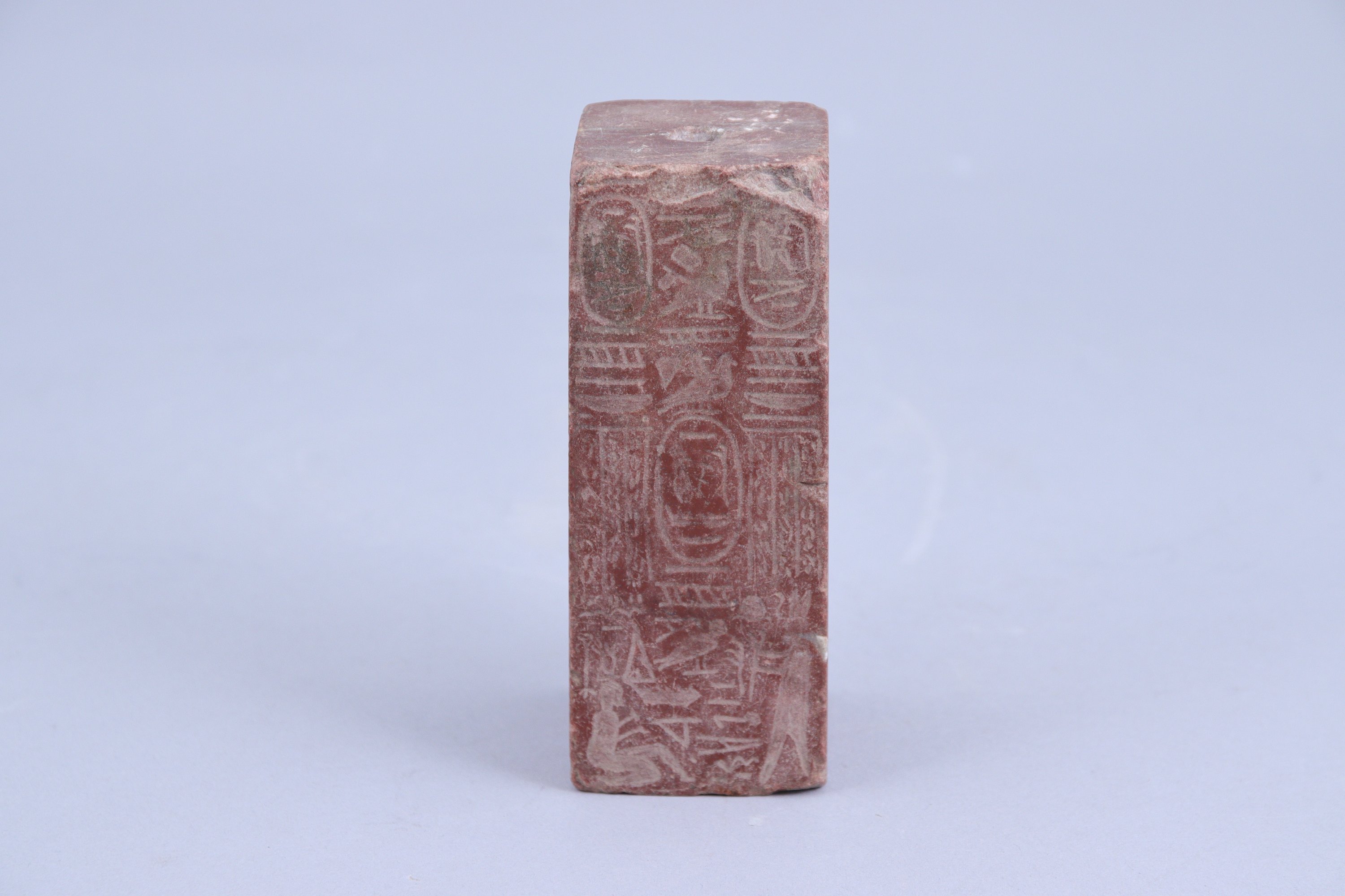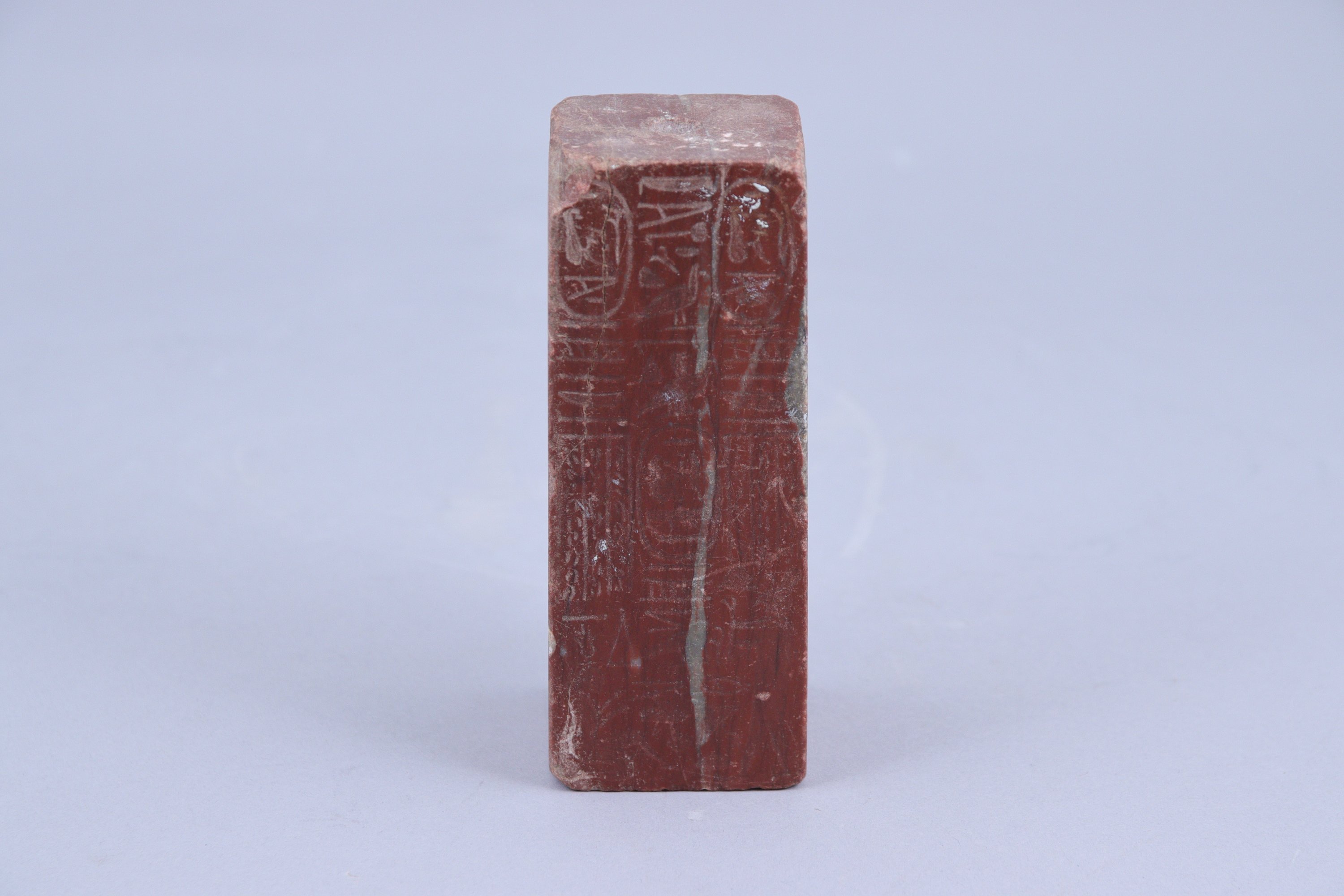 Pierre rouge orné sur ses quatre faces de hiéroglyphes dans le style antique, dont celui de Ramsès II.