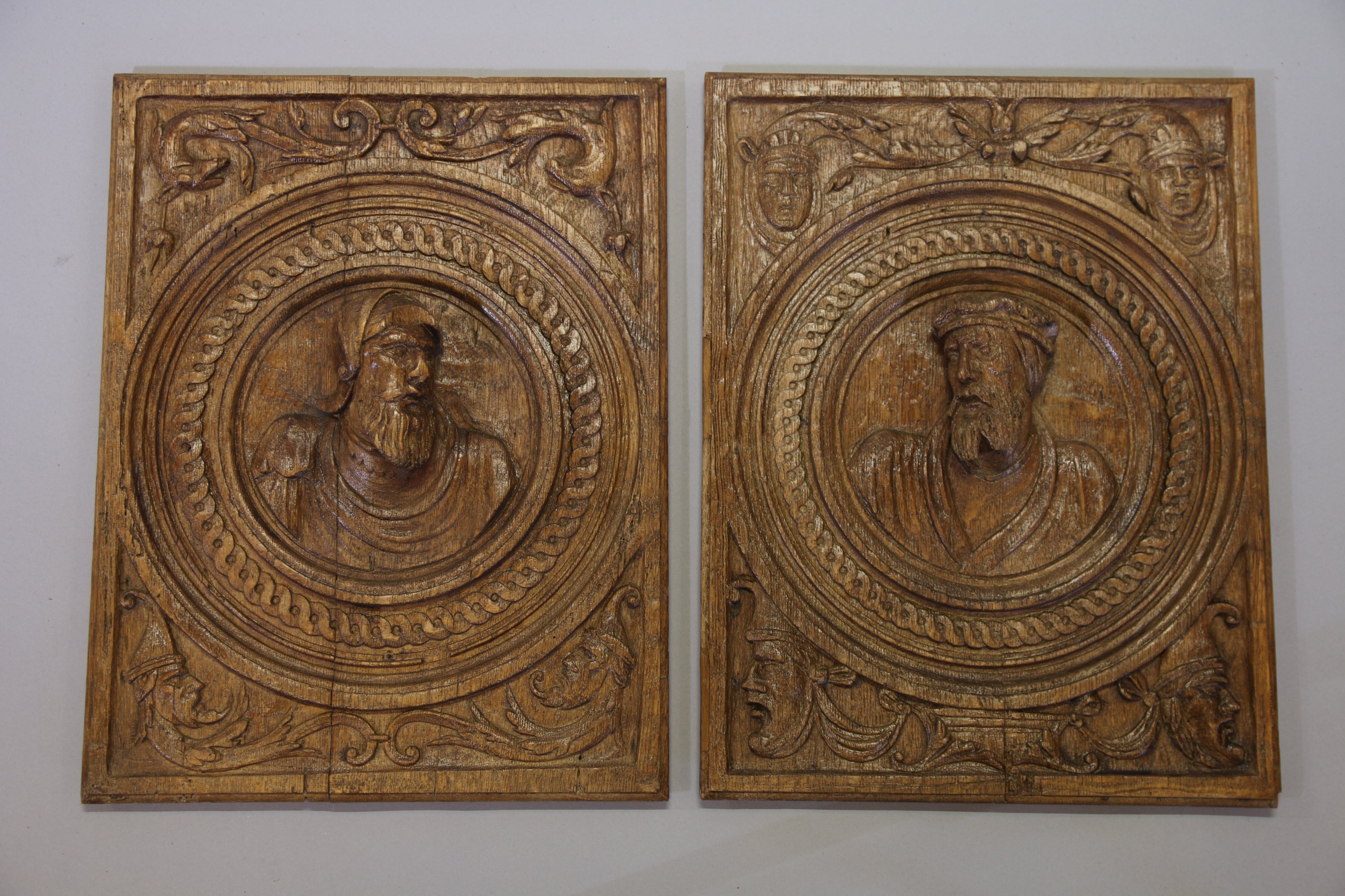A décor de bustes d’homme barbu, possiblement Léonard de Vinci, dans des réserves circulaires ornées d’entrelacs, l’un casqué et drapé à l’antique, l’autre coiffé d’une toque et revêtu d’un manteau ; écoinçons meublés de grotesques feuillagées.