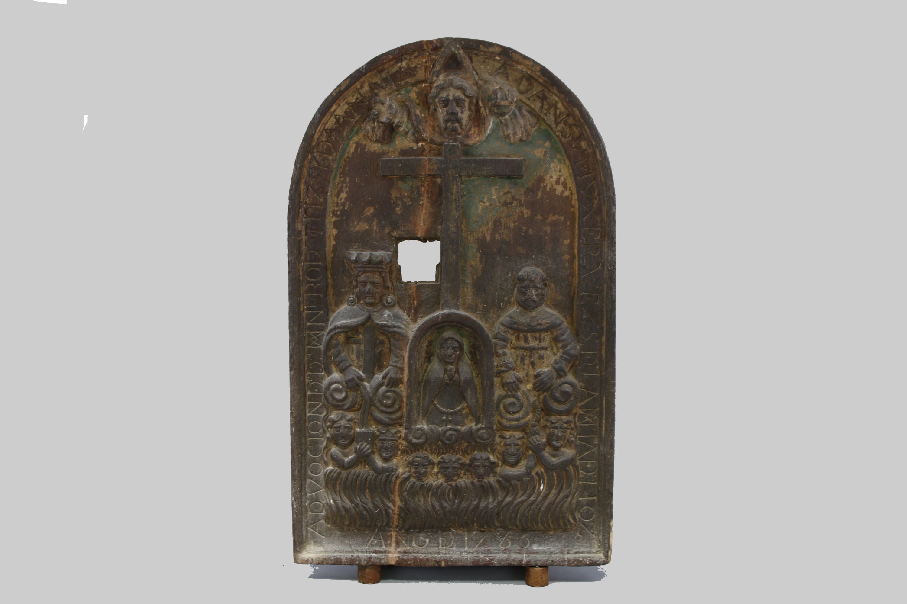 Proposition d’interprétation : Dieu le Père surmontant la Croix ; au pied, une carmélite en prière sous une arcature entourée vraisemblablement, à gauche, de saint Simon Stock donnant aux âmes du Purgatoire le scapulaire qu’il avait reçu de Marie et, à droite, d’un saint franciscain dont la cordelière est saisie par deux âmes. Inscription tout autour AD VOCION DDN [AM] NI RODz TORIZs YDA ANNIA ADANSUMUXER VEZS D L A [AM] TADHOZ ANO D 17[?]3.