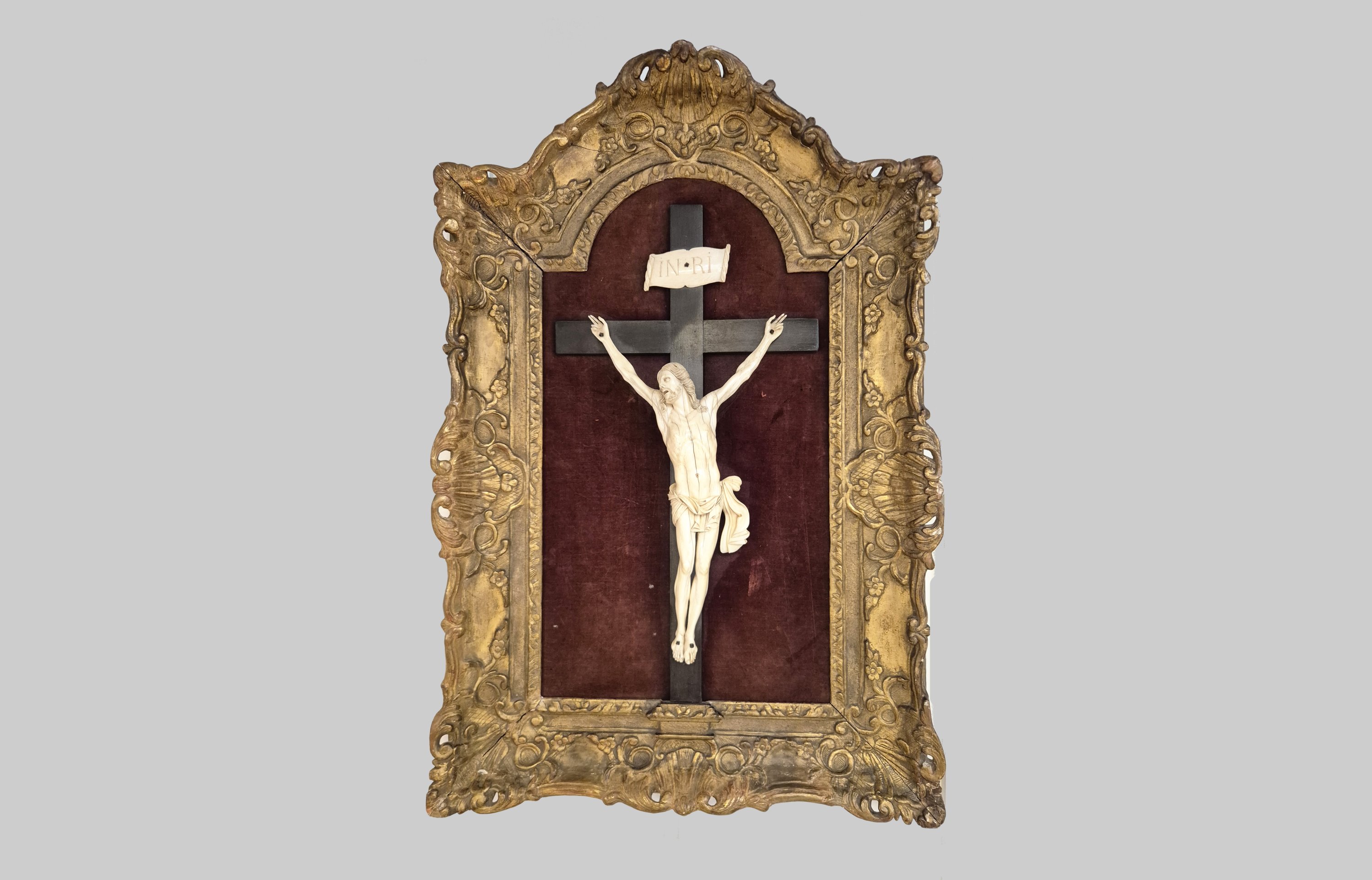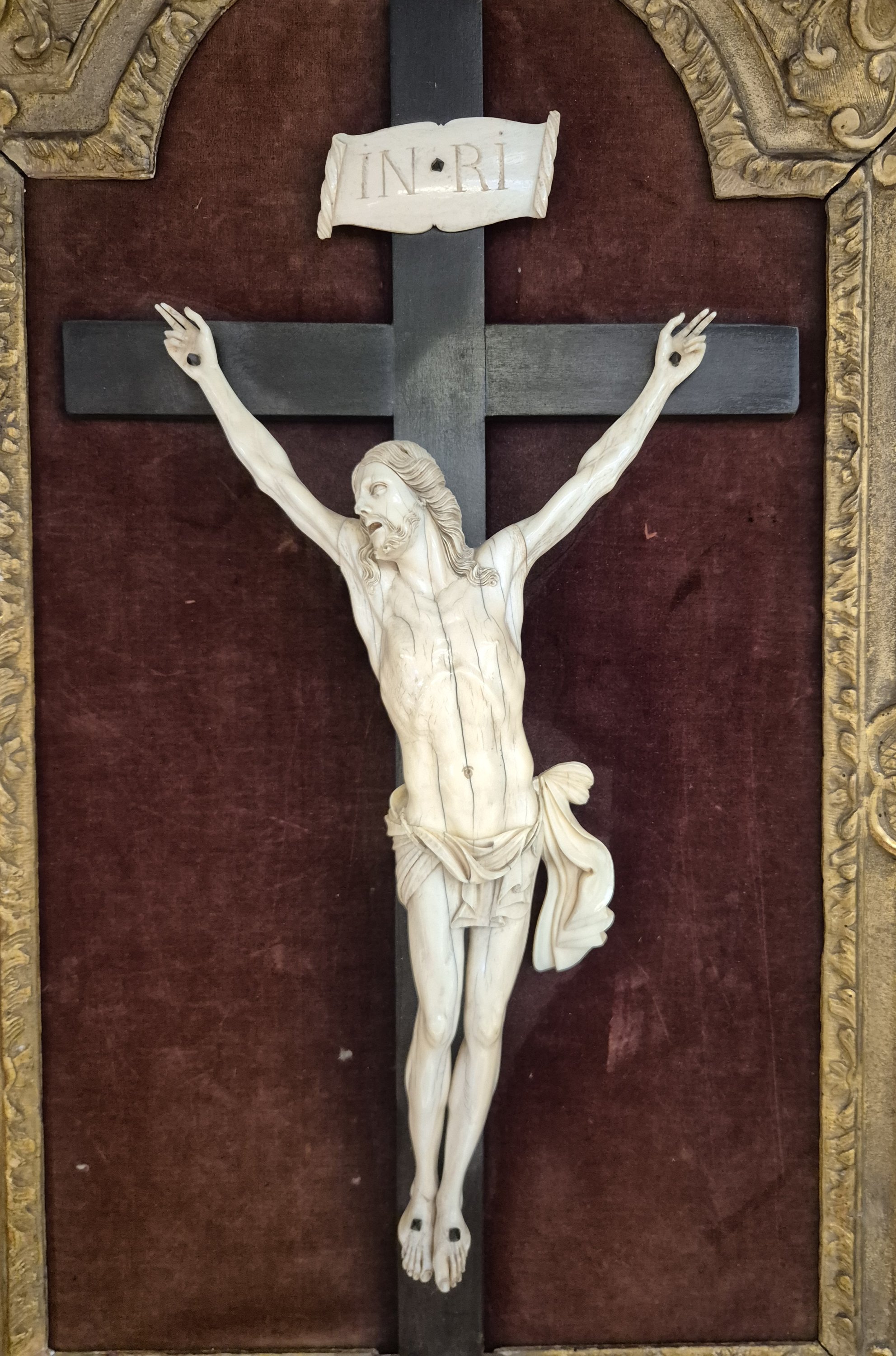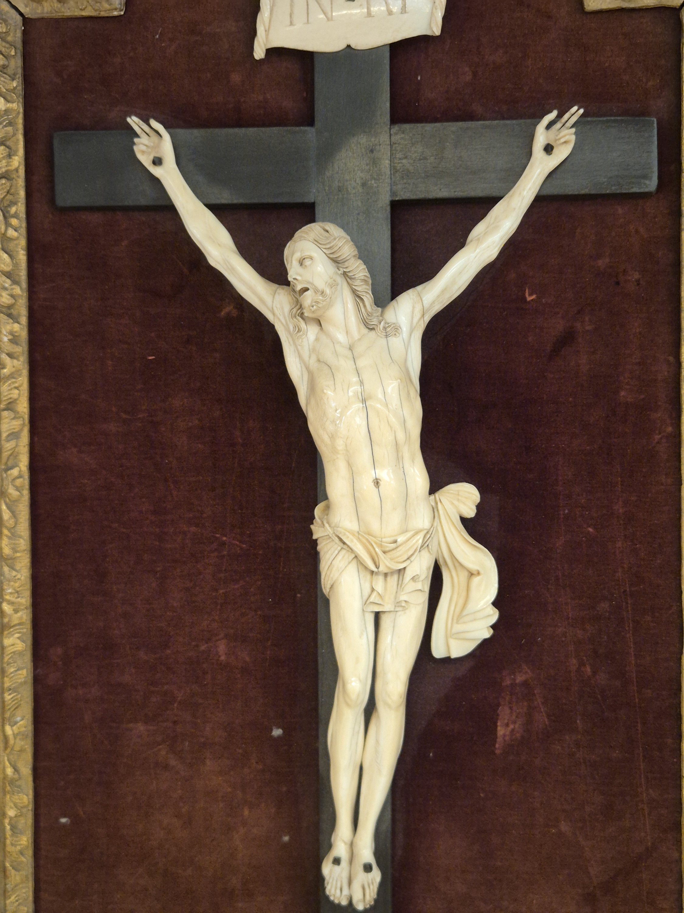 Bouche ouverte, les yeux levés vers le ciel, chevelure tombant sur les épaules en mèches ondulées, périzonium court noué sur la hanche gauche, jambes légèrement fléchies et pieds juxtaposés. Titulus également en ivoire.