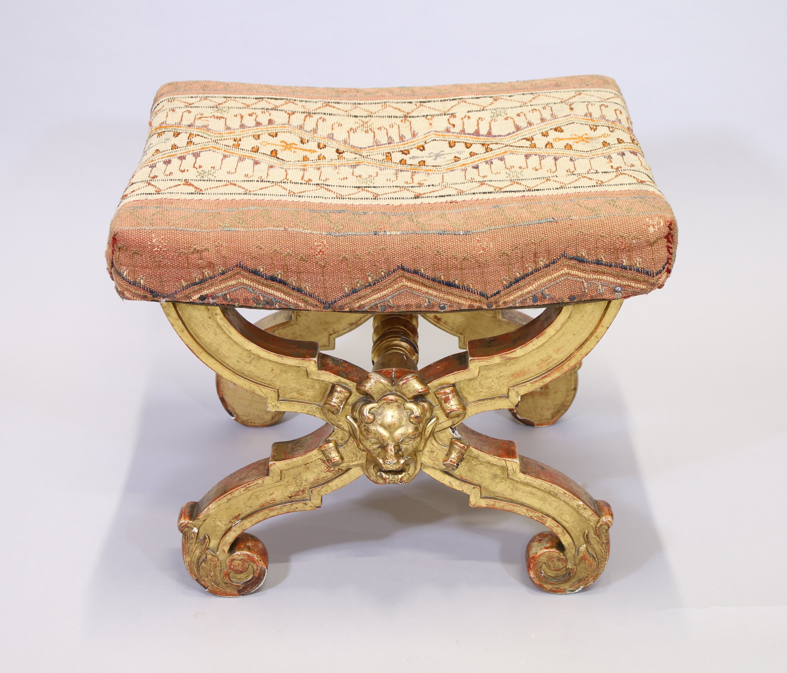 Quatre pieds en X décorés au centre d'une tête de faune et terminés par des feuilles d'acanthe. Ils sont réunis par une barre d'entrejambe en bois tourné.