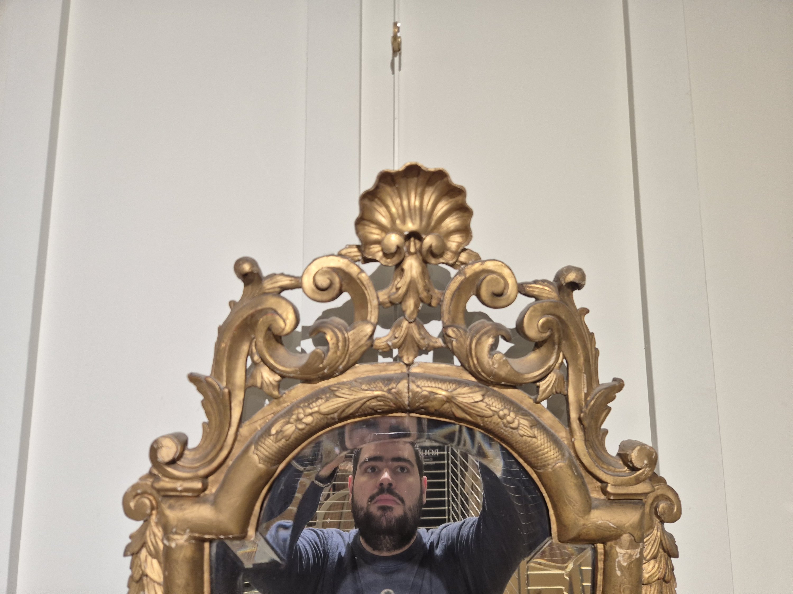 Il est coiffé d'un fronton ajouré à décor d'une coquille entourée de rinceaux et feuilles d'acanthe se prolongeant sur les côtés par des motifs floraux sur fond de croisillons. La partie inférieure se termine par un masque grimaçant dans des feuillages.