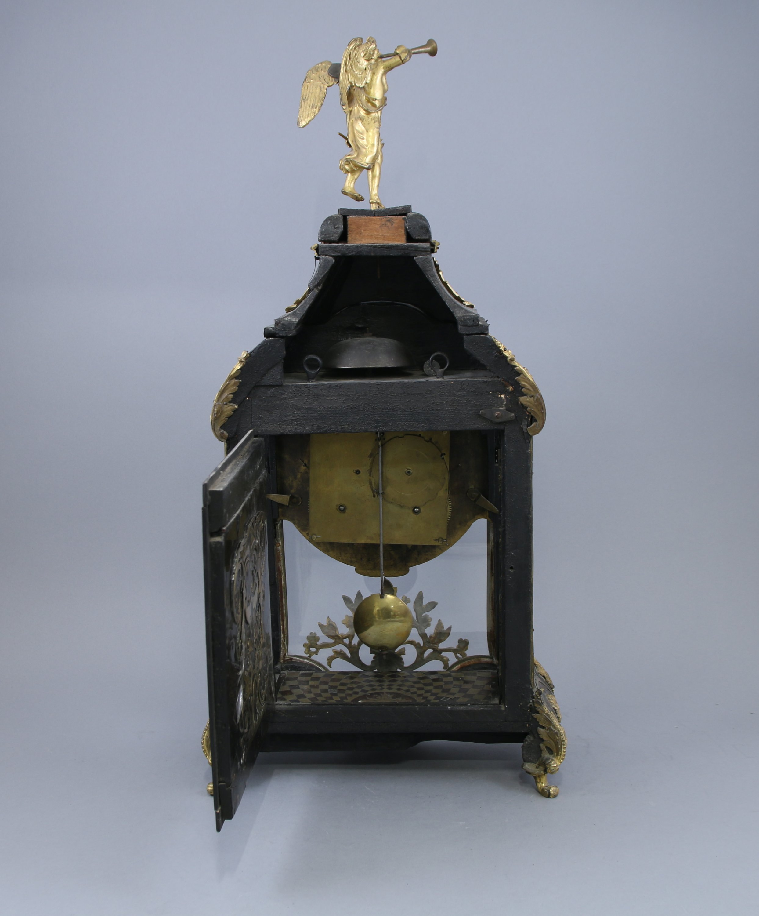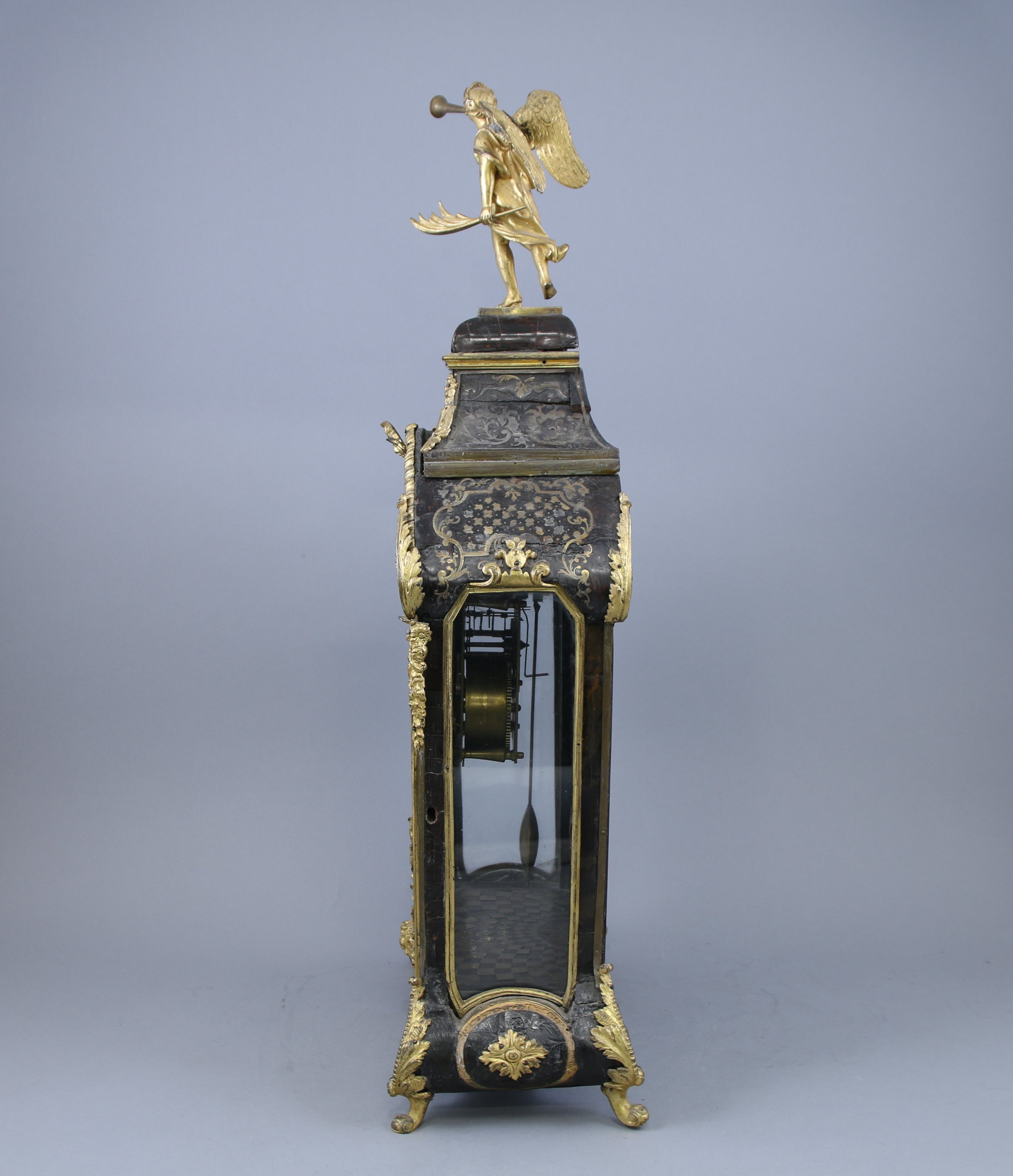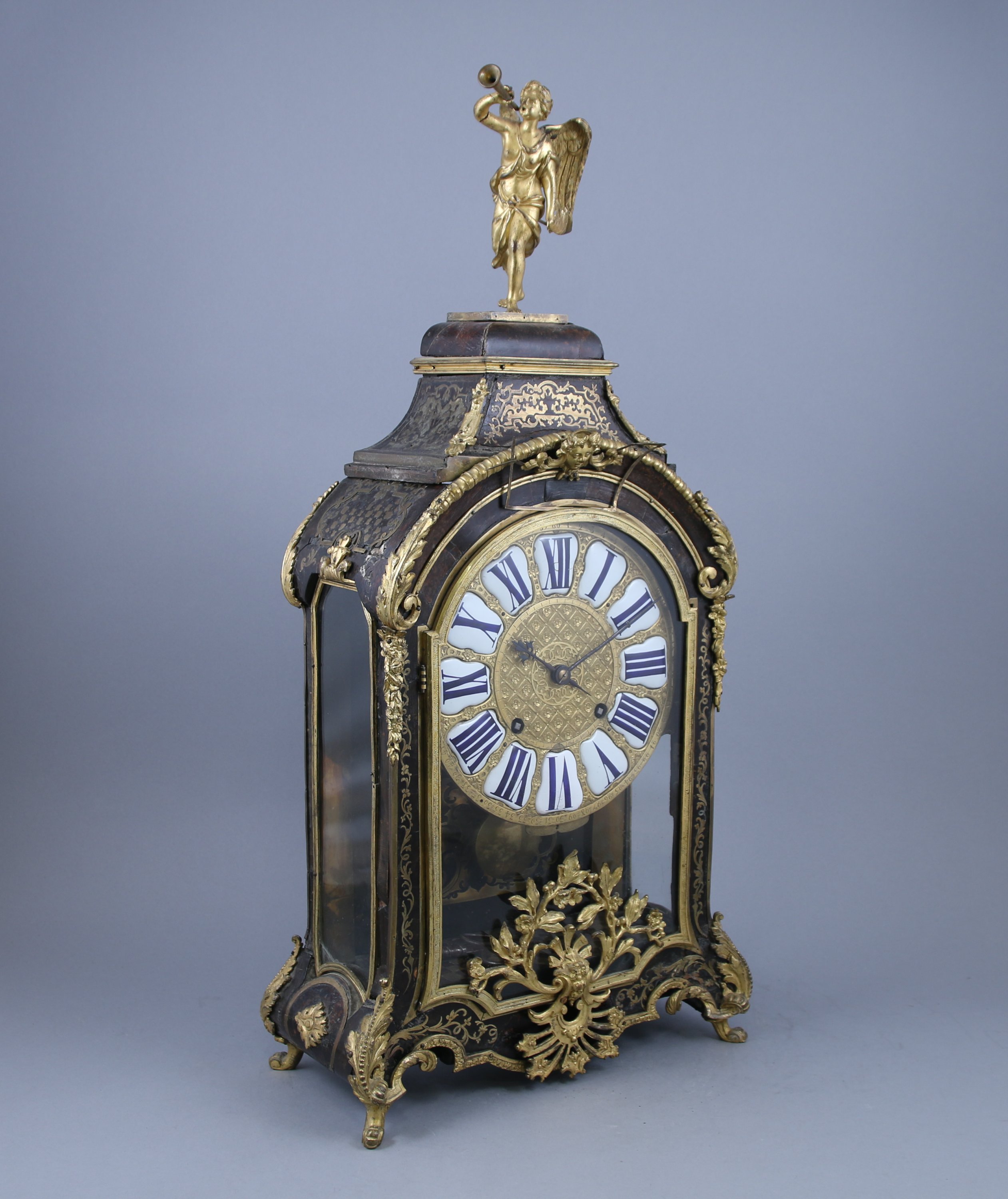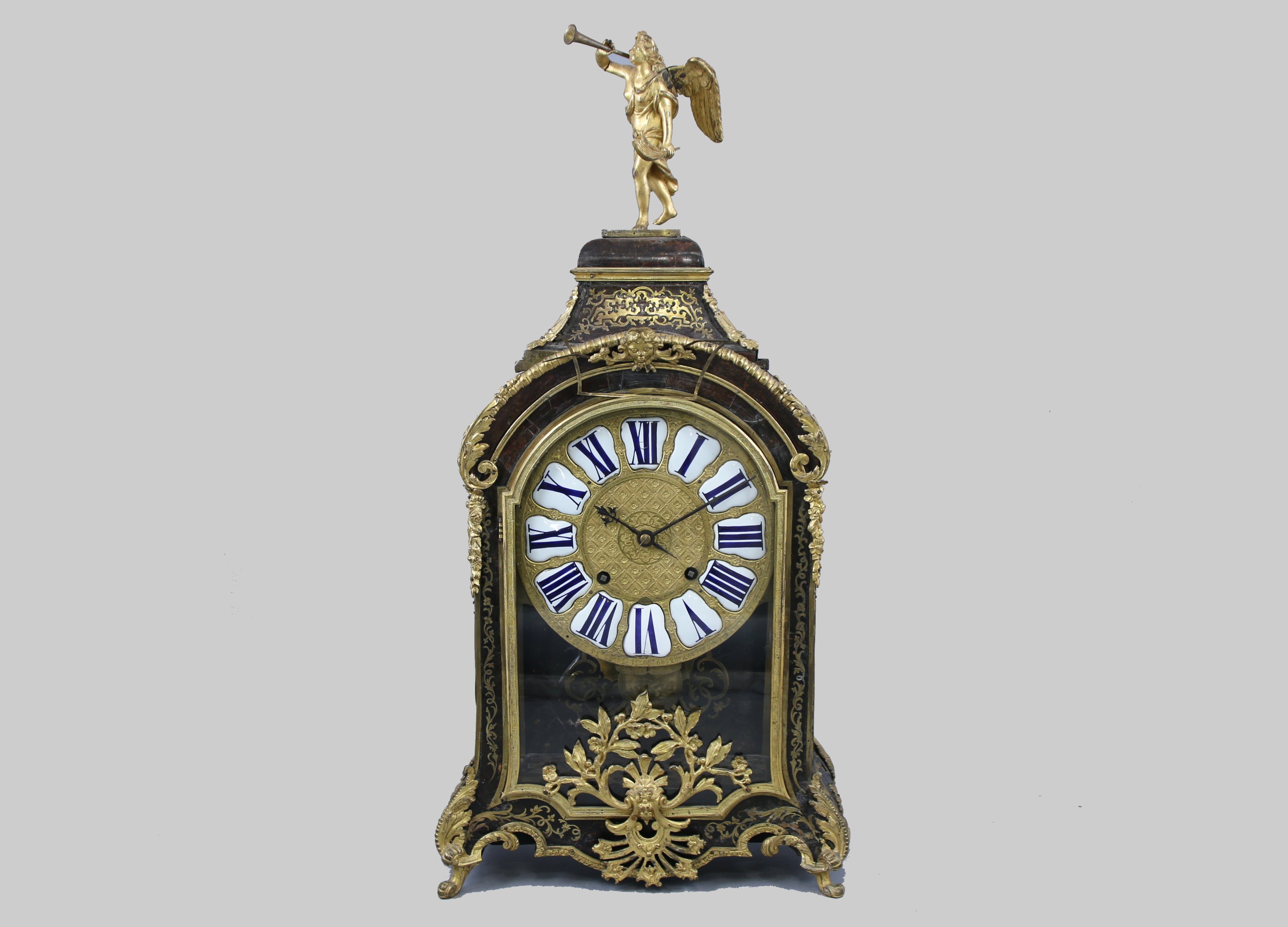 Le cadran indiquant les heures par des cartouches aux chiffres romains. La partie supérieure sommée d'une renommée. Le cul de lampe à décor d'une figure d'Apollon.