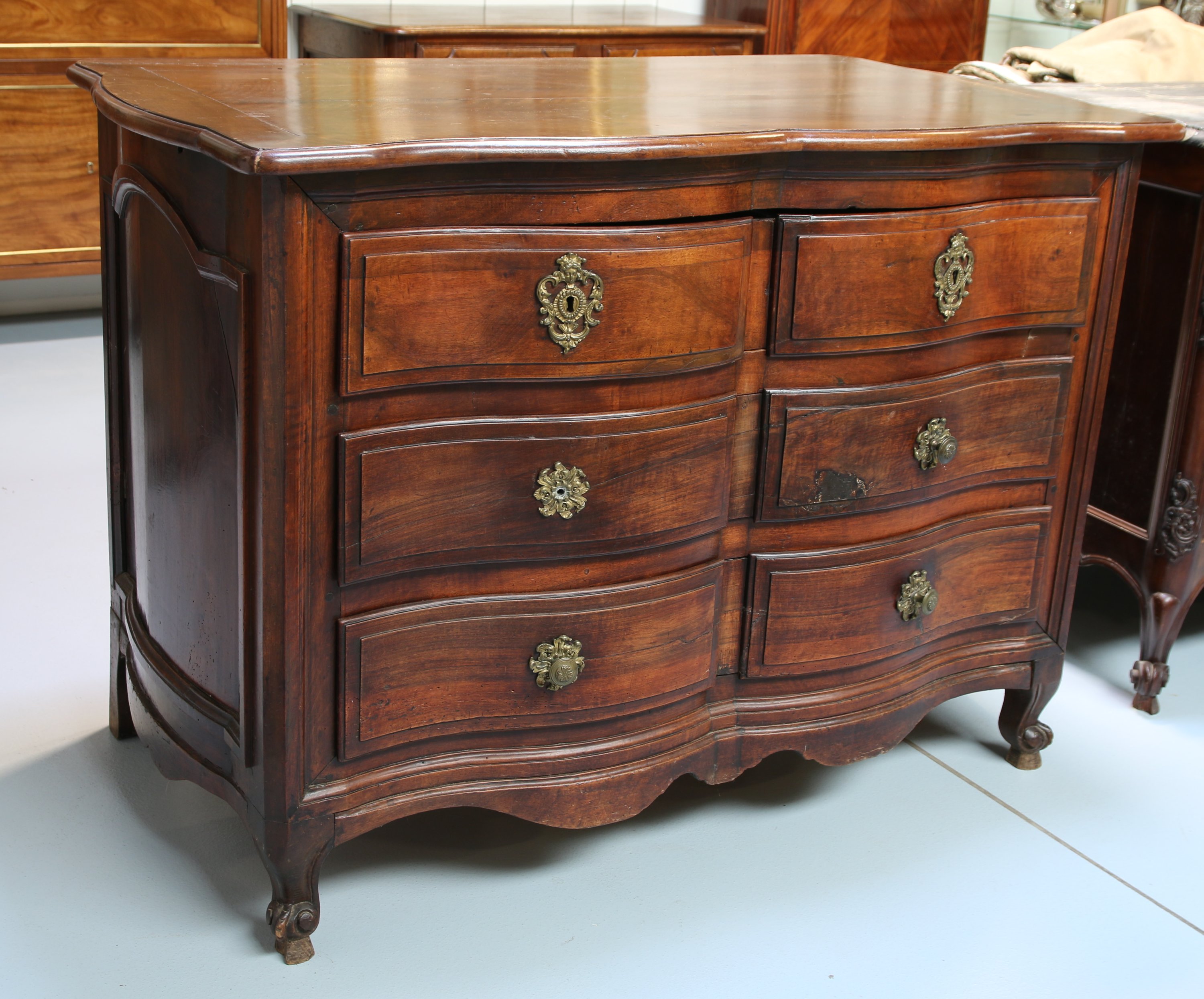 Elle ouvre par quatre tiroirs sur trois rangs. La centure chantournée et les pieds antérieurs cambrés.