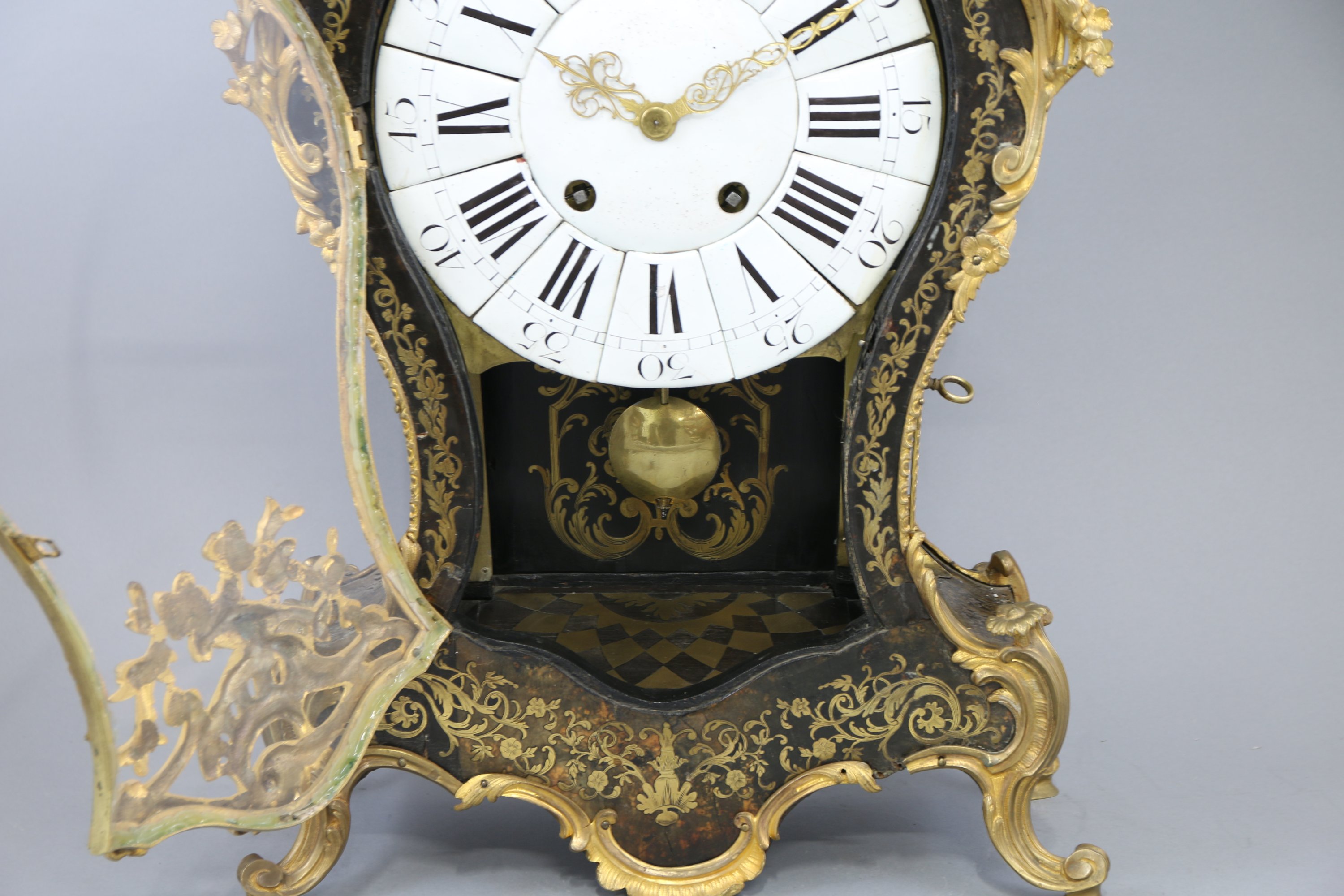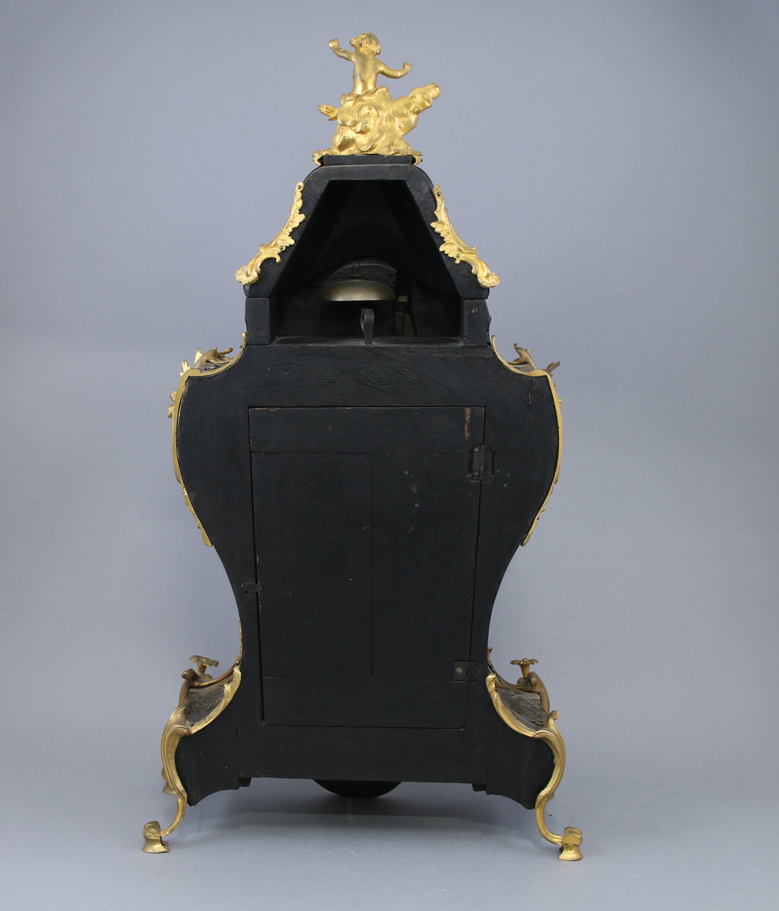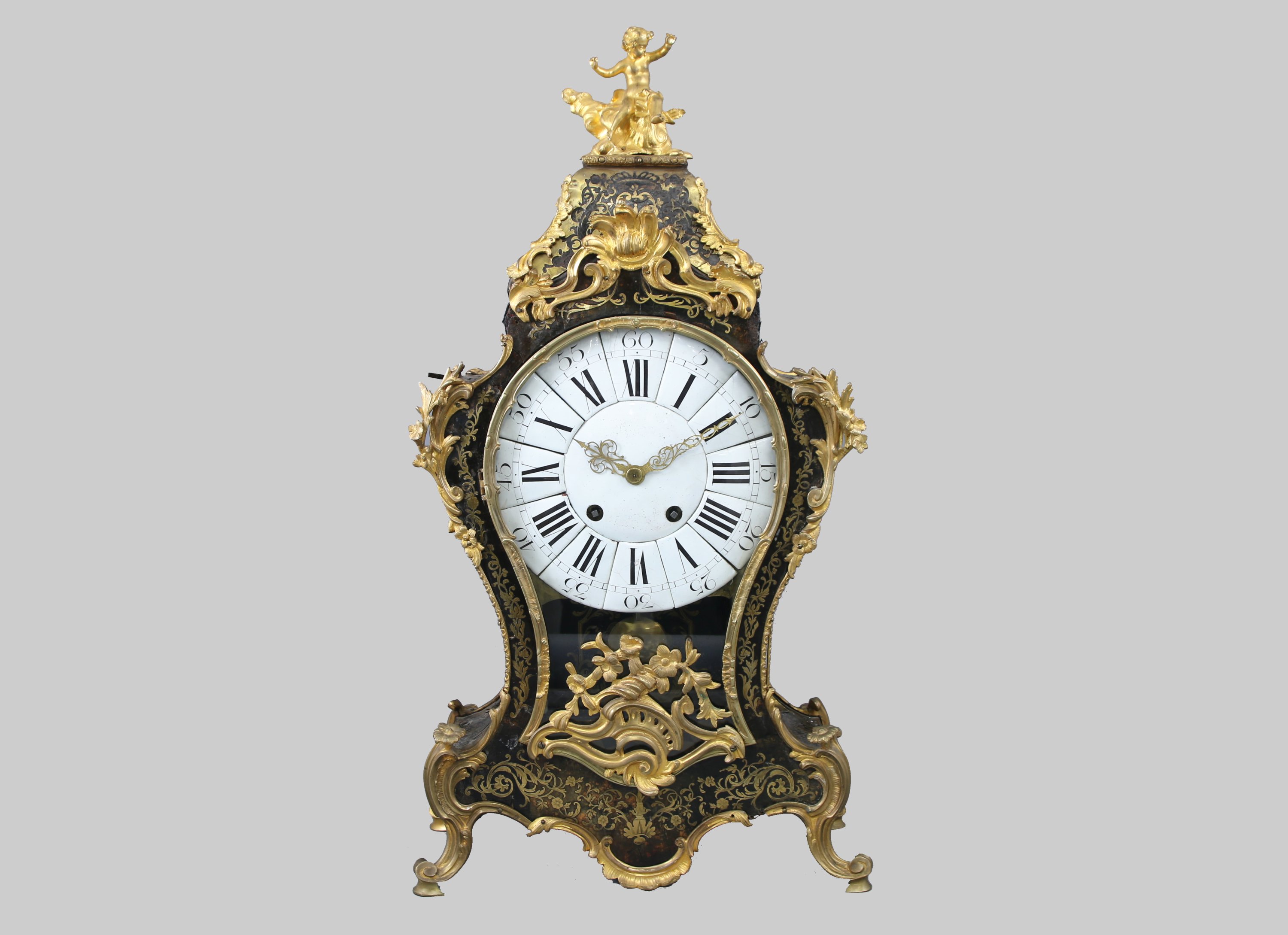 Cadran émaillé à chiffres romains et arabes. Il est coiffé d'un amour et son carquois et de feuilles d'acanthe. Quatre pieds mouvementés. Le revers ouvrant par une porte décorée de rinceaux et découvrant un intérieur à fond de pavés simulés.