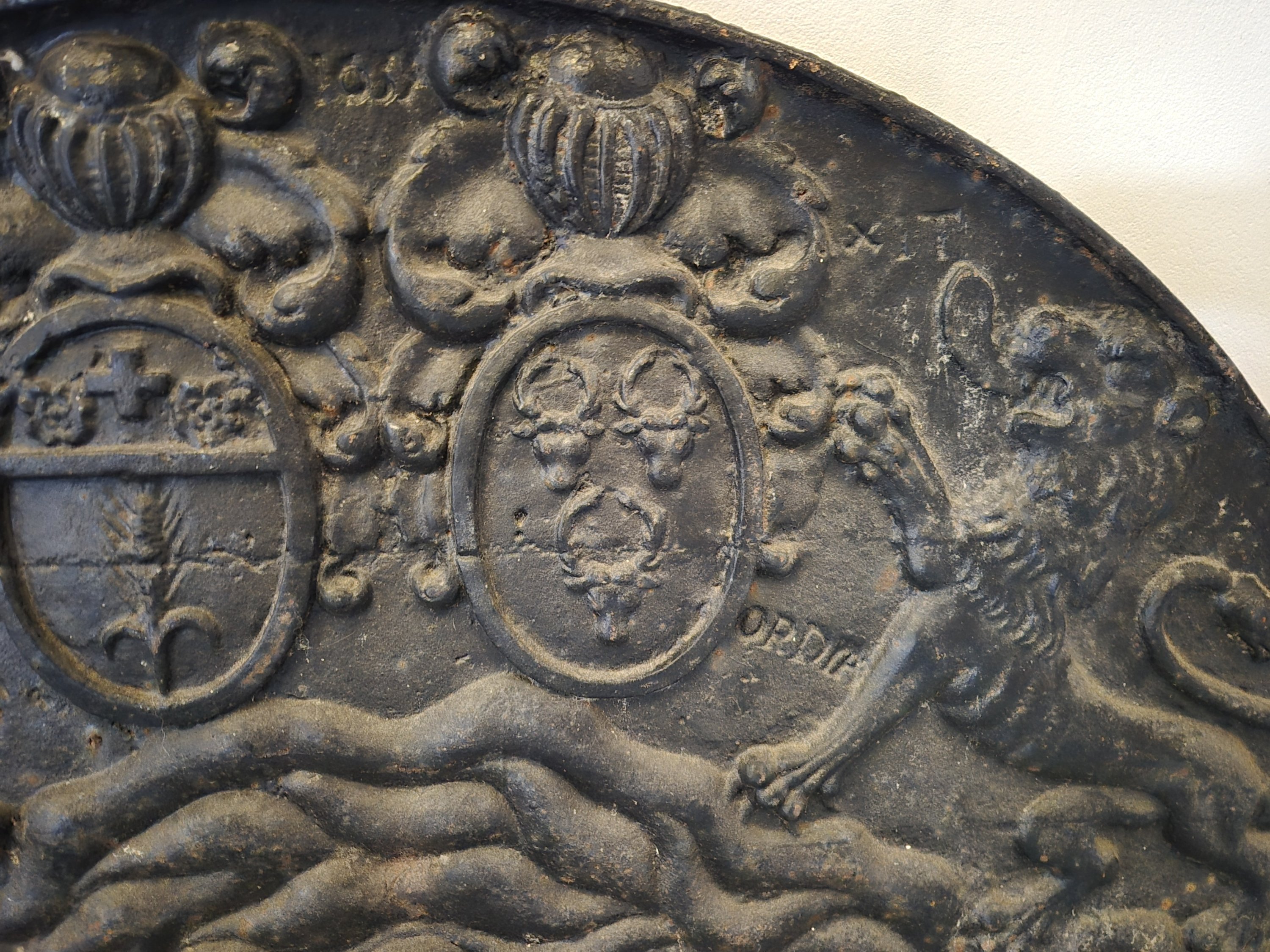 La partie supérieure en plein cintre, elle présente un décor de deux lions affrontés à armes d'alliances, notamment de la famille Richoufftz de Manin.