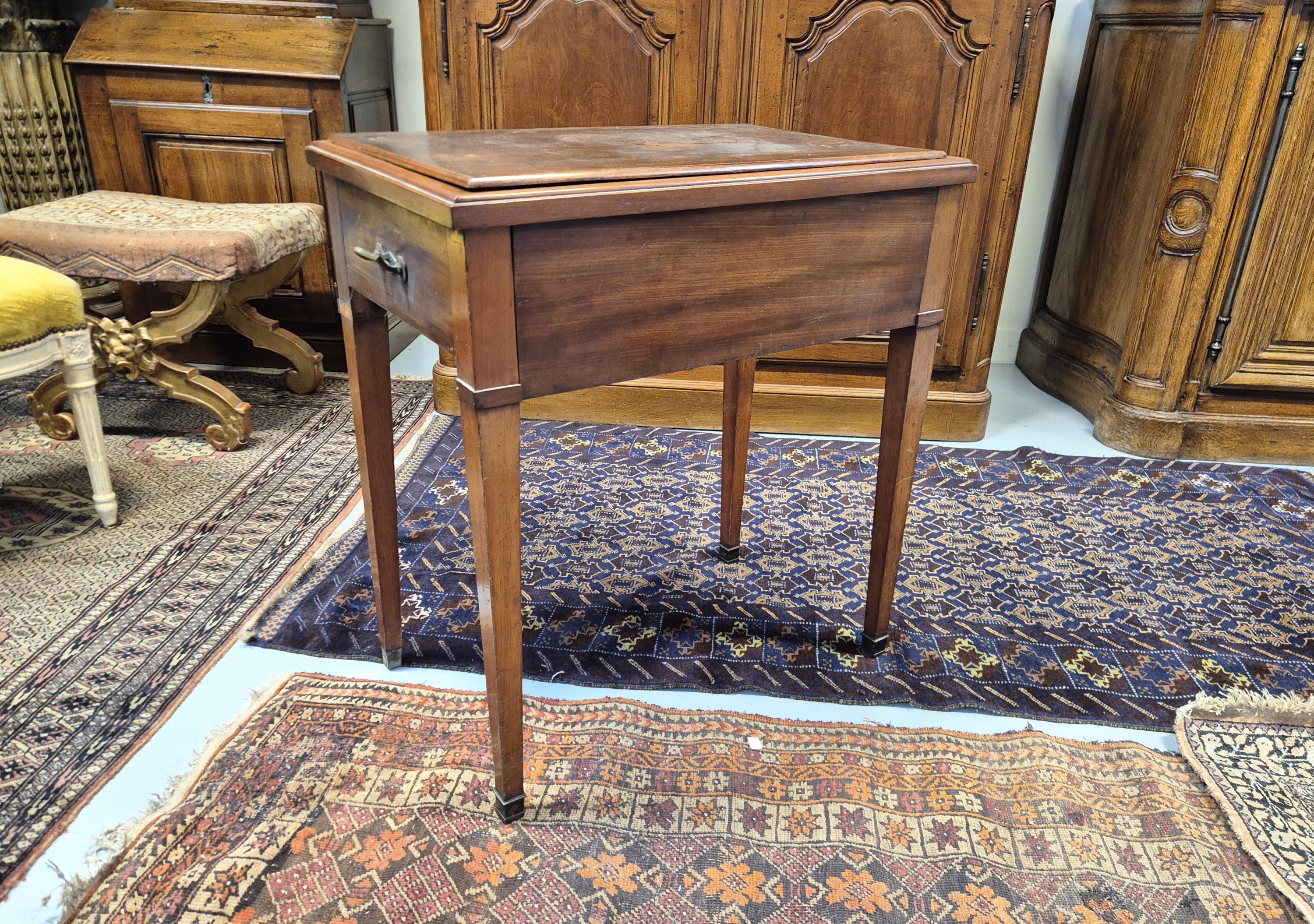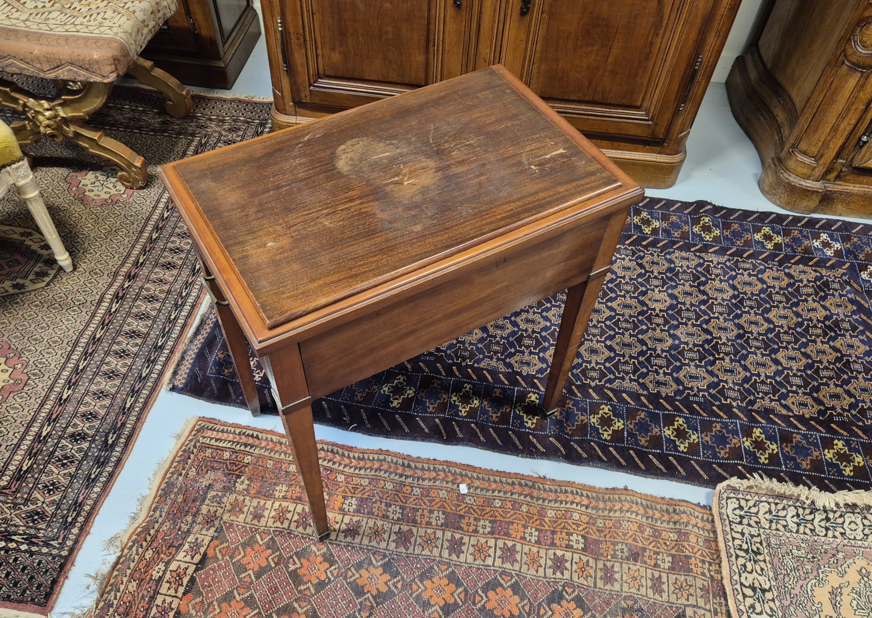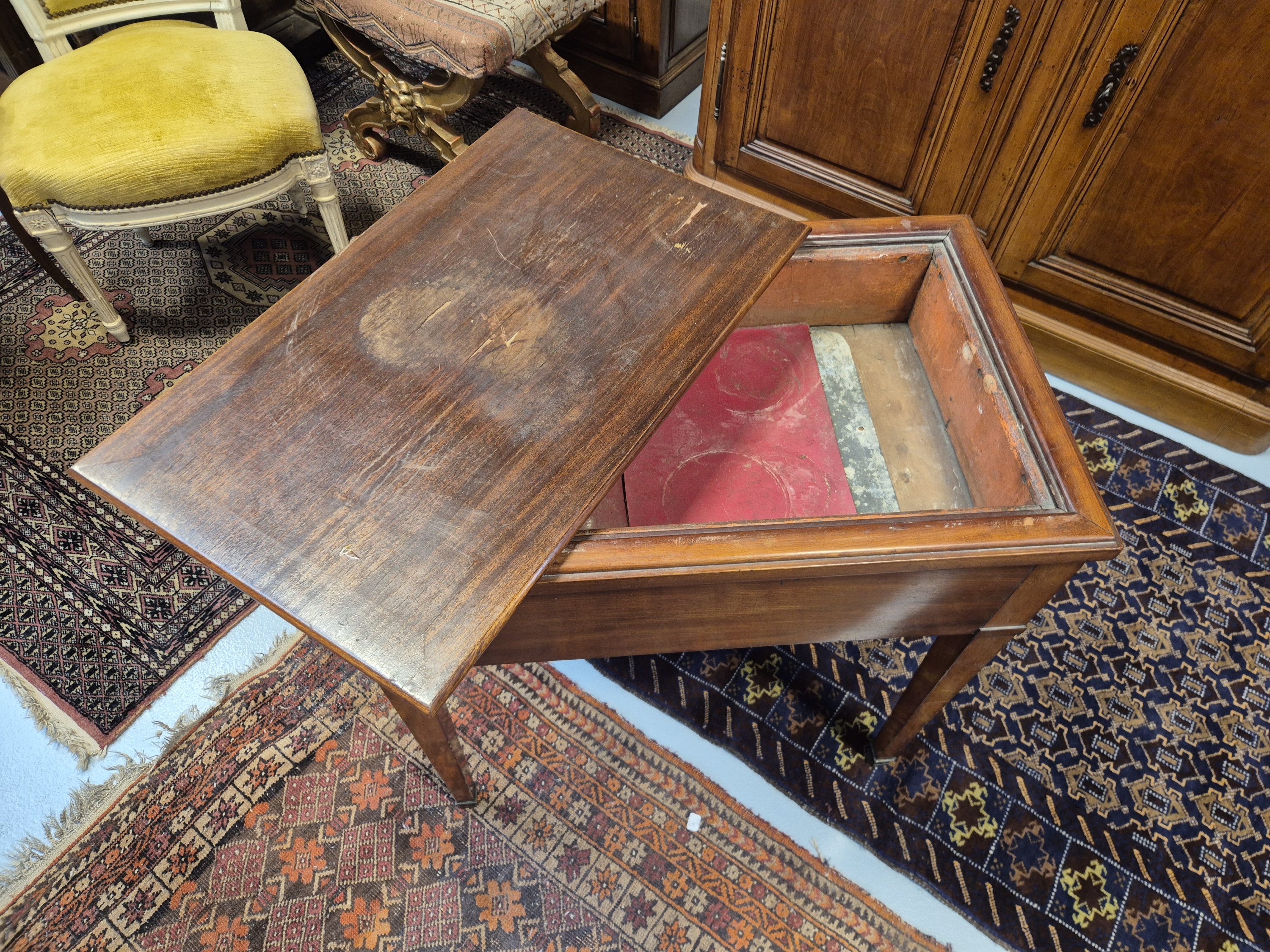 De forme rectangulaire, elle repose sur quatre pieds en gaine sabotés de laiton. Recouvert d'un couvercle en placage d'acajou.