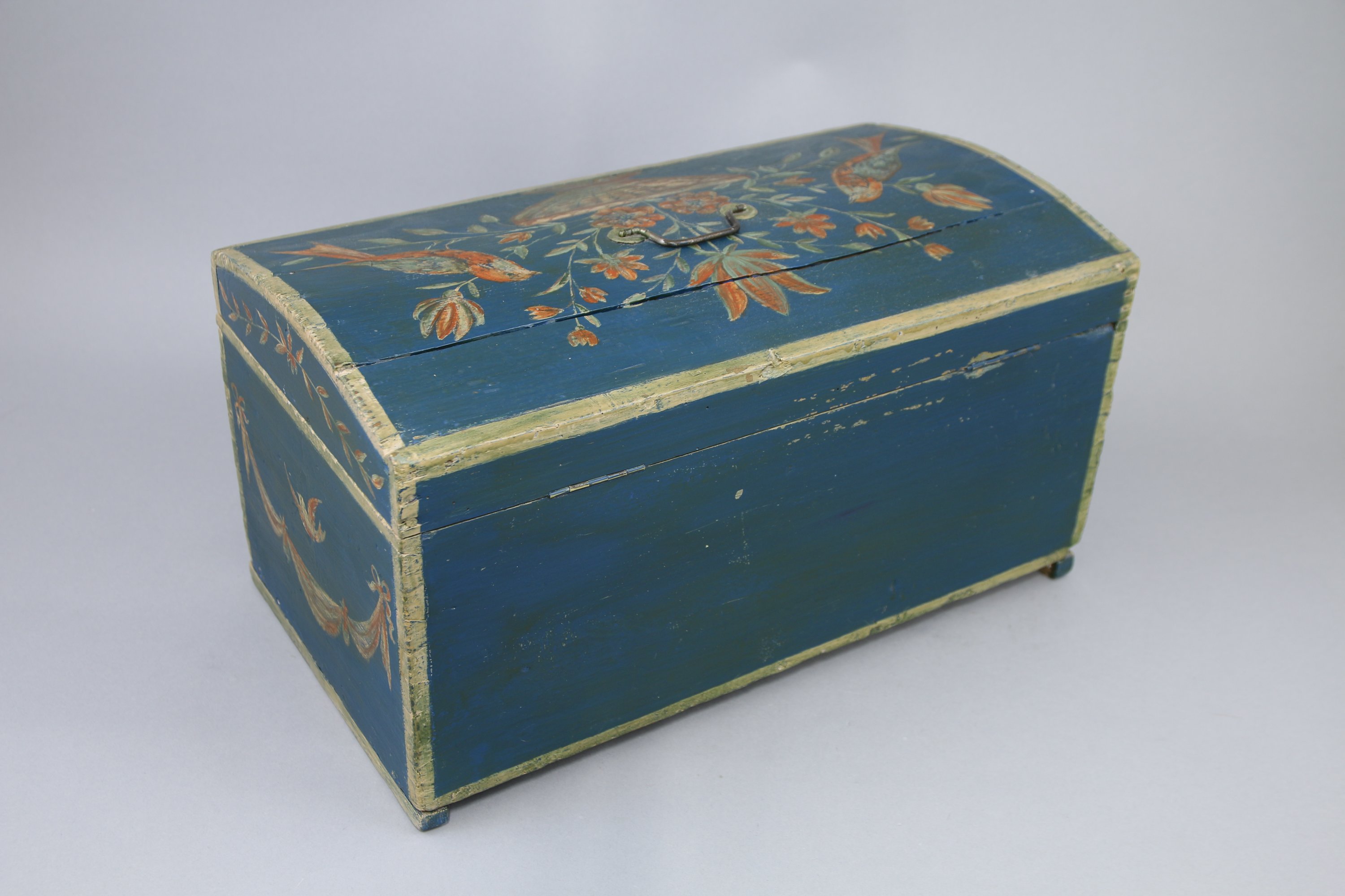 Le couvercle bombé à décor de deux oiseaux autour d'un vase fleuri. La façade ornée de guirlandes.
