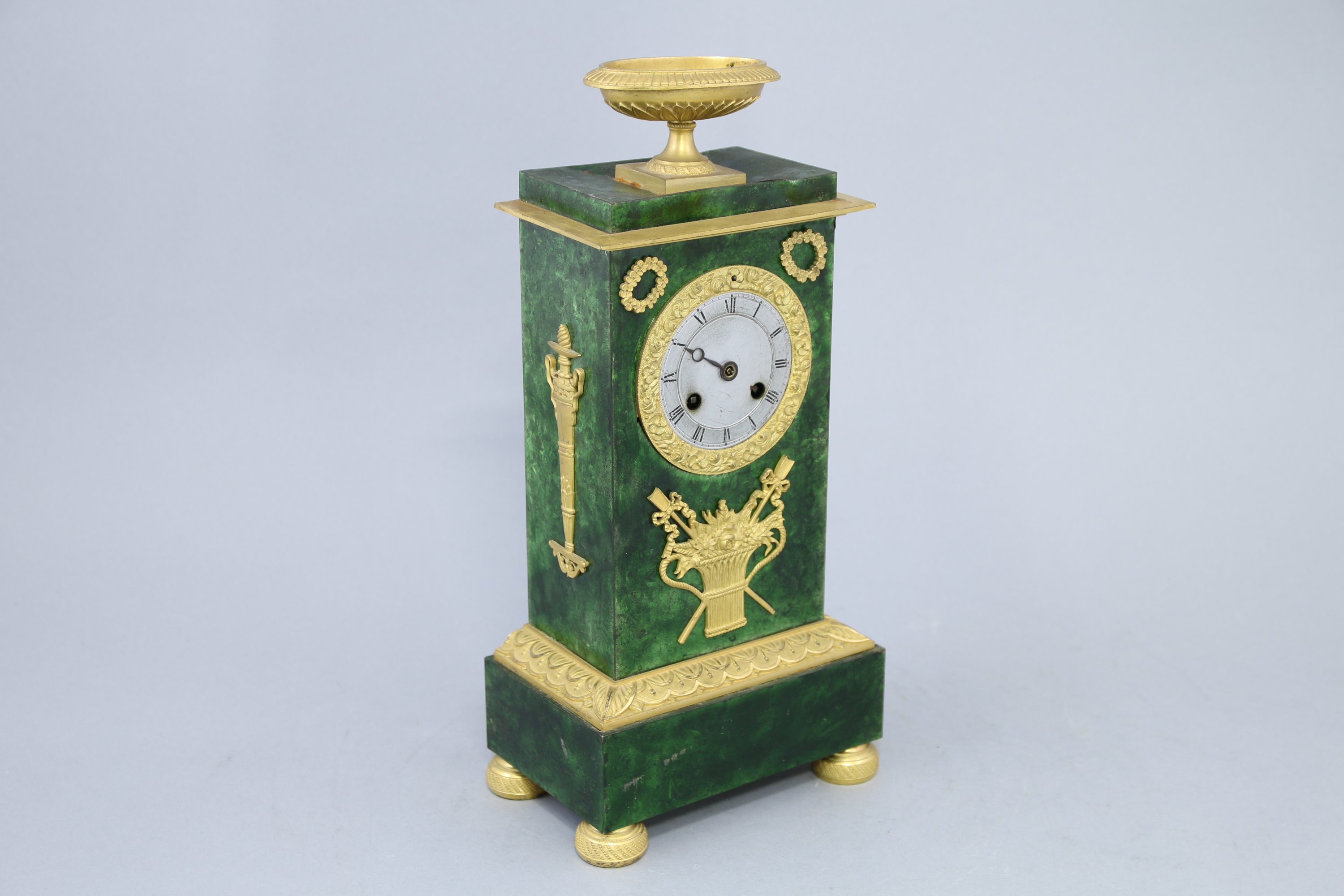 Le cadran indique les heures en chiffres romains. Il est surmonté d'un vase godronné et entourné de bas-reliefs aux couronnes de laurier et bouquets. Quatre pieds patins.