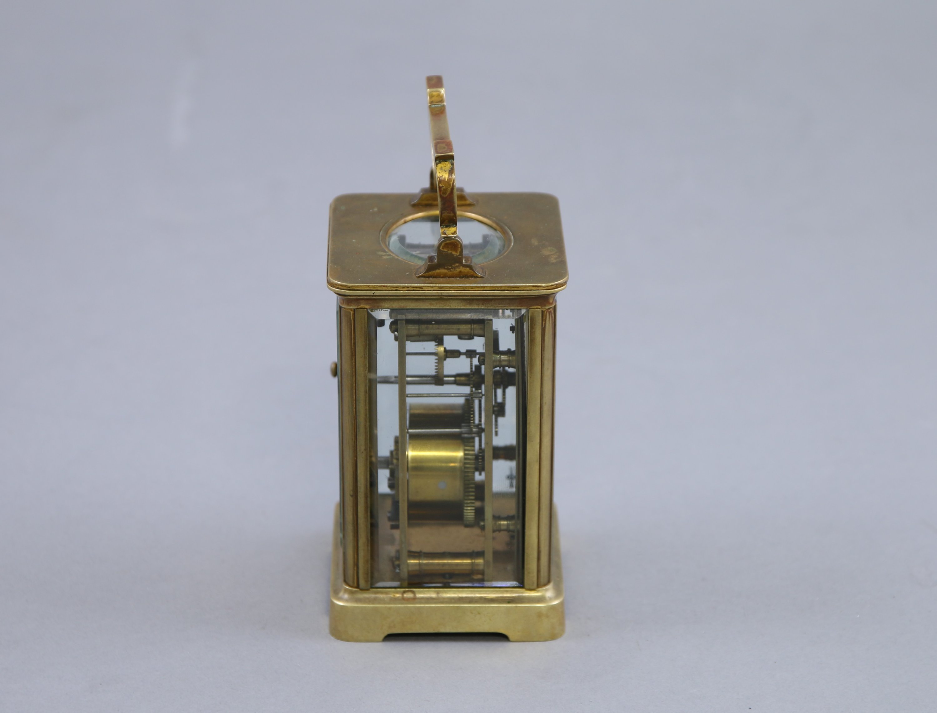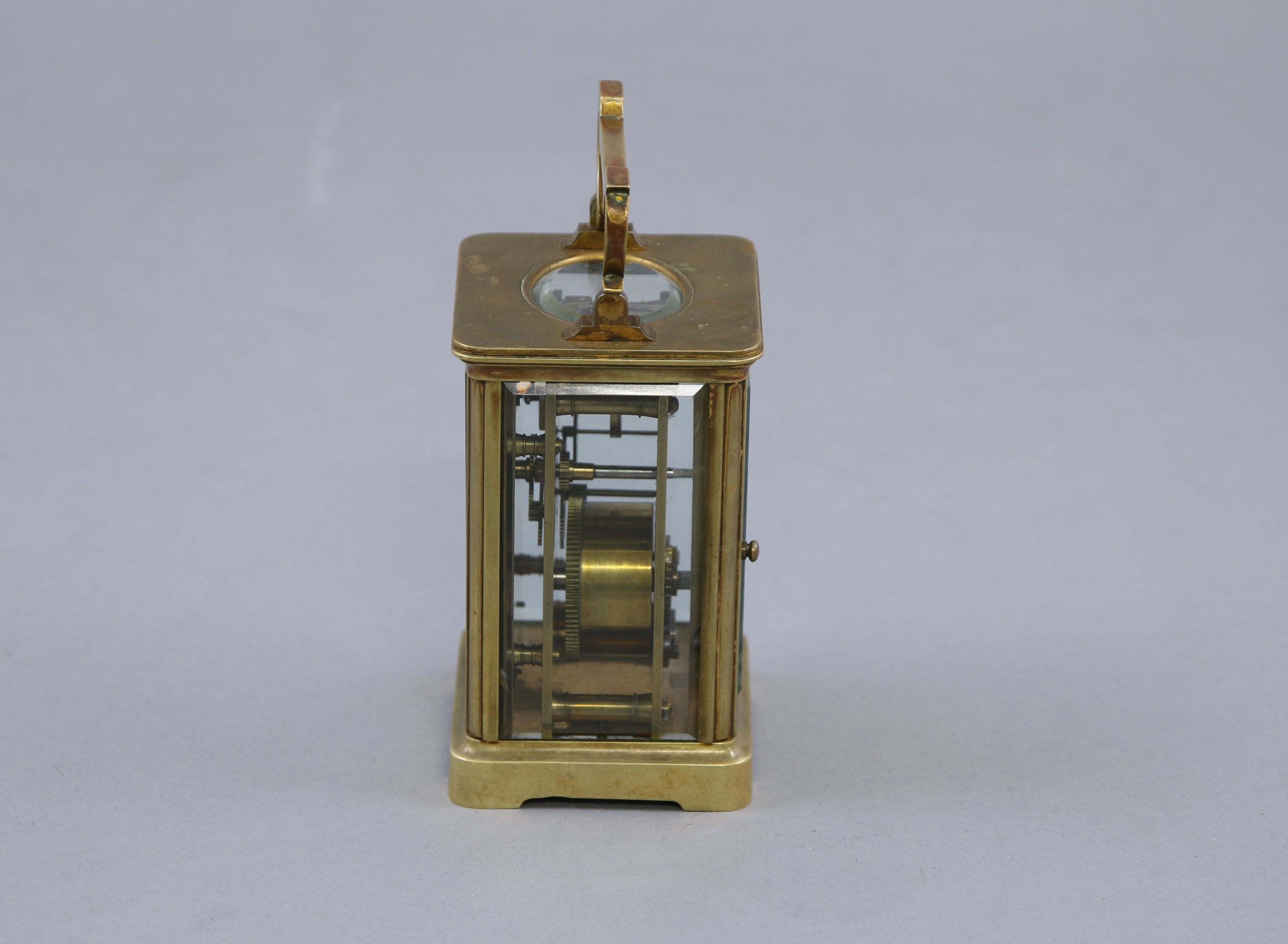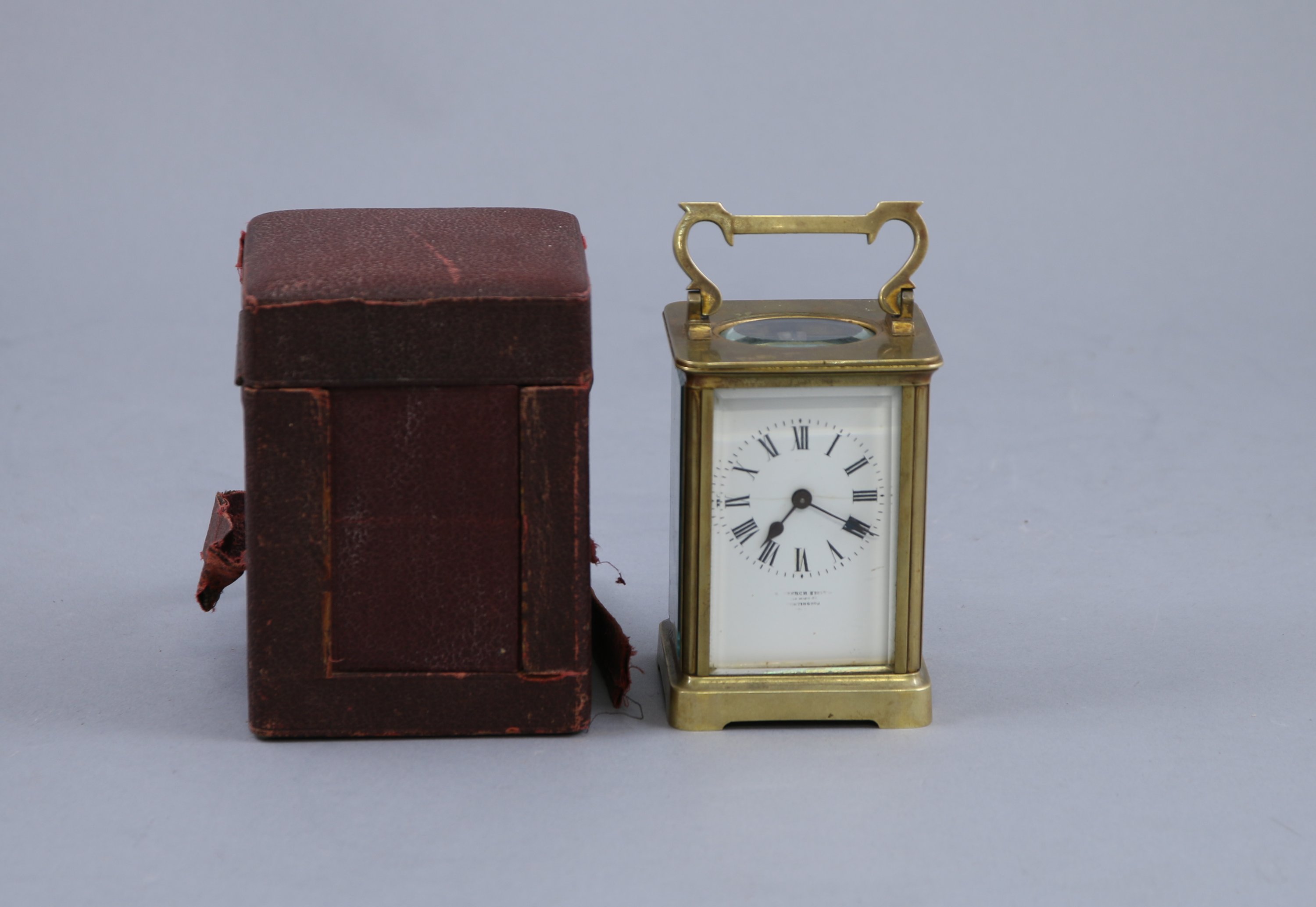 De forme cage à verre biseauté, il présente un cadran blanc indiquant les heures par des chiffres romains. Une poignée mobile.