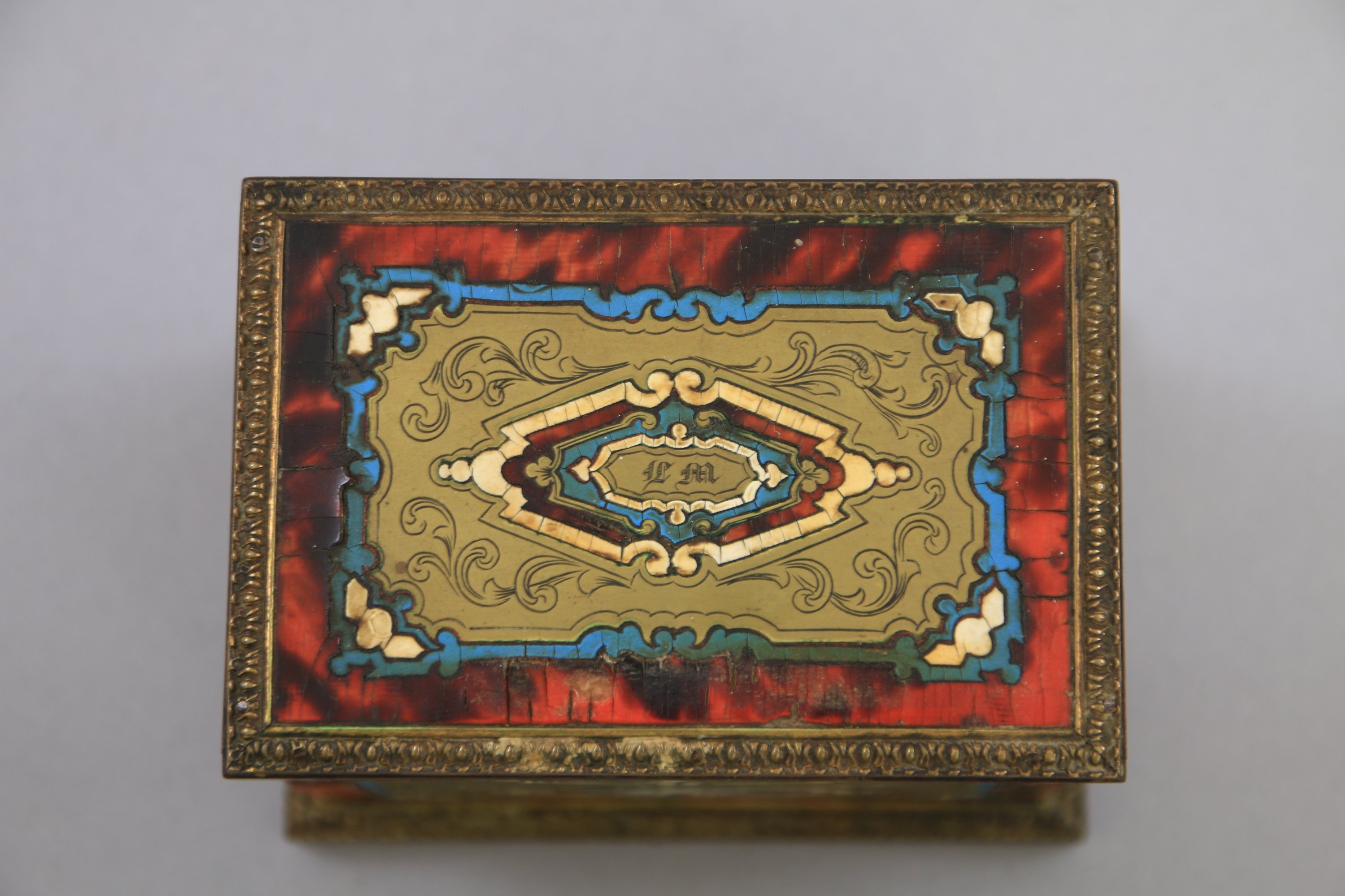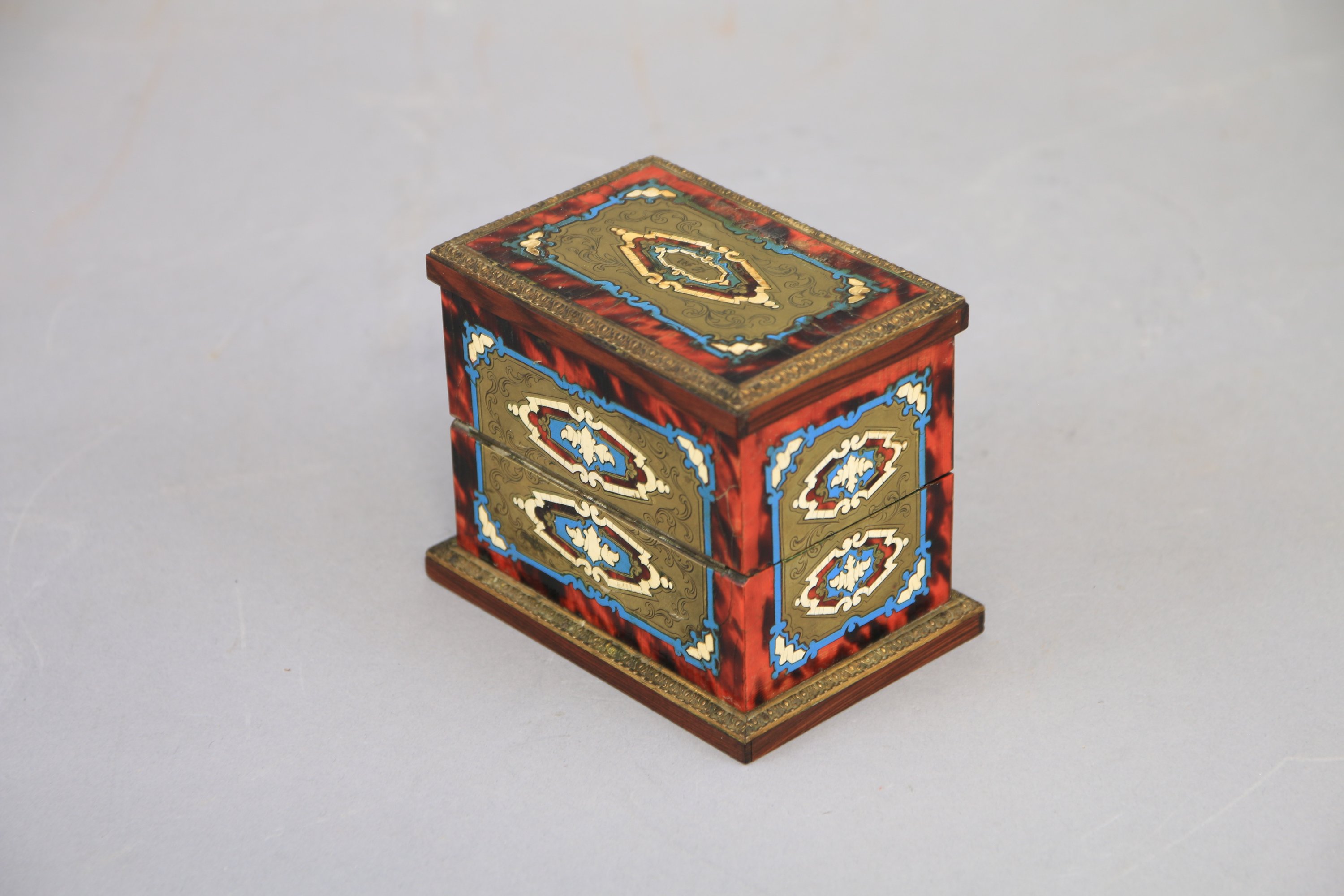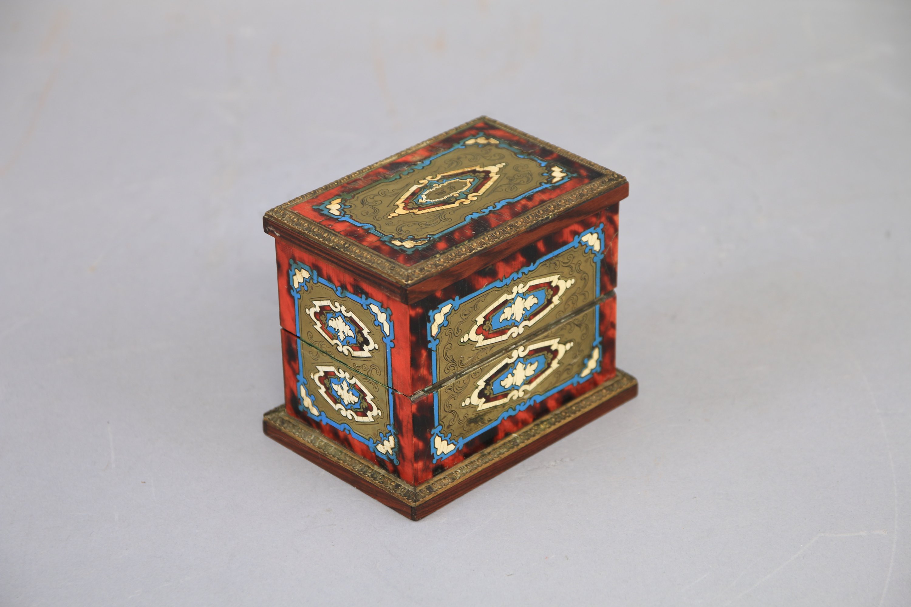 Marqueterie dite Boulle d’écaille rouge et de laiton, et filets peints en blanc et bleu.