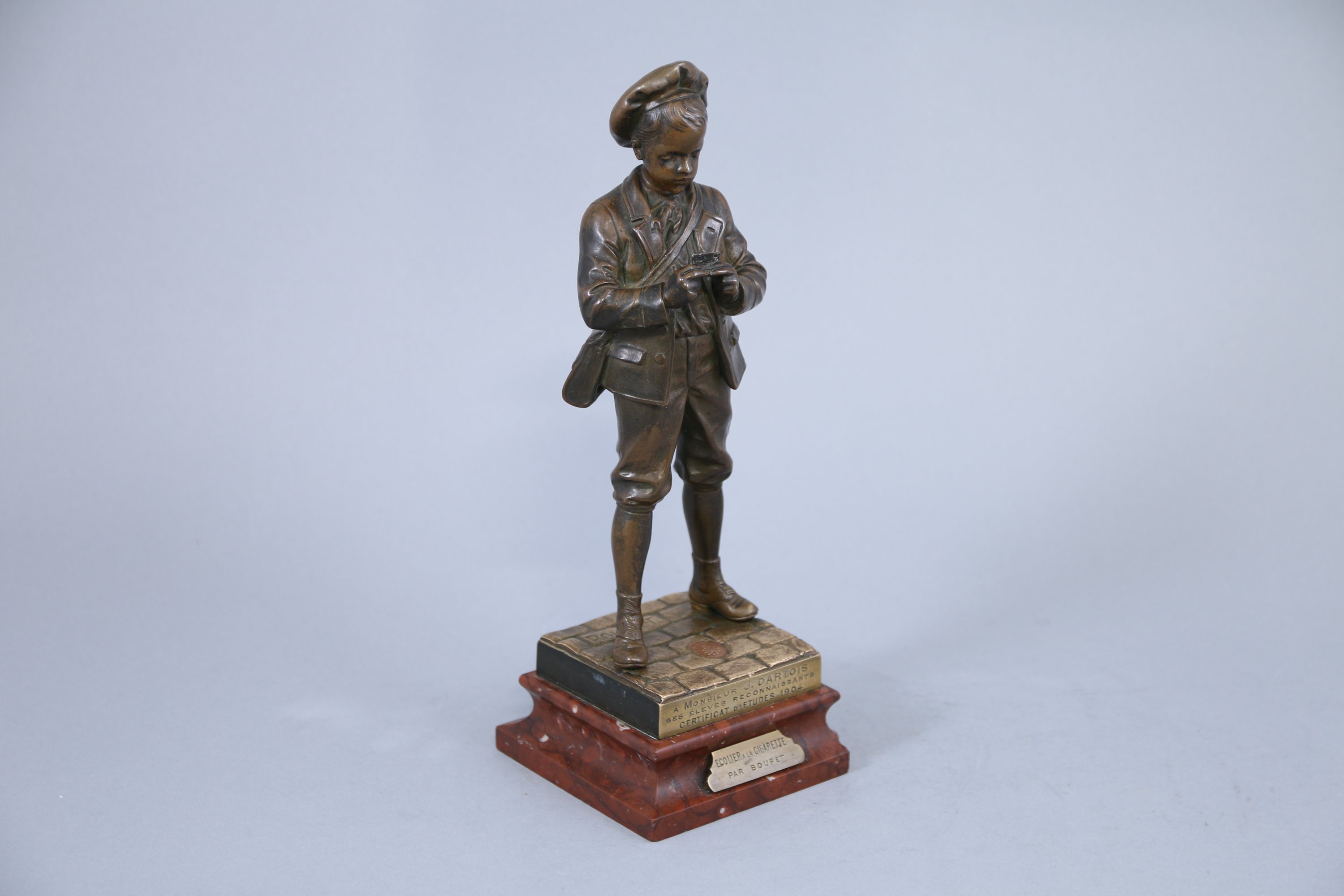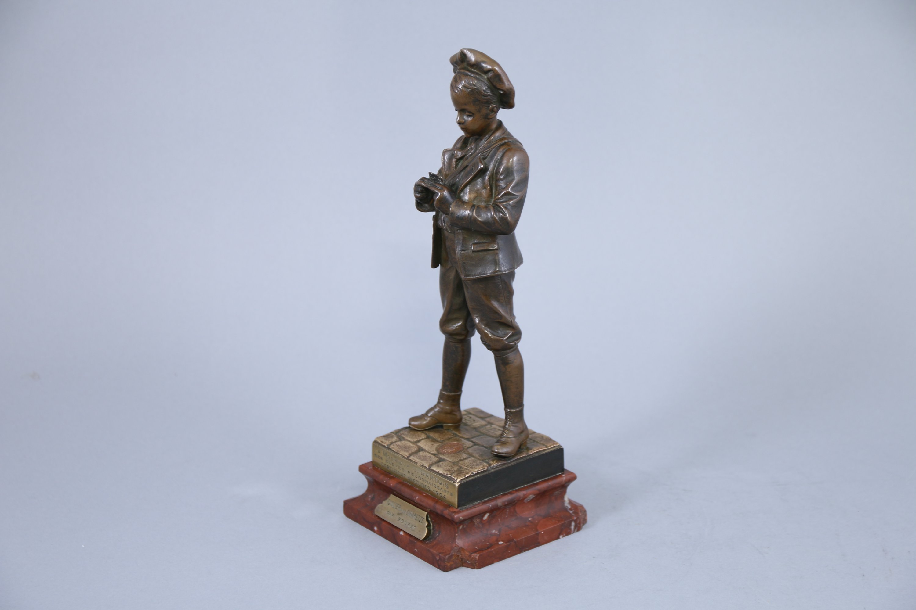 Signé. Cachet de fondeur : "bronze garanti au titre". La base marquée : "à Monsieur J. Dartois ses élèves reconnaissants Certificat d'Etudes 1904".