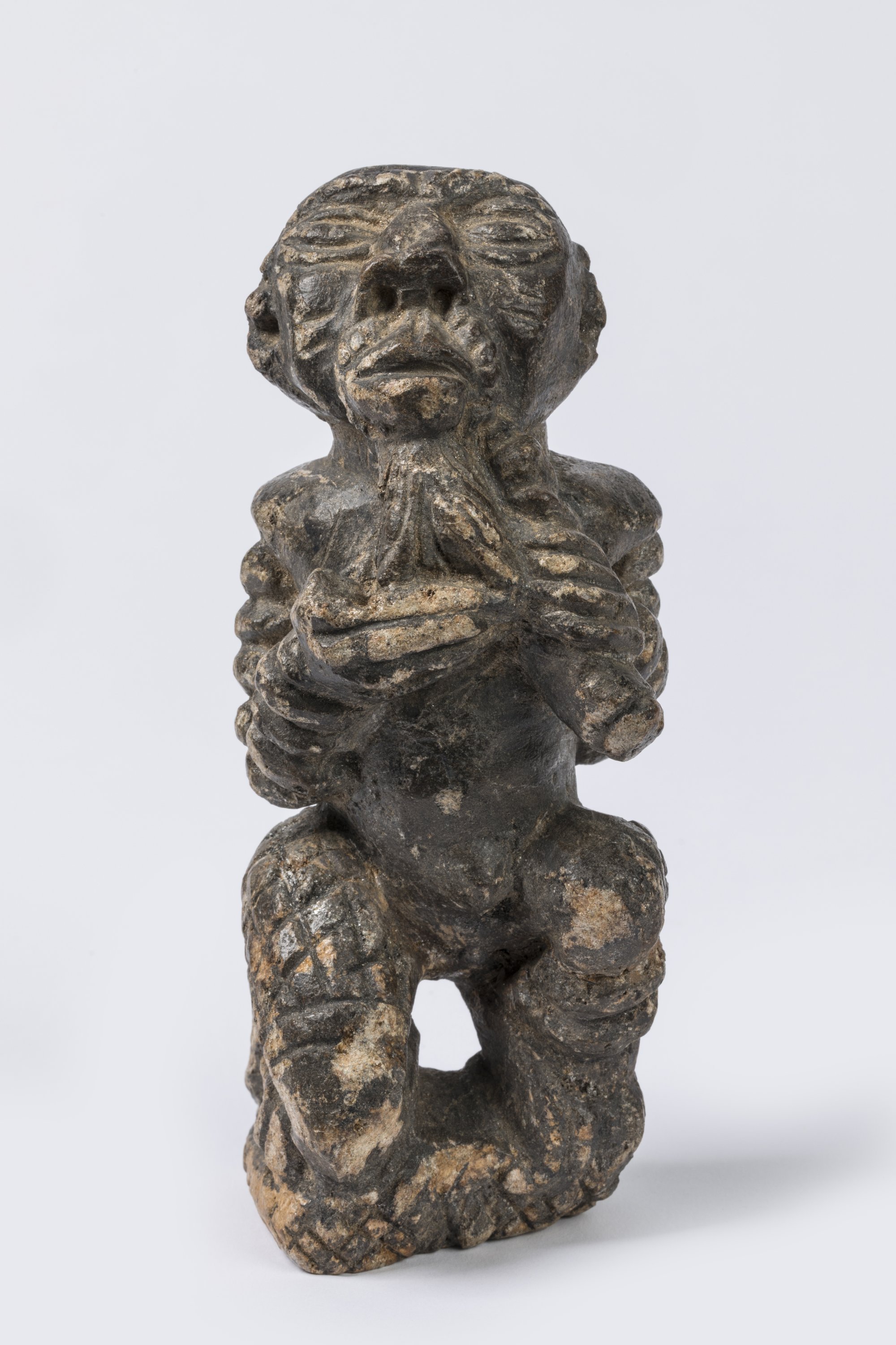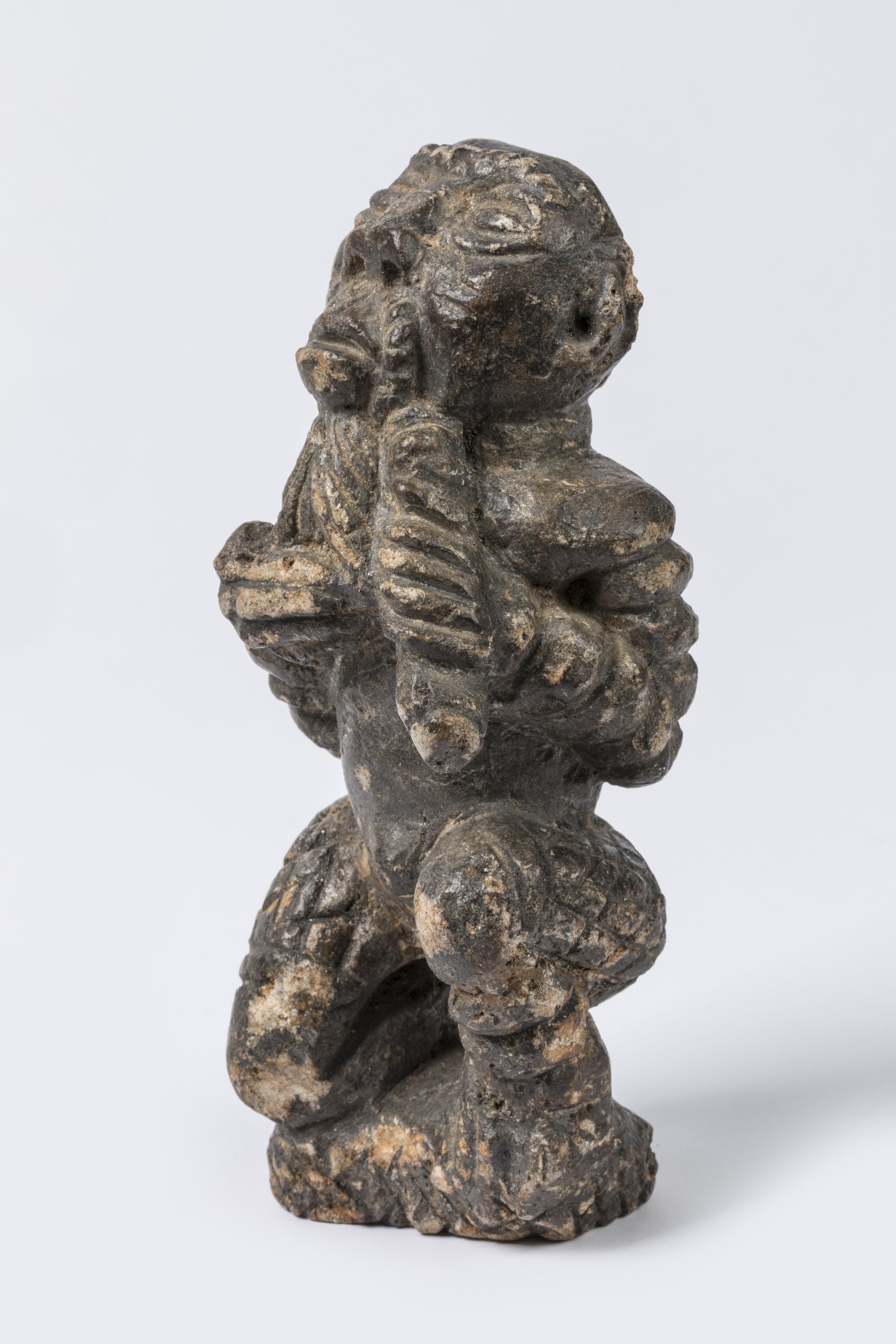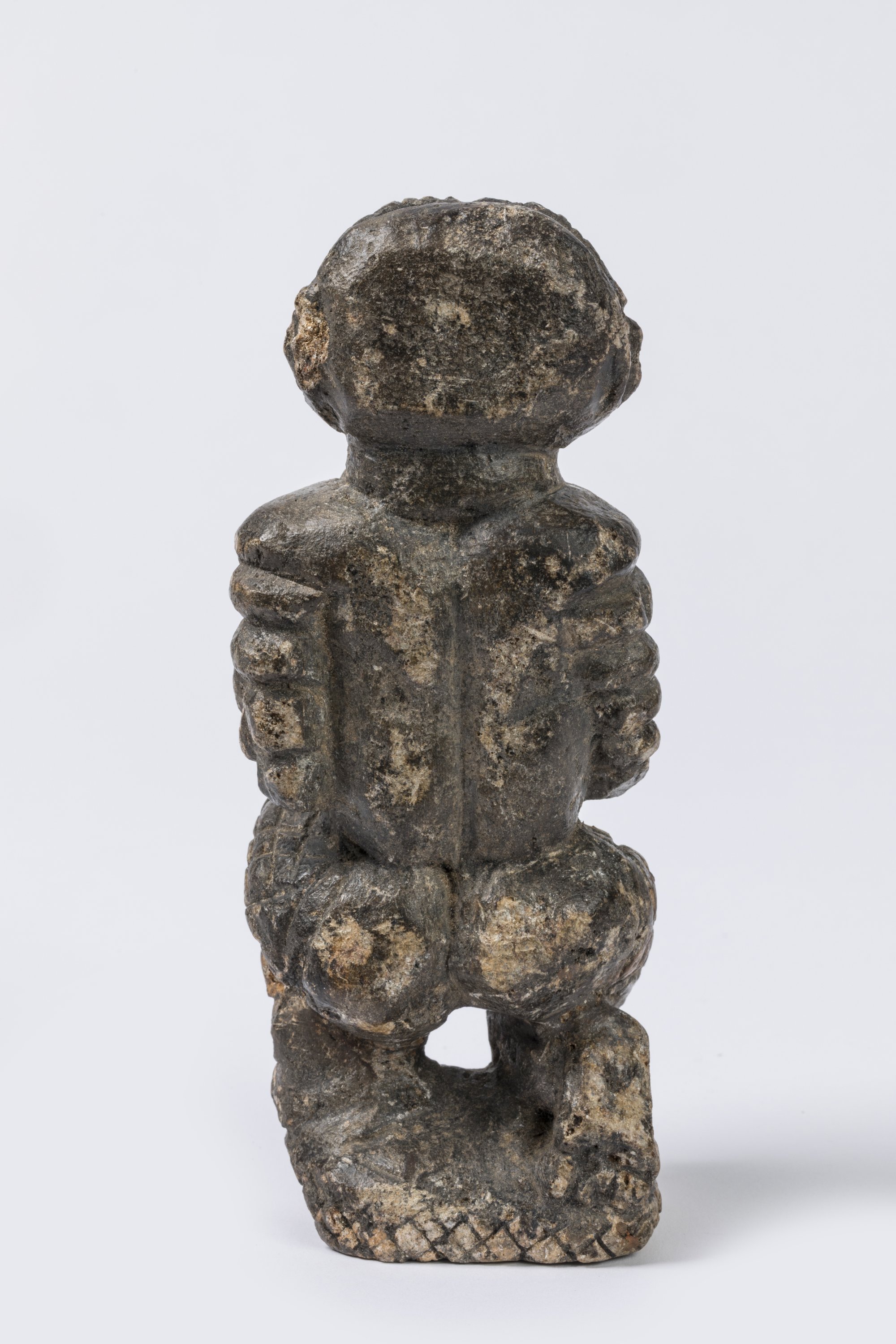 Pierre tendre sculptée, patine d'usage grisâtre.
