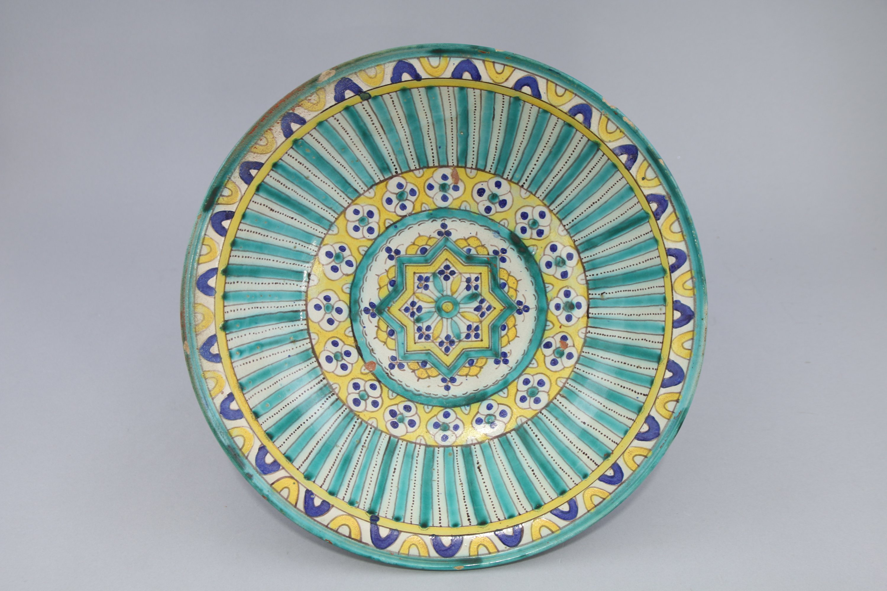 Faïence à décor polychrome, d’une rosace à huit pointes dite sceau de Salomon et d’un motif type « mille pattes » sur les parois.