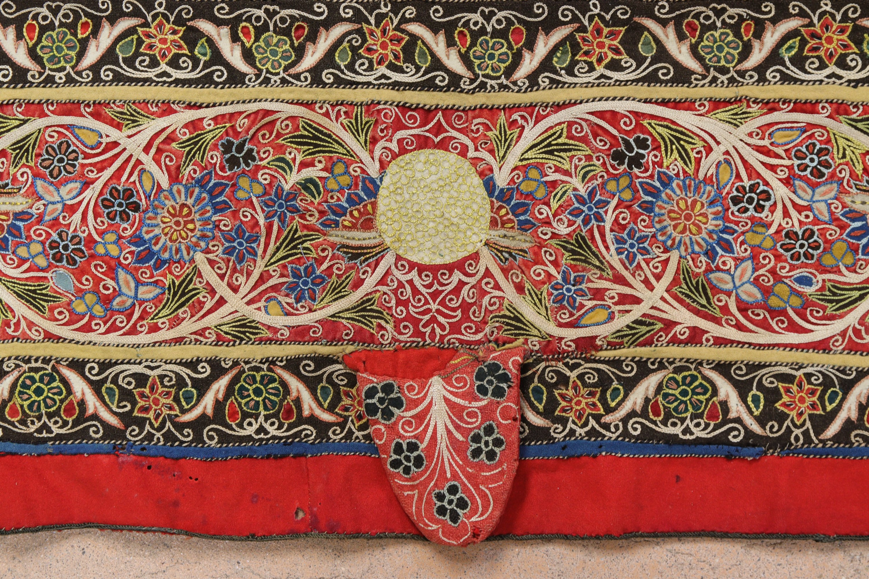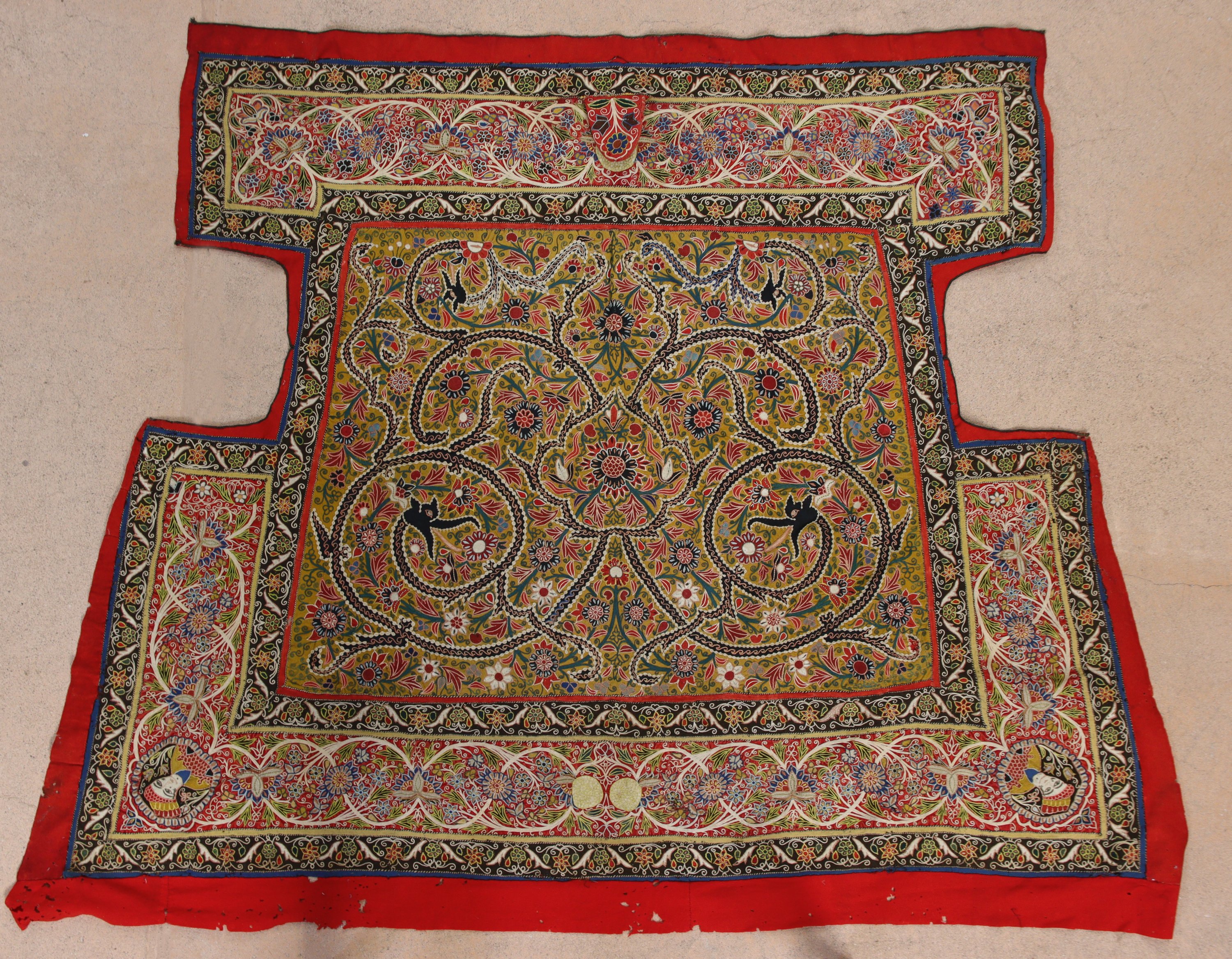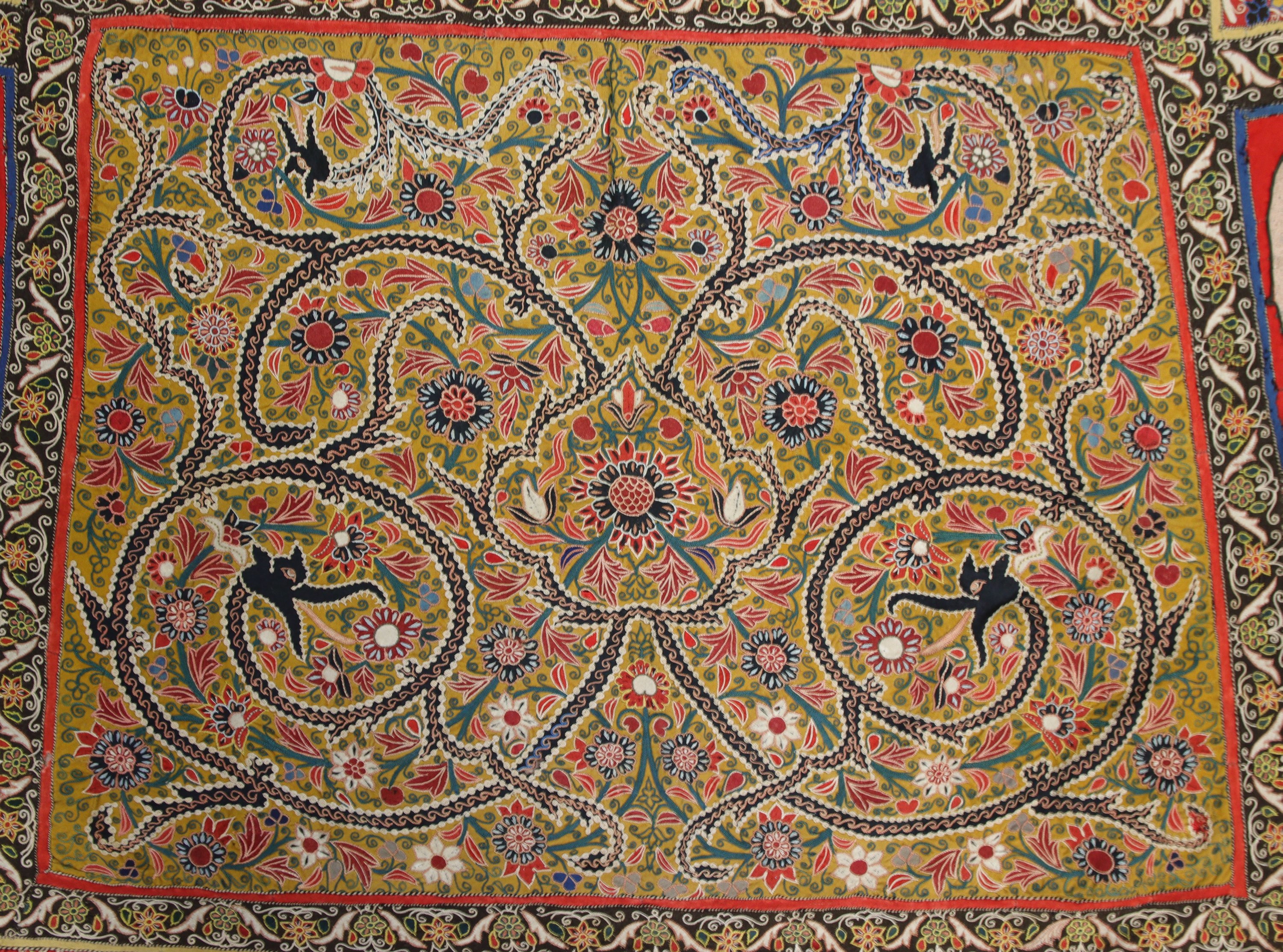 Taffetas jaune densément brodé de rinceaux fleuris, bordure rouge de rinceaux de fleurs, personnages aux écoinçons, entre des galons noirs.