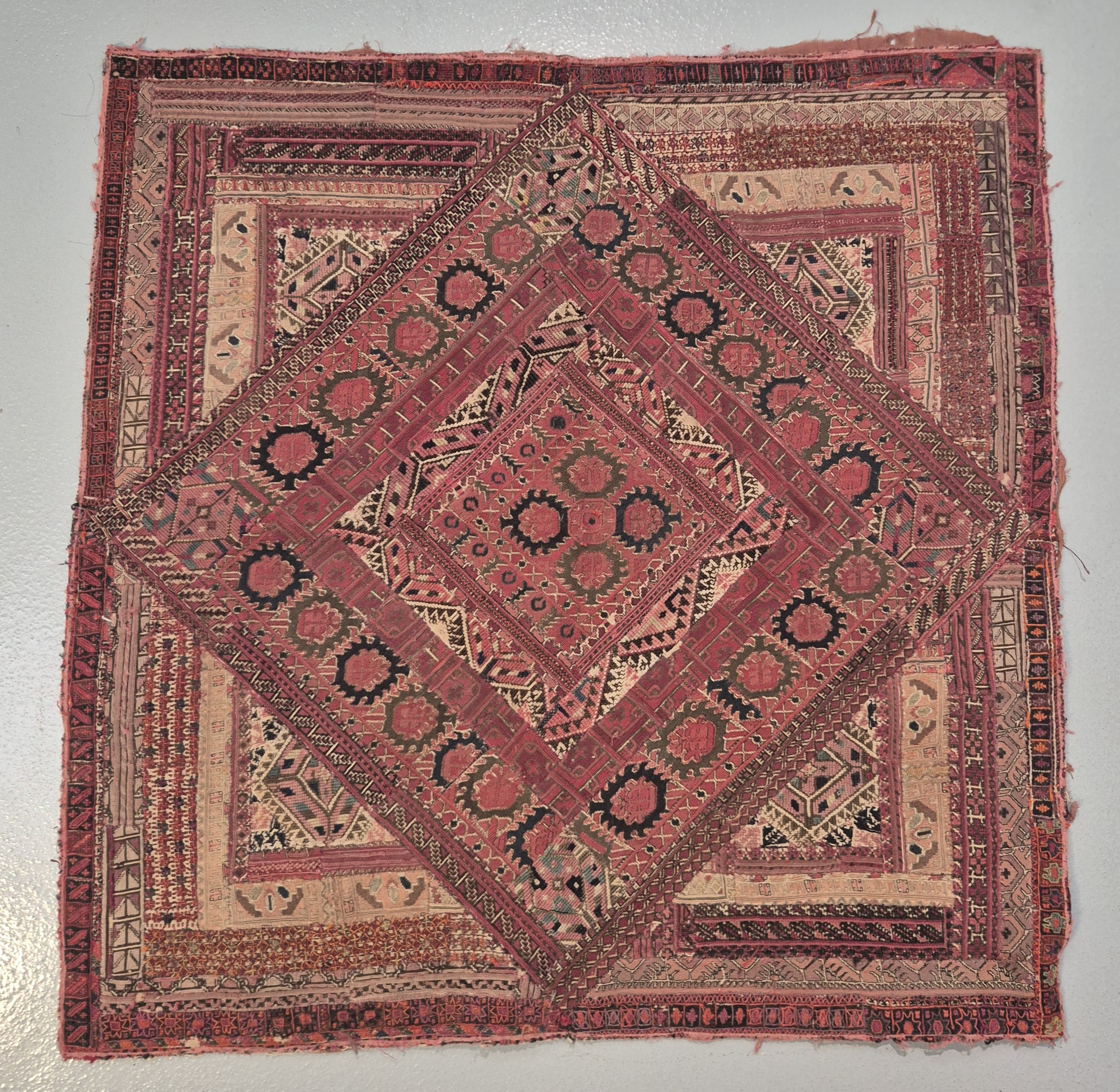 En laine et soie, fleurs stylisées dans des carrés concentriques formant carrés et losanges inscrits les uns dans les autres.